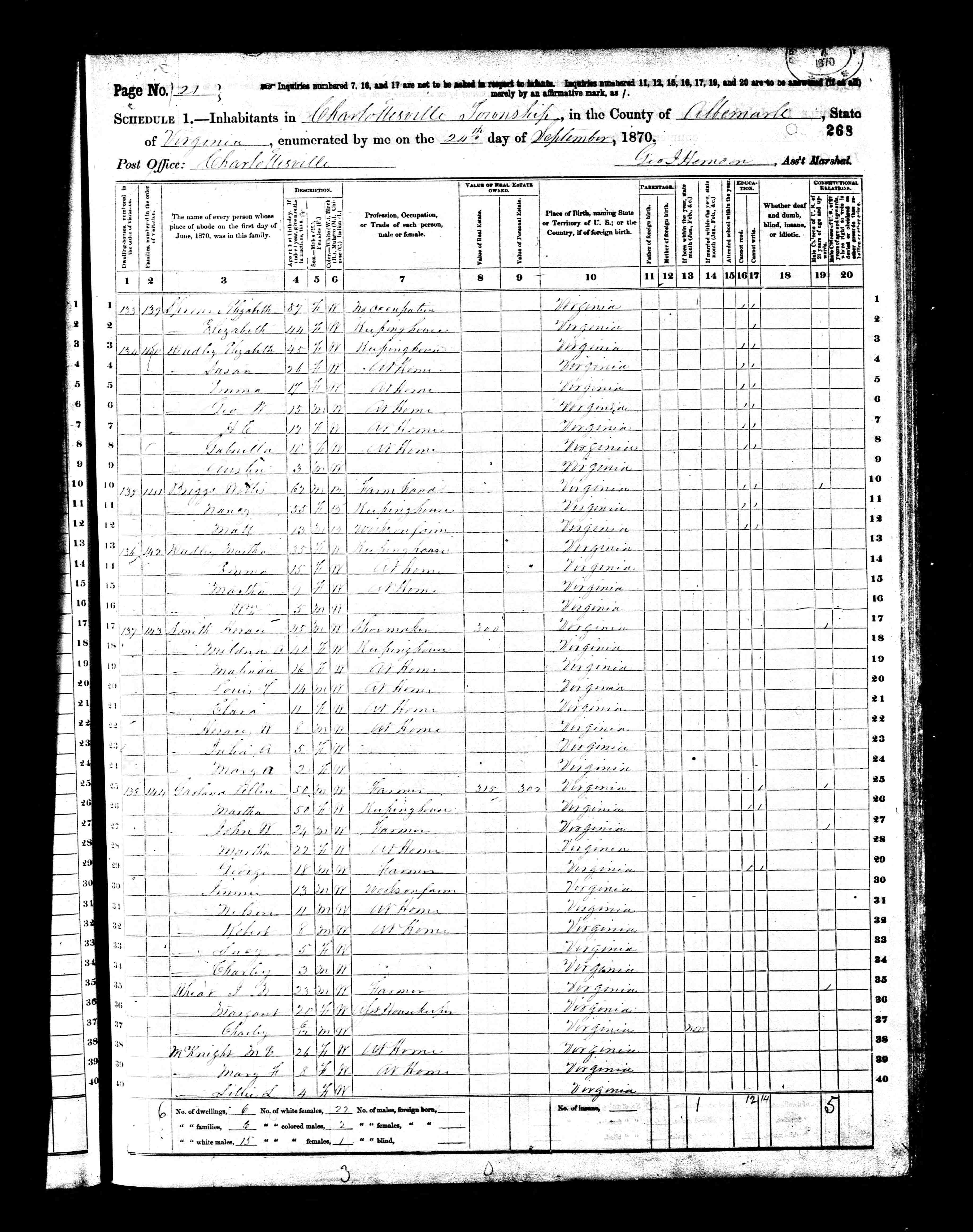 8. Census: Elizabeth and Elizabeth Sprouse, 24 Sep 1870, Charlottesville, Albemarle County, Virginia, USA. 42
