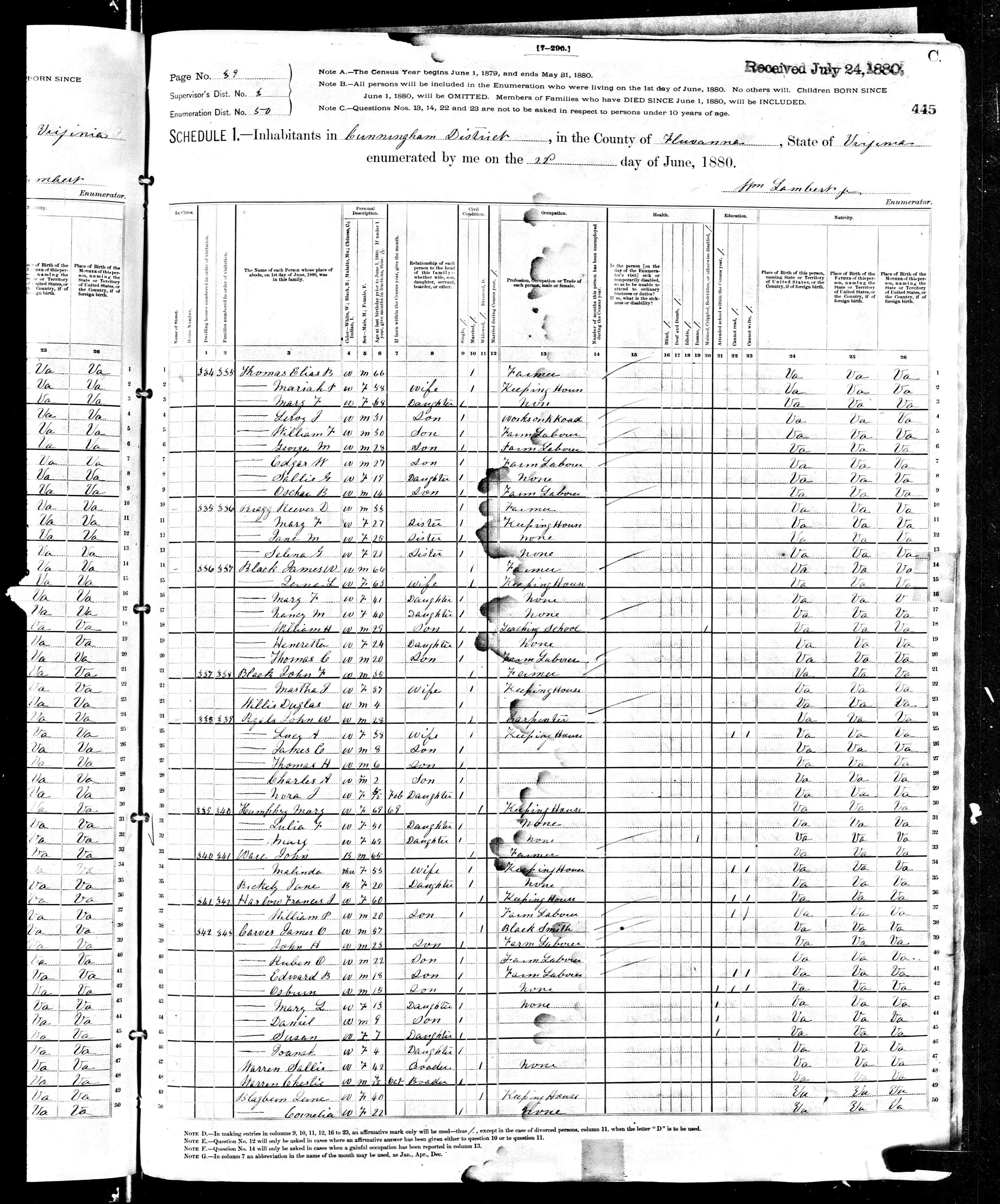5. Census: James O. Carver and family, 22 Jun 1880, Cunningham, Fluvanna County, Virginia, USA. 64