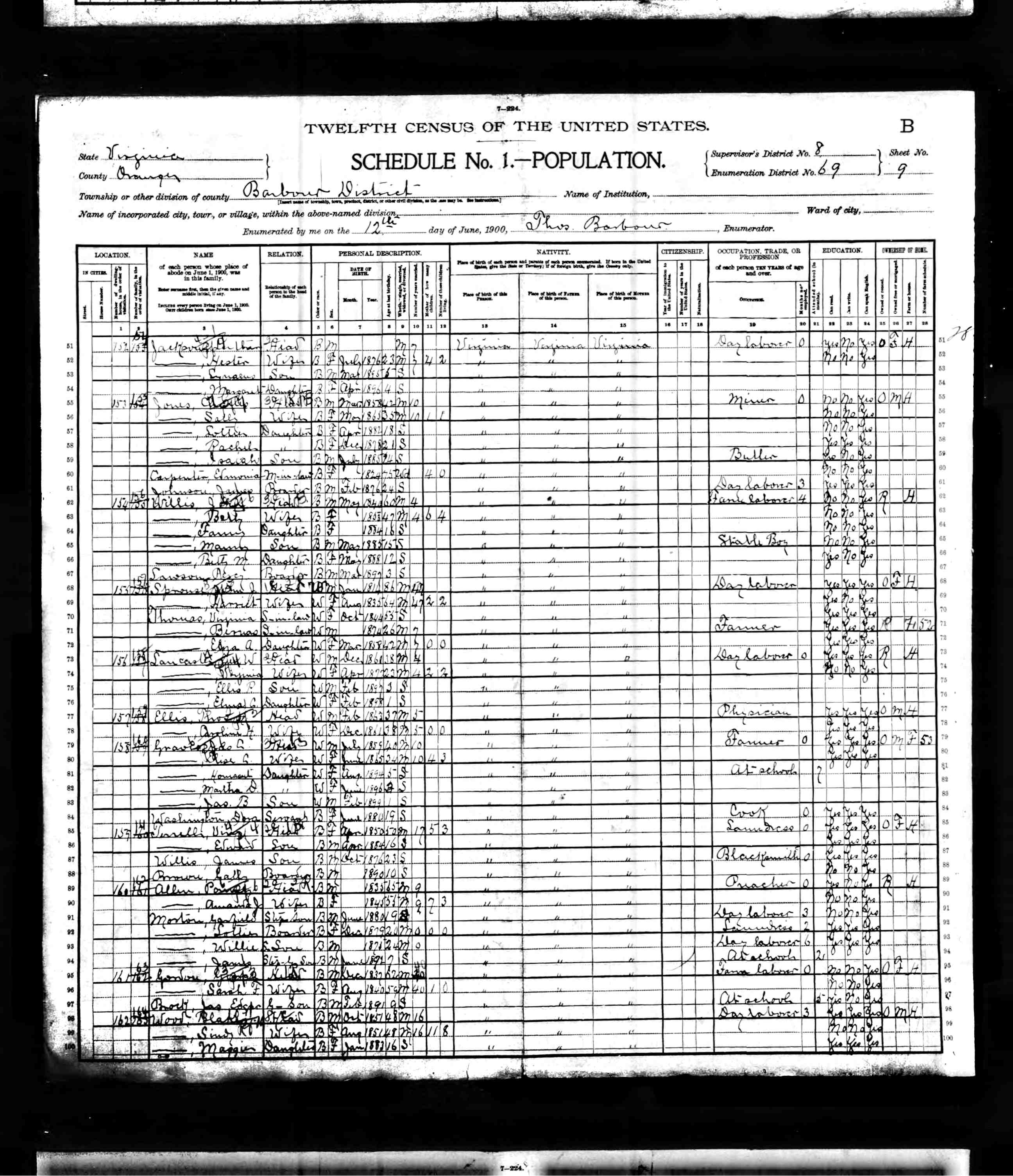 9. Census: Cornelius F. Carver and family, 21 Jun 1880, James River District, Buckingham County, Virginia, USA. 69