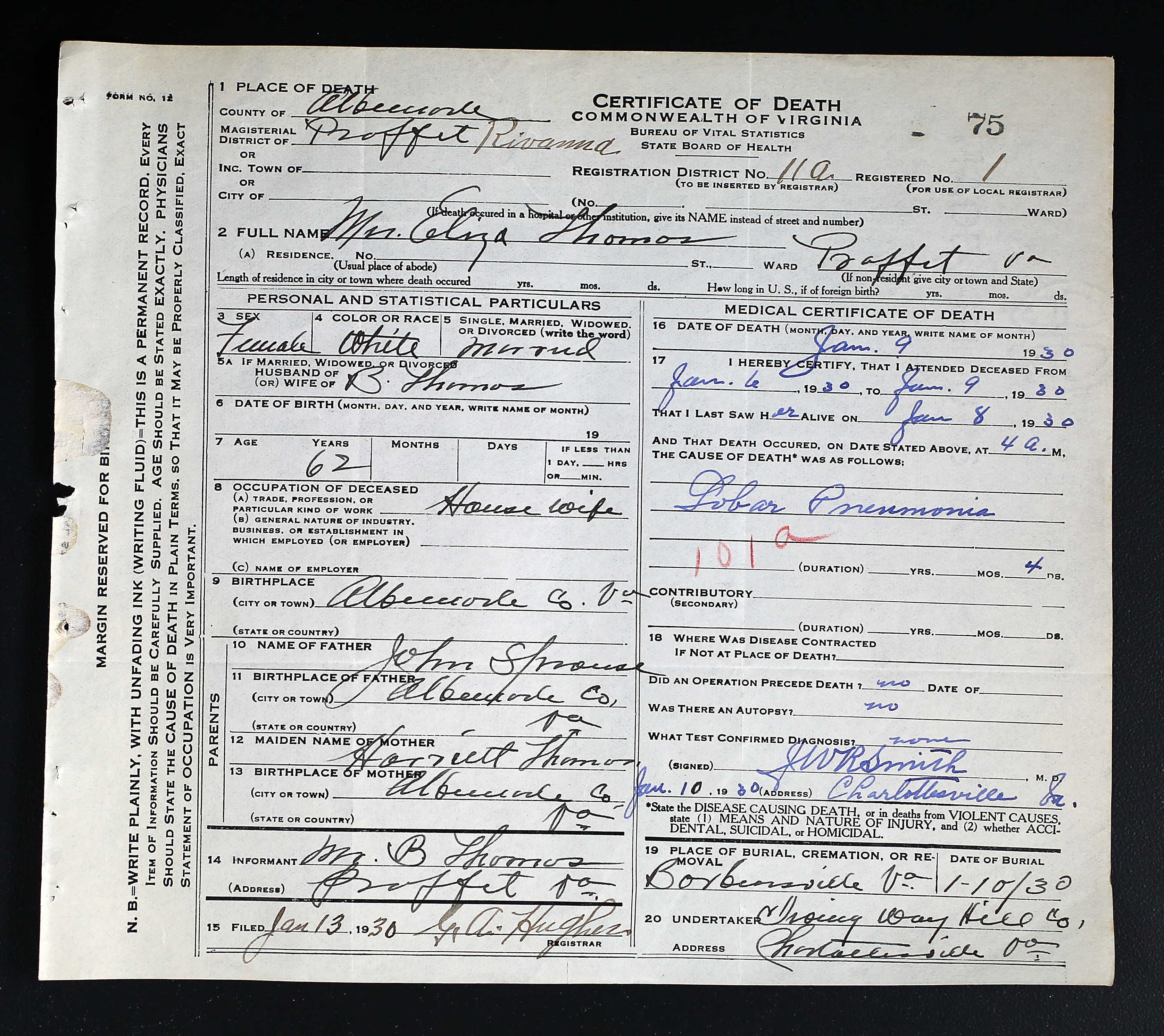 "This Certificate was brought to me by Dr. Macon on Jan. 21, 1929. This is all the information he could get. He said she was buried by her neighbors & friends.
