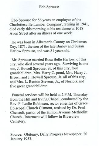 Ebb Sprouse for 56 years an employee of the Charlottesville Lumber Company, retiring in 1941, died early this morning at his residence at 1018 Avon Street after an illness of one week.