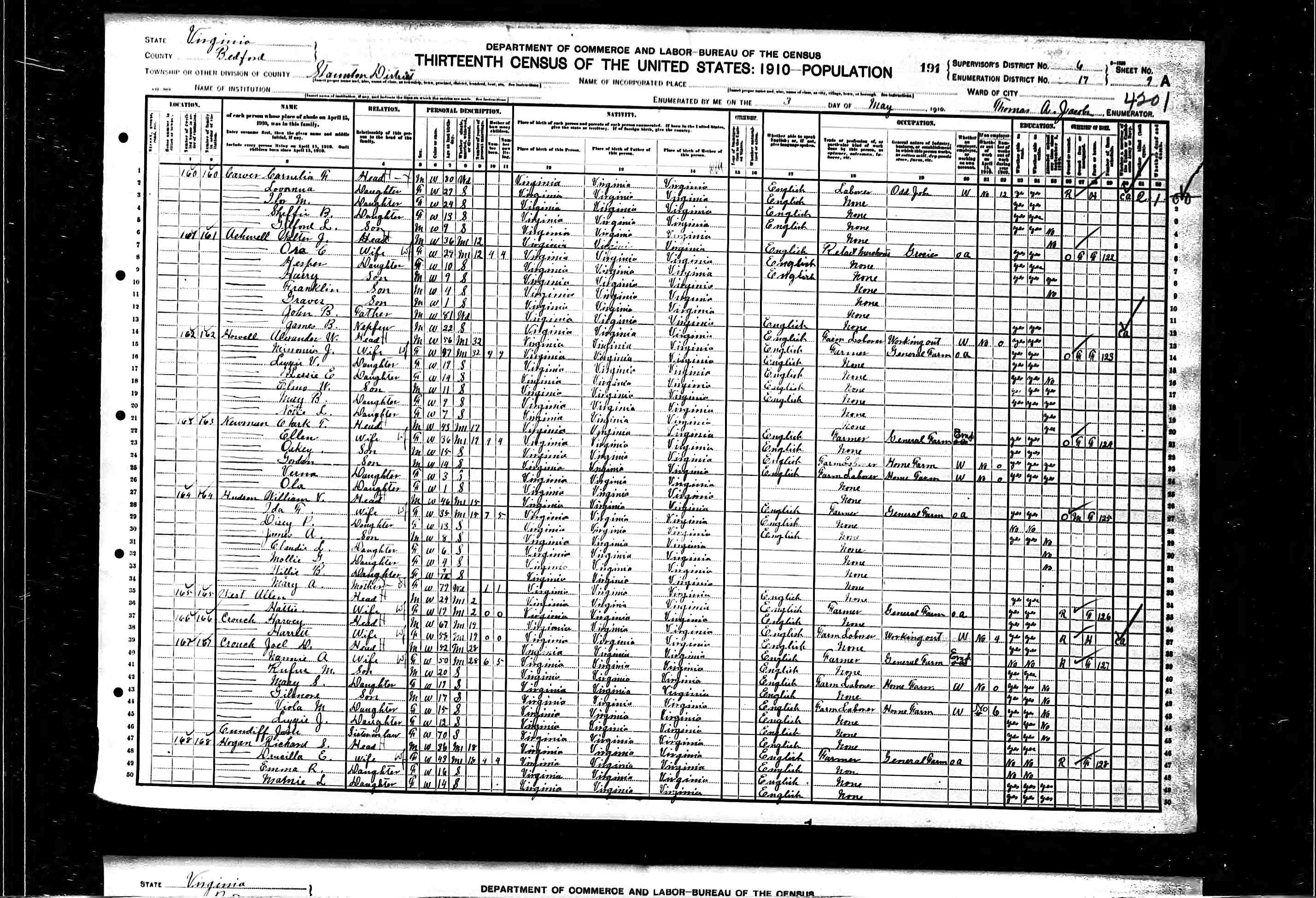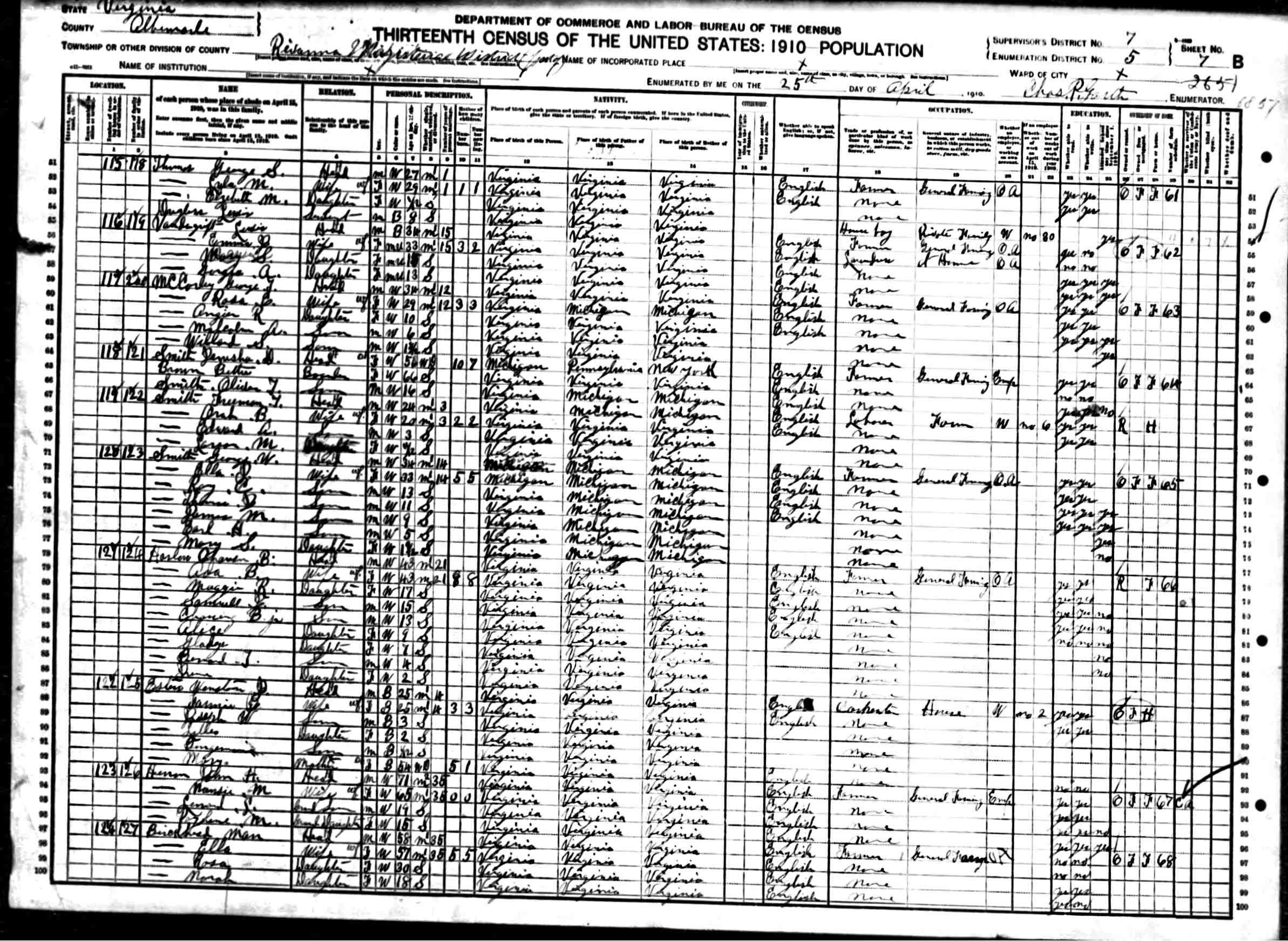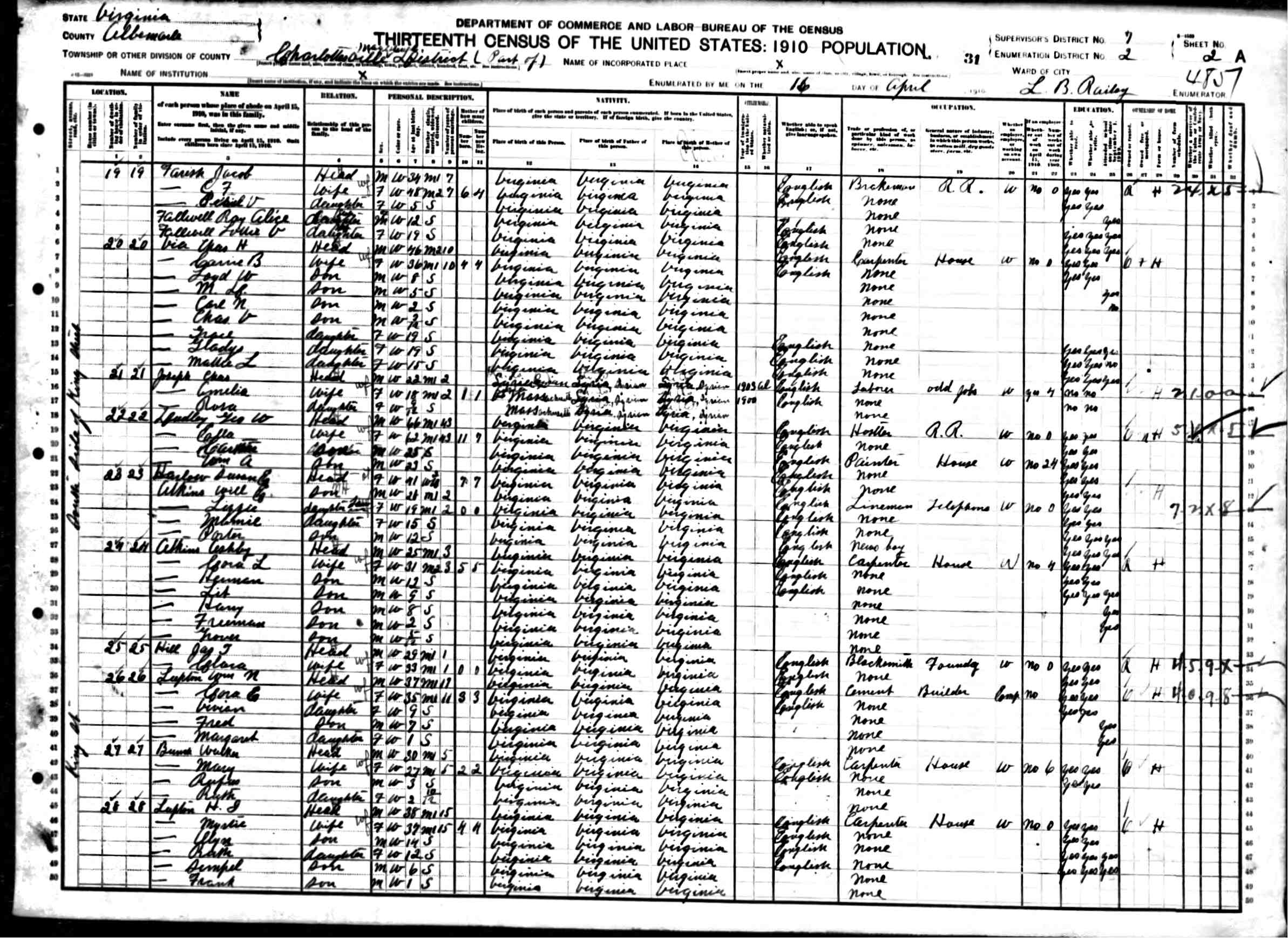 2. Census: Linwood Carver and family, 23 Apr 1910, Charlottesville, Albemarle County, Virginia, USA. 211