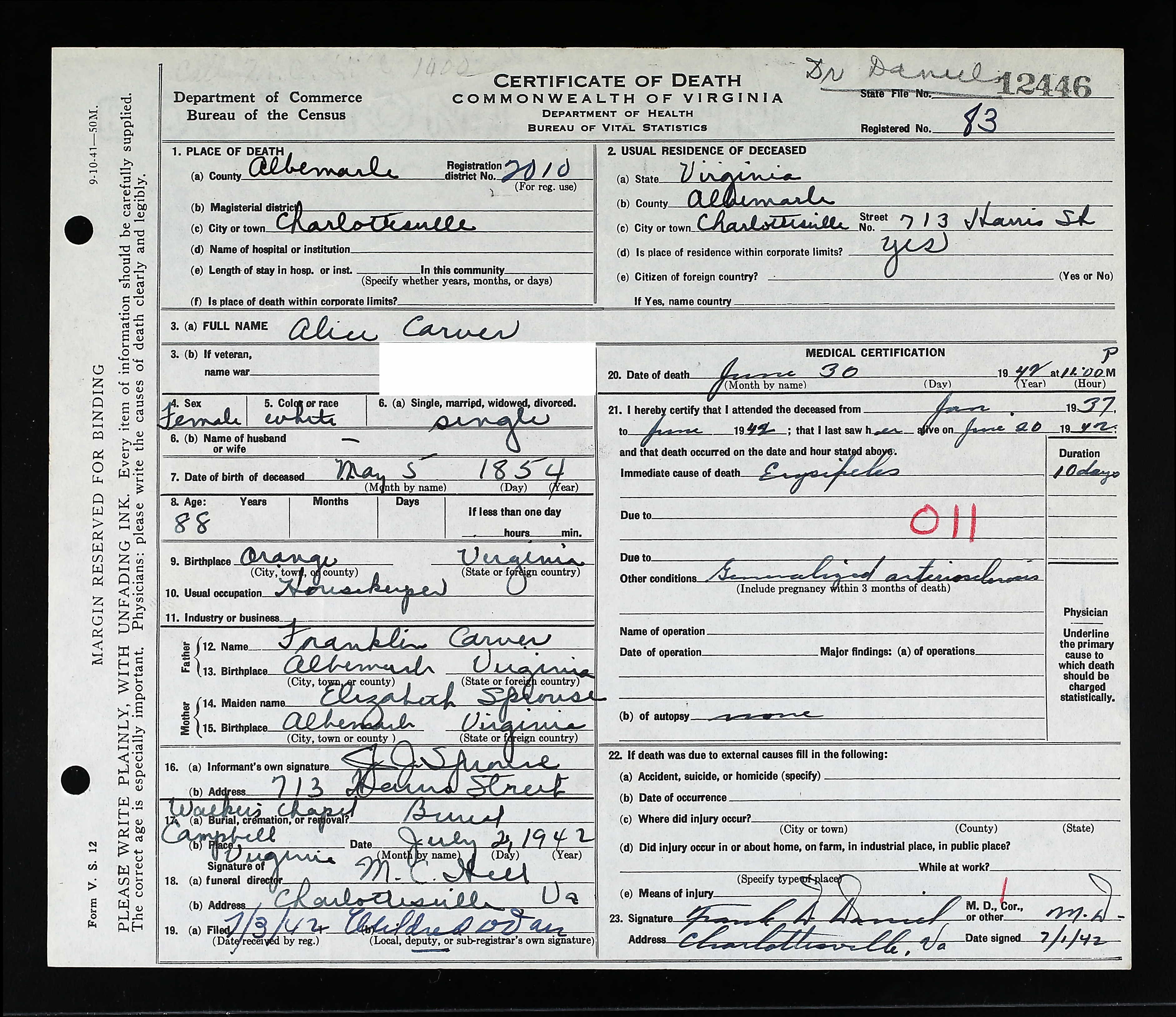 3. Census: Florence J. Carver and family, 30 Apr 1940, Charlottesville, Charlottesville (city), Virginia, USA. 529
