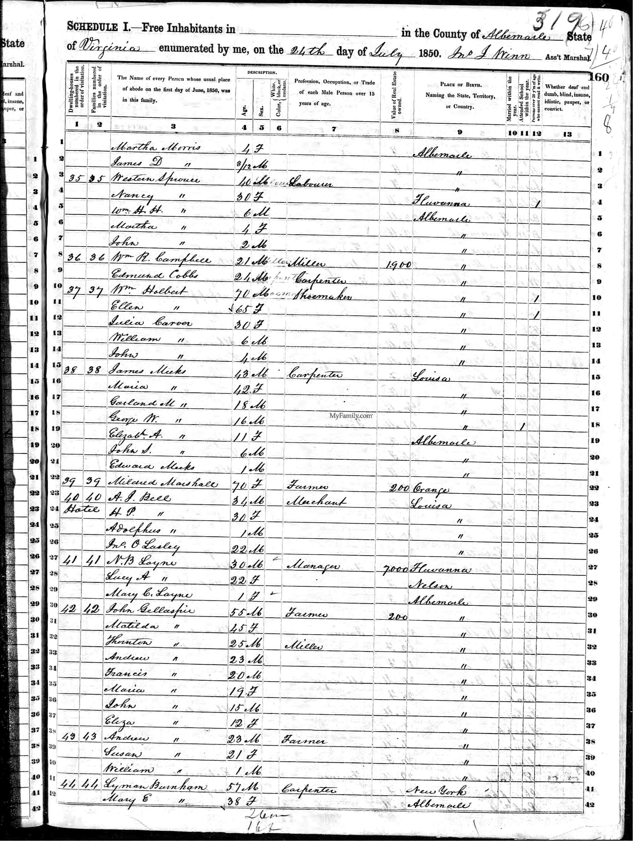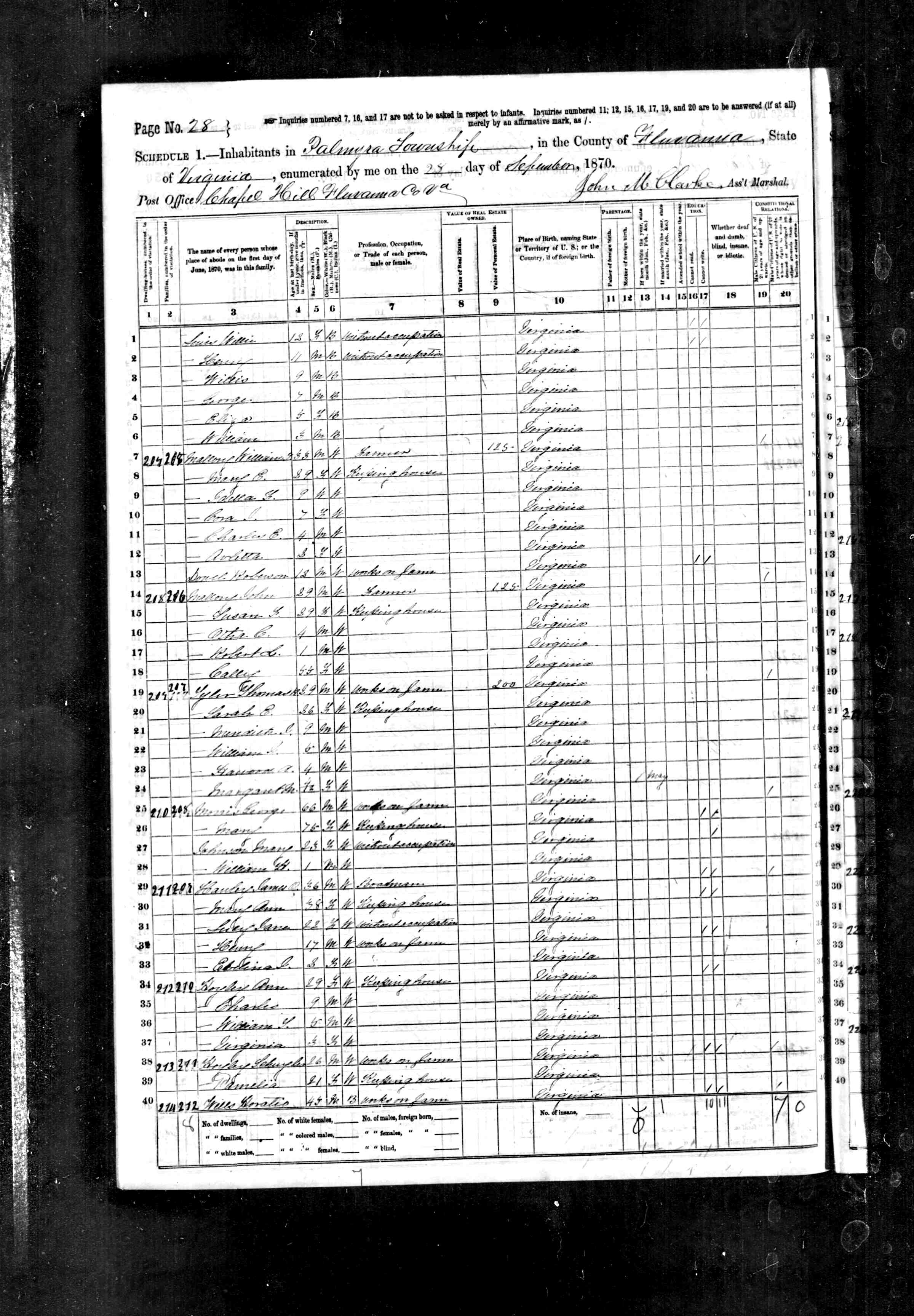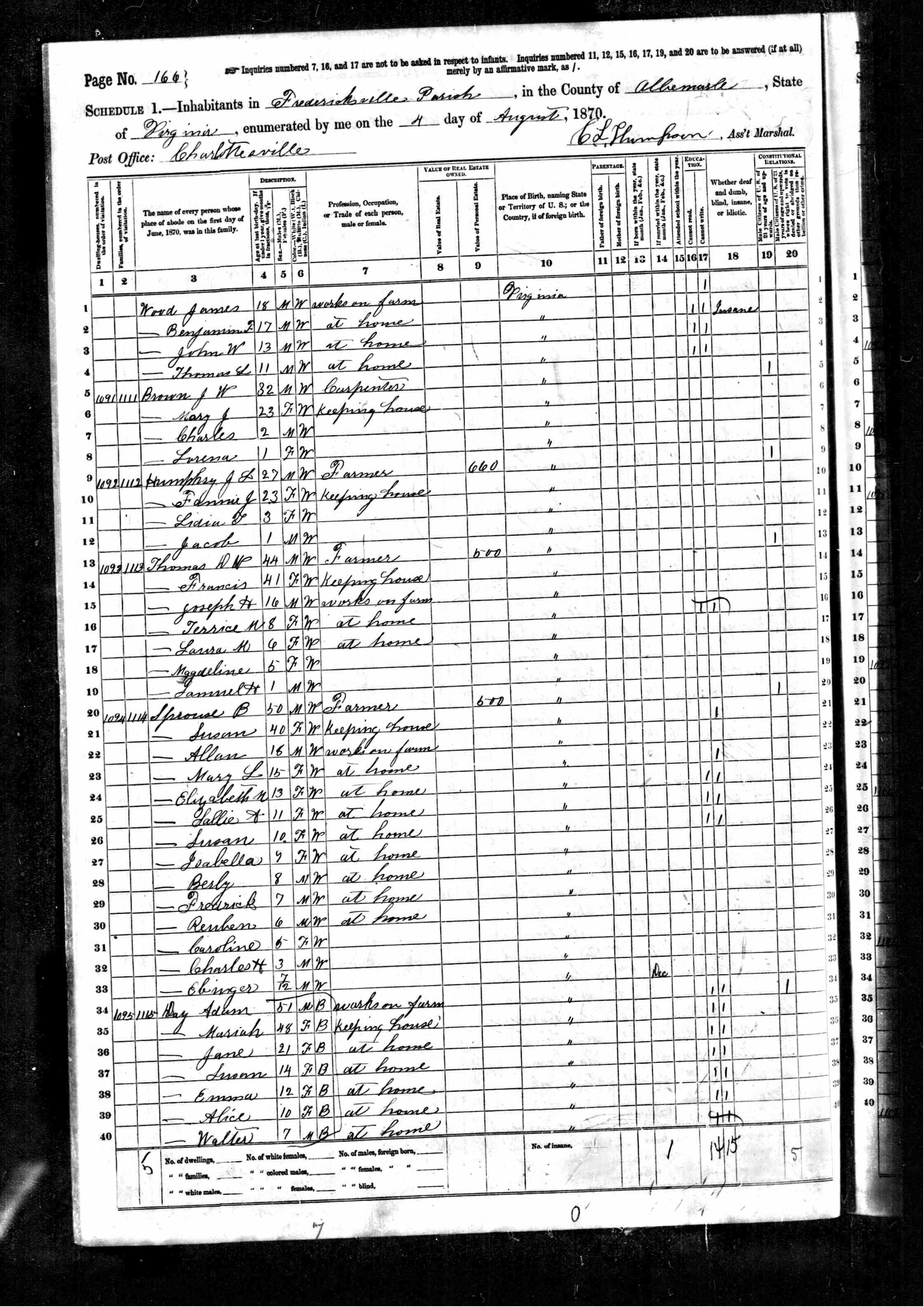 1. Census: James H. Sprouse and family, 13 Jul 1870, Fredericksville Parish, Albemarle County, Virginia, USA. 221