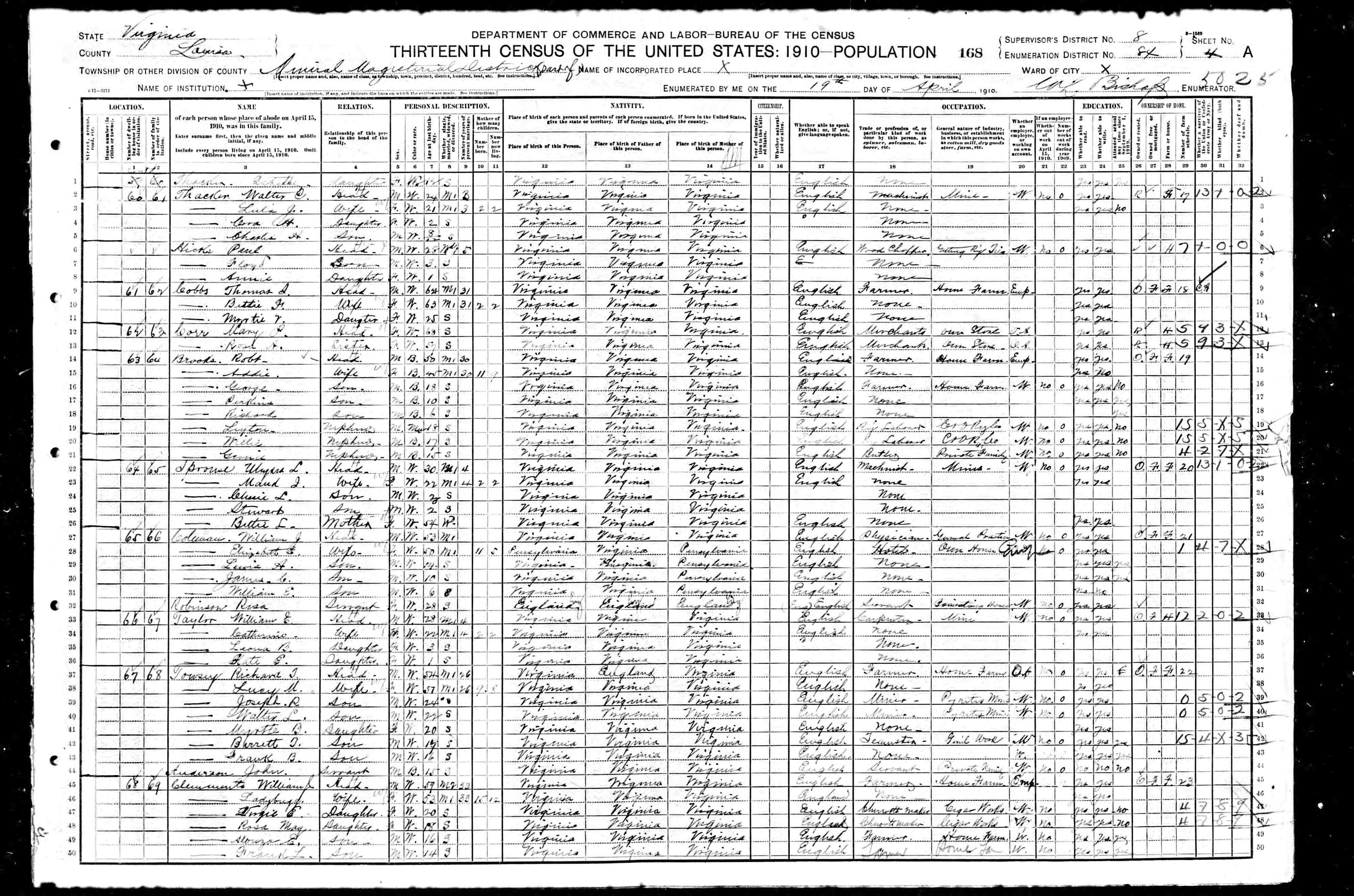 5. Occupation: 1910 Census General Farmer, 22 Apr 1910, Mineral, Louisa County, Virginia, USA. 545