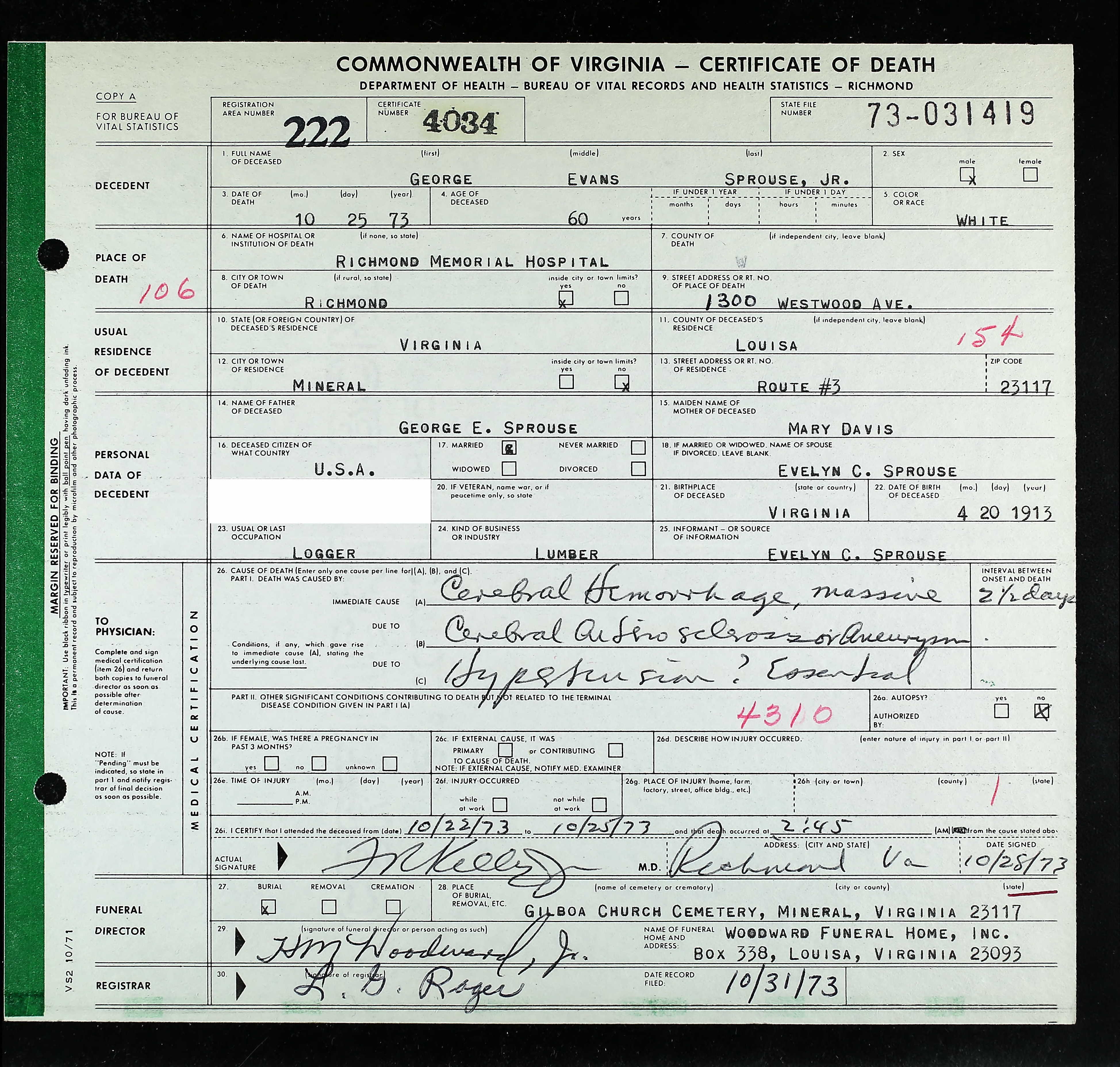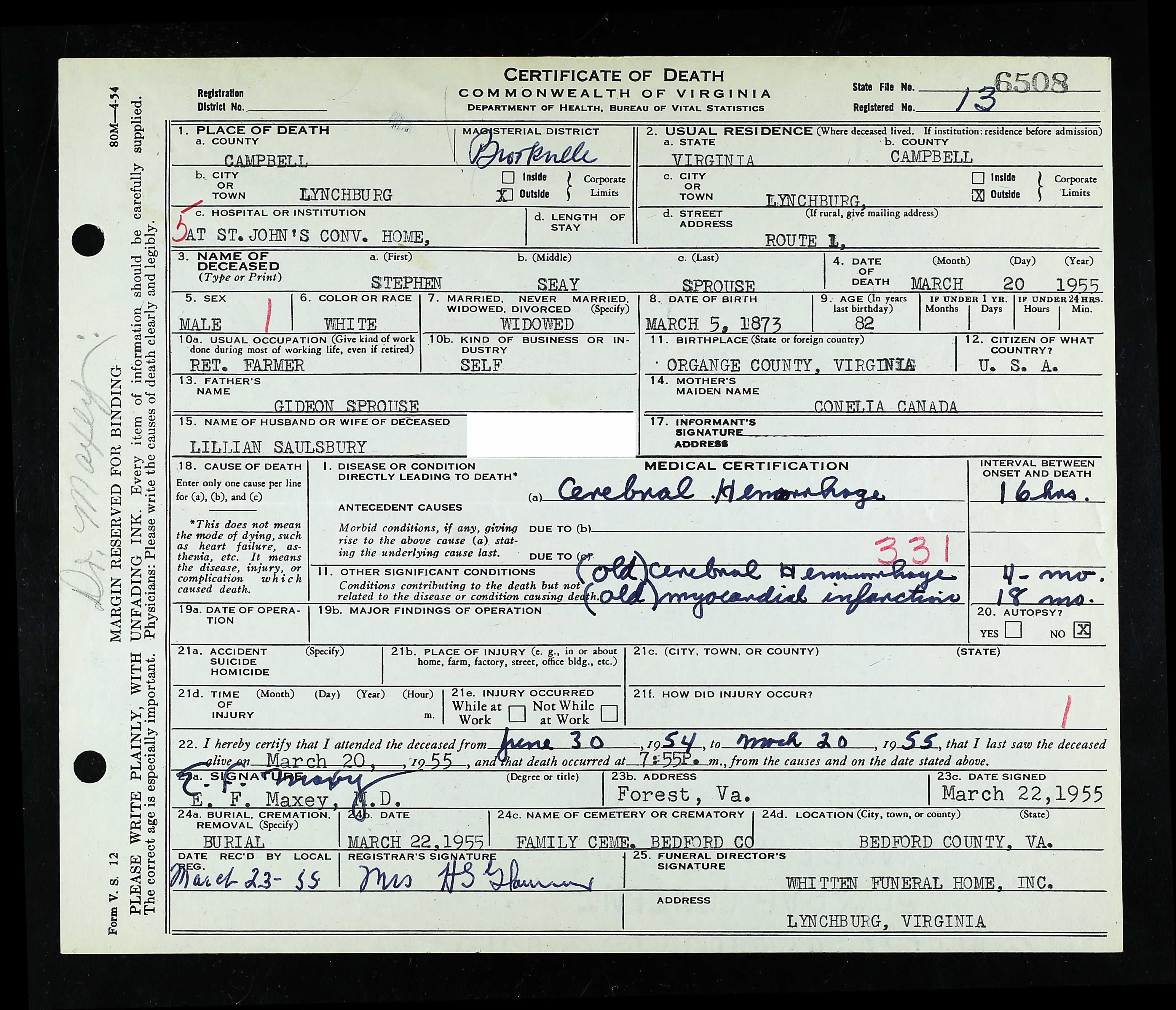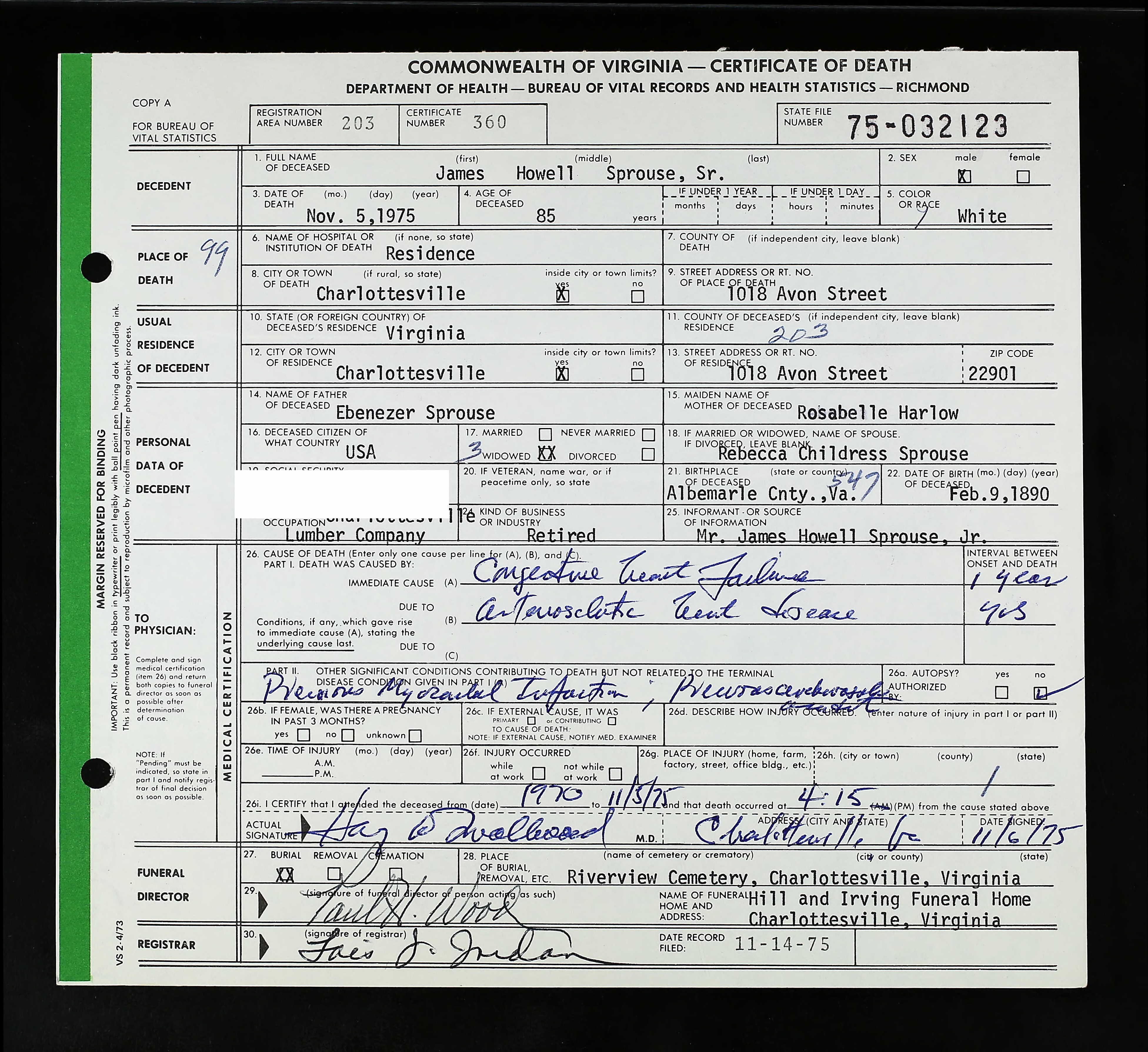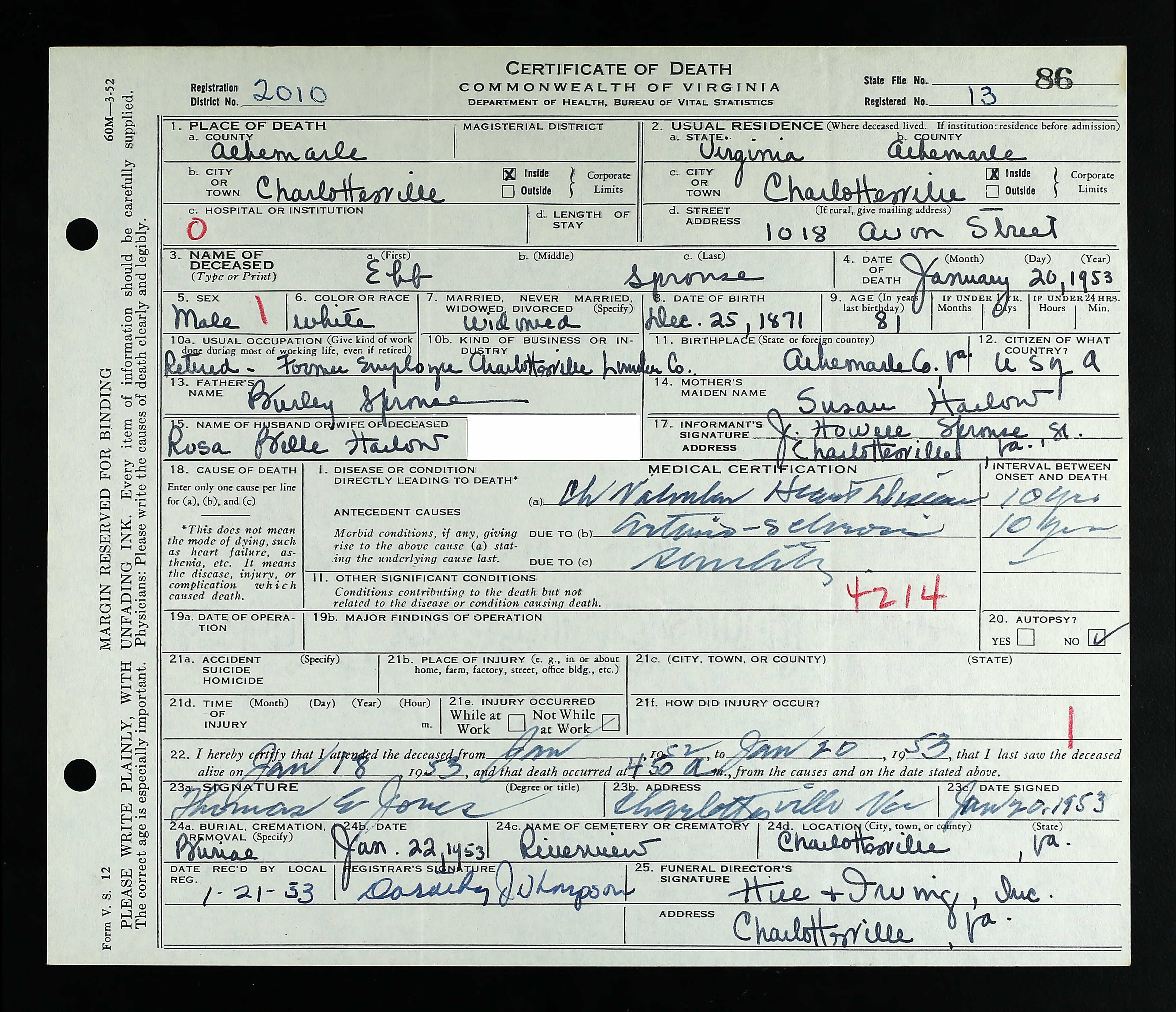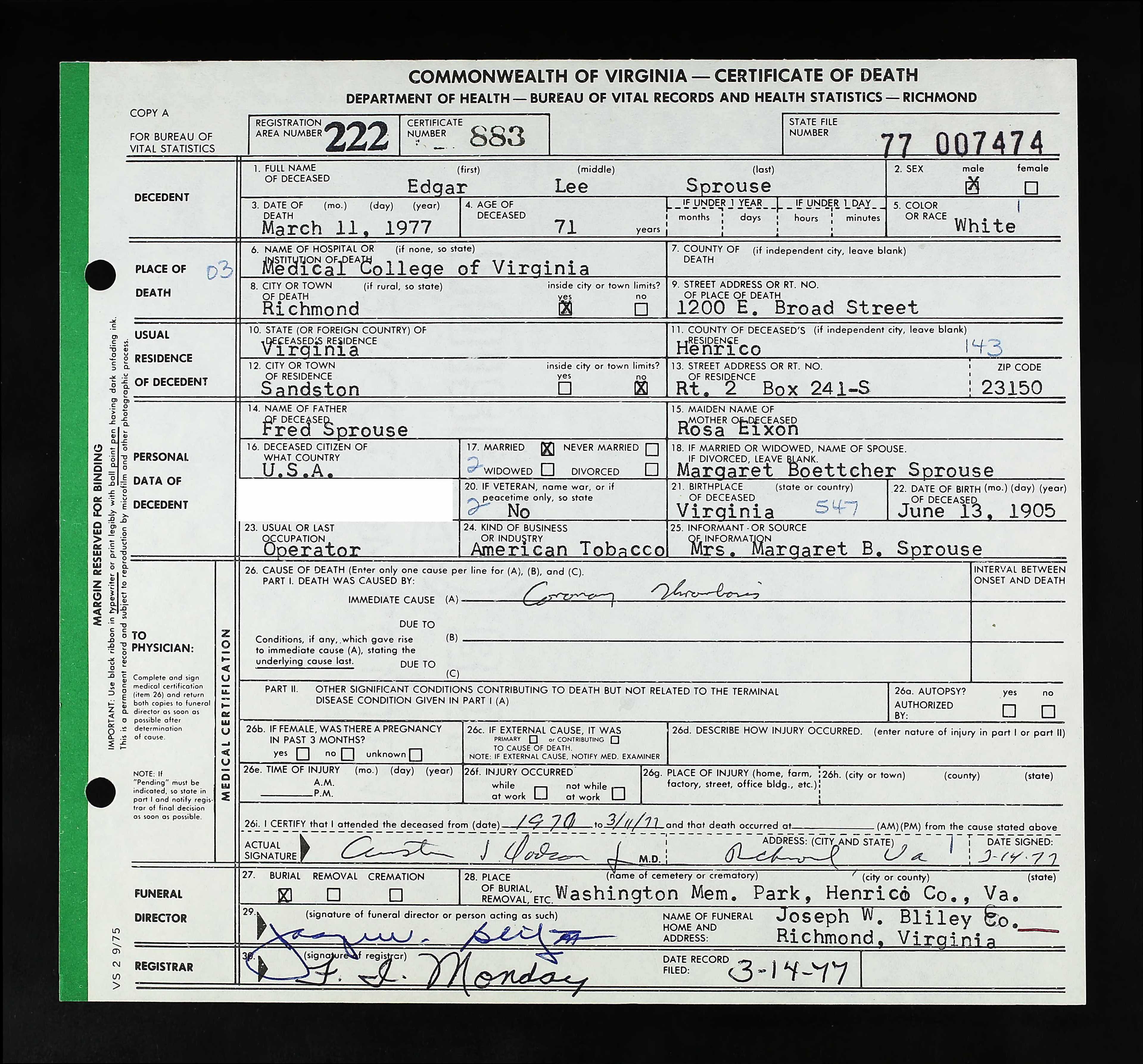 853. Death Certificate, Robert Sydnor Sprouse.