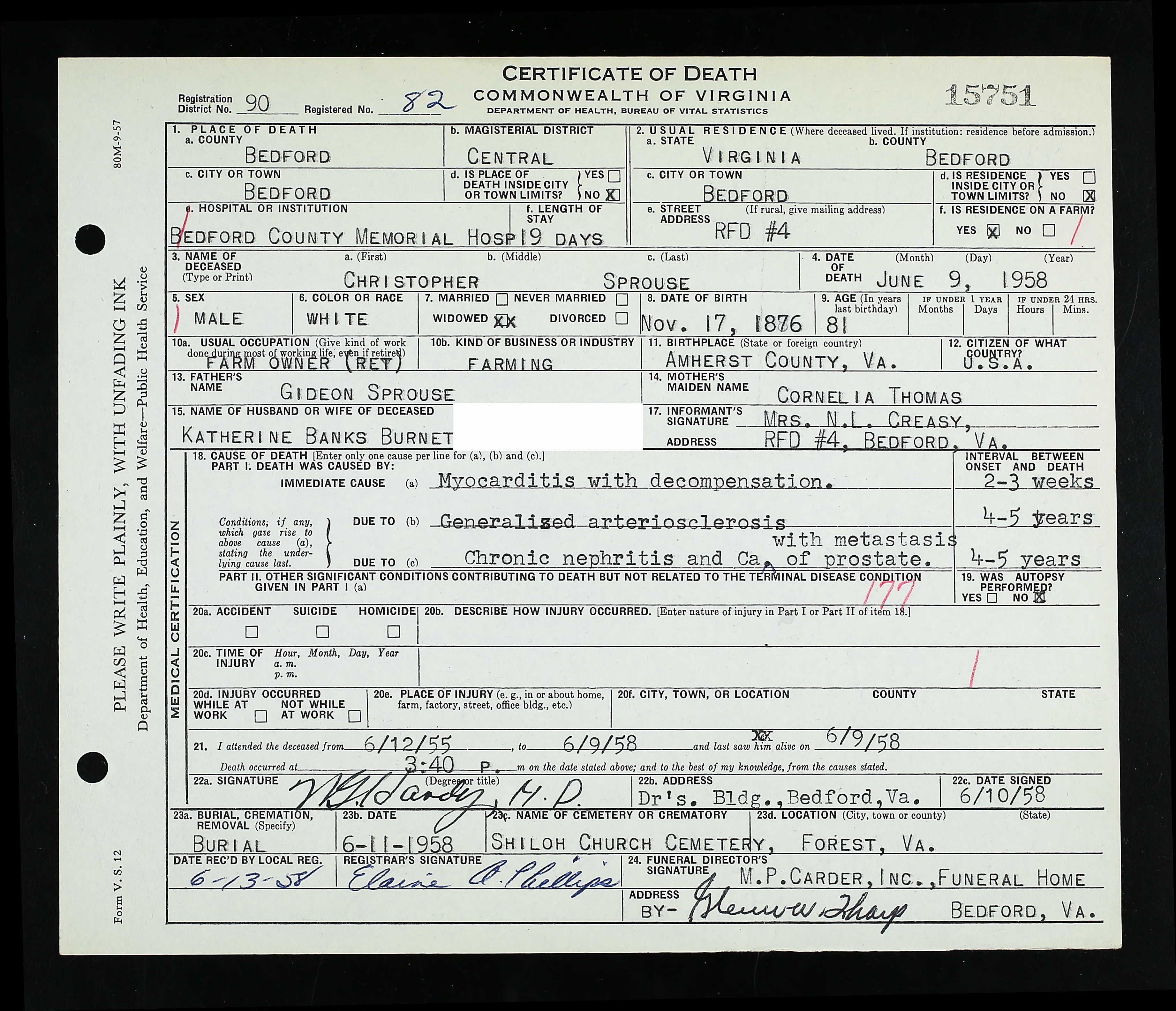 114. W. Arthur Sprouse was born on 20 Jul 1880 in Hot Springs, Bath County, Virginia, USA,217 died on 26 Jul 1954 in Fordwick, Augusta County, Virginia, USA, at age 74, and was buried in Estaline Valley Church Cemetery, Rockbridge County, Virginia, USA.