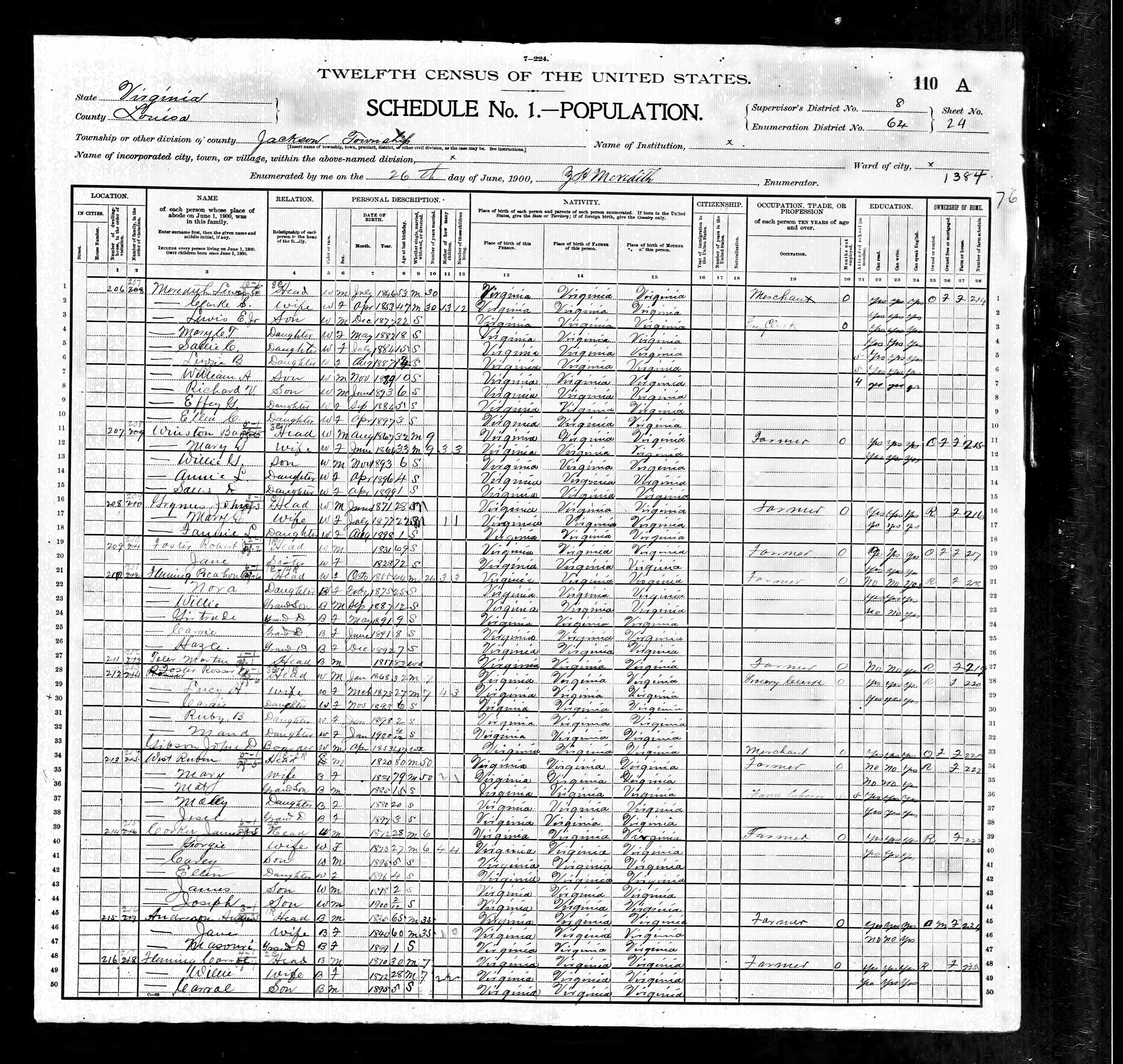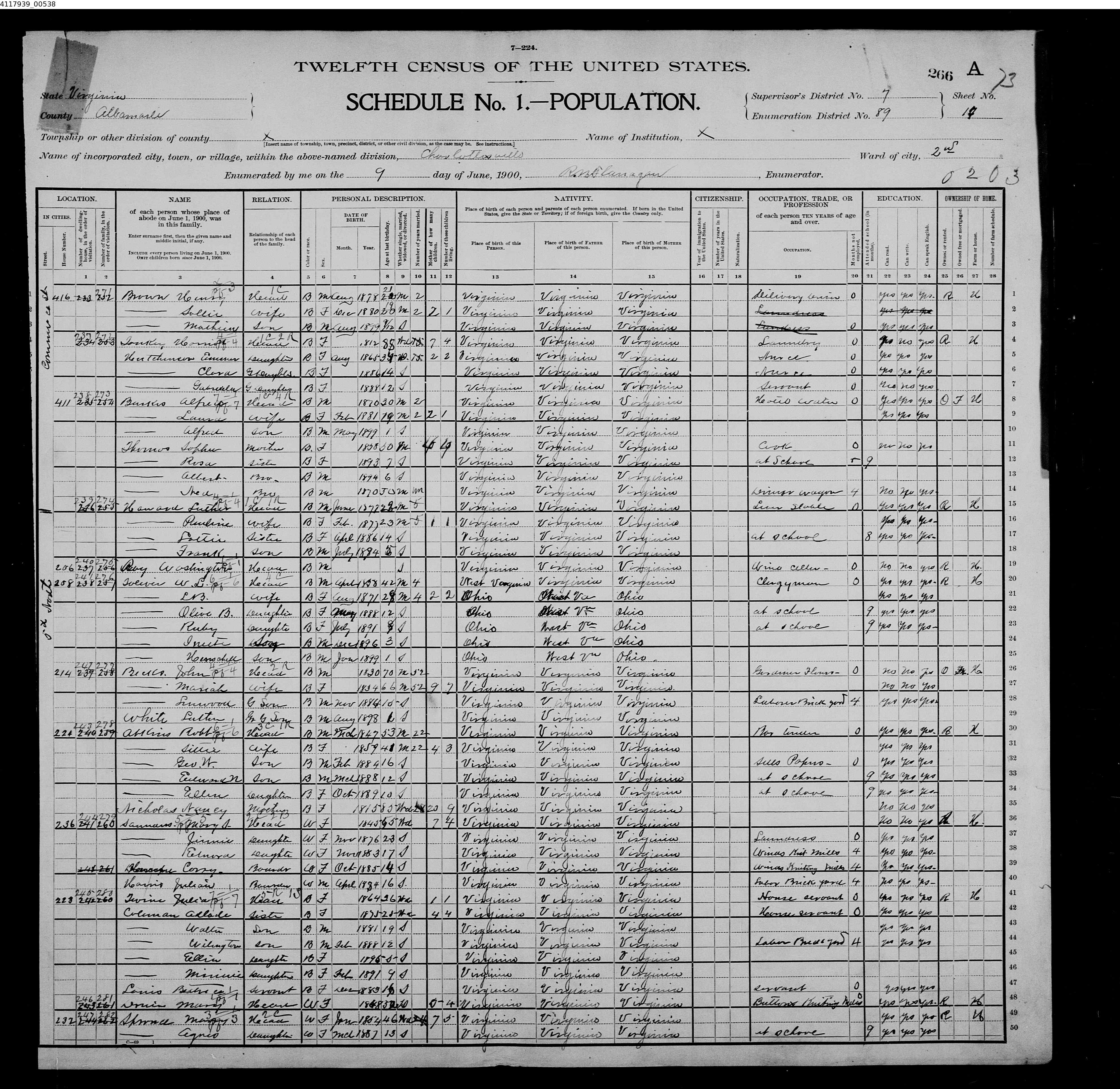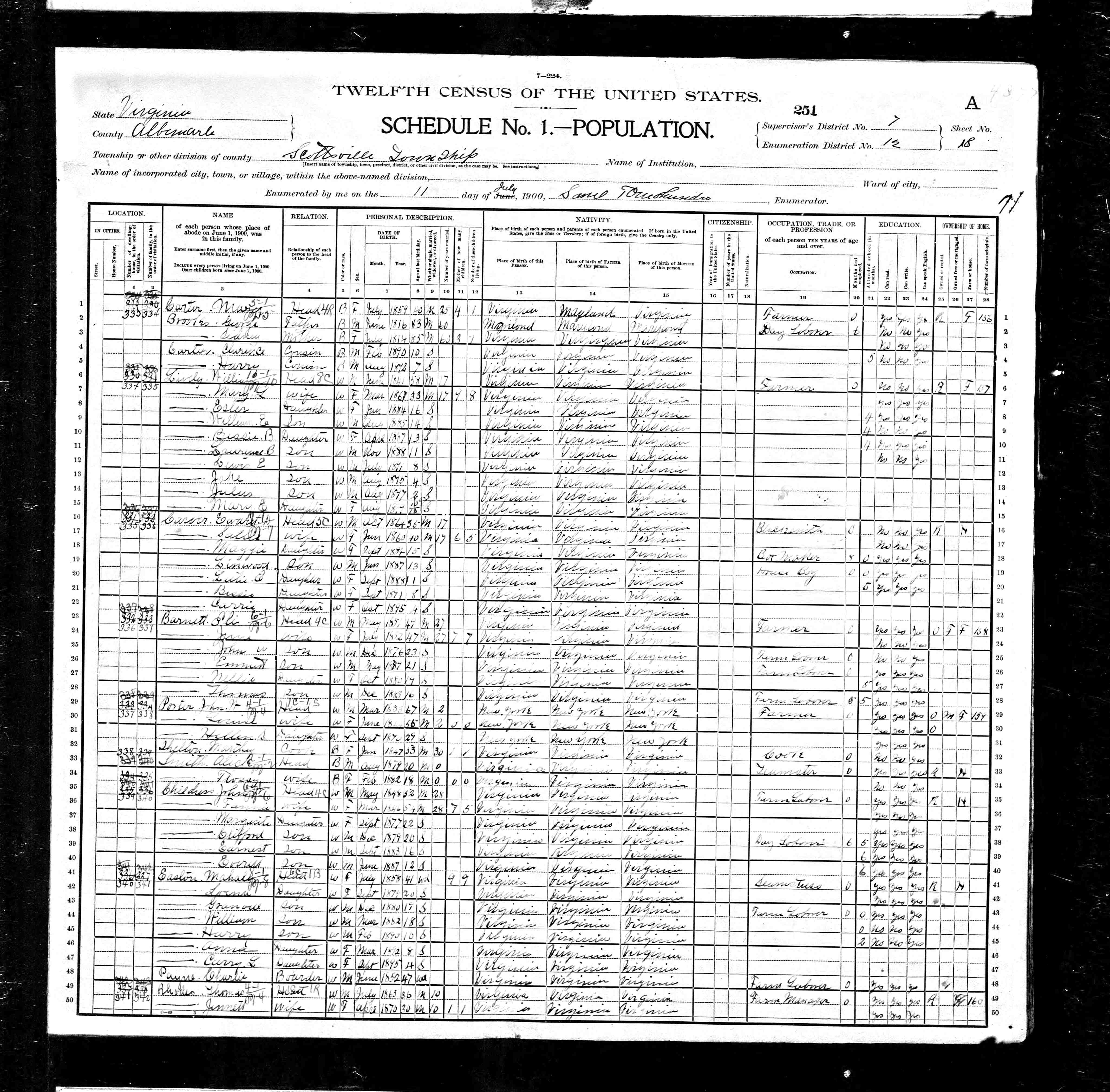 1. Census: Edward D. Carver and family, 11 Jul 1900, Scottsville, Albemarle County, Virginia, USA. 210