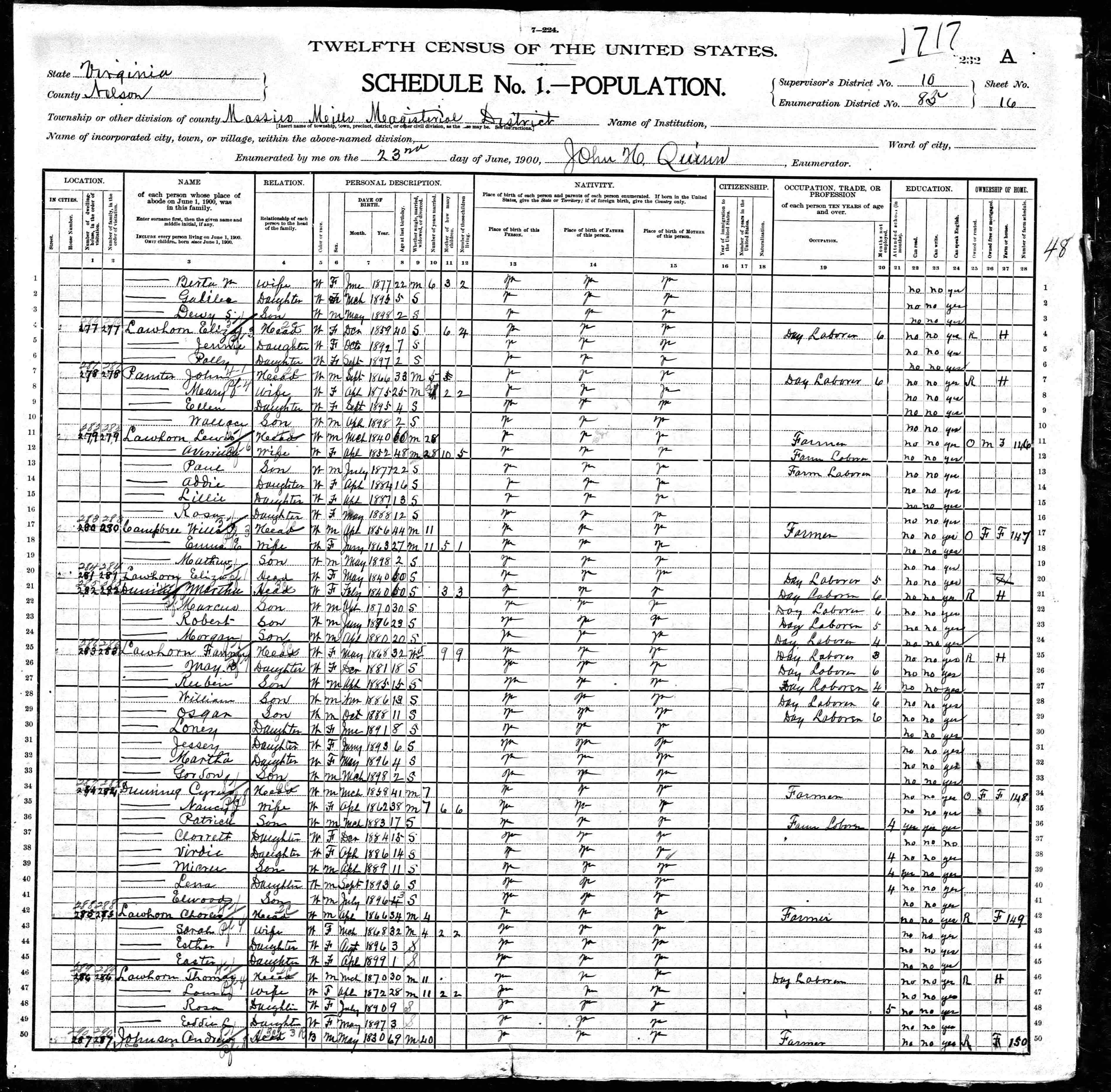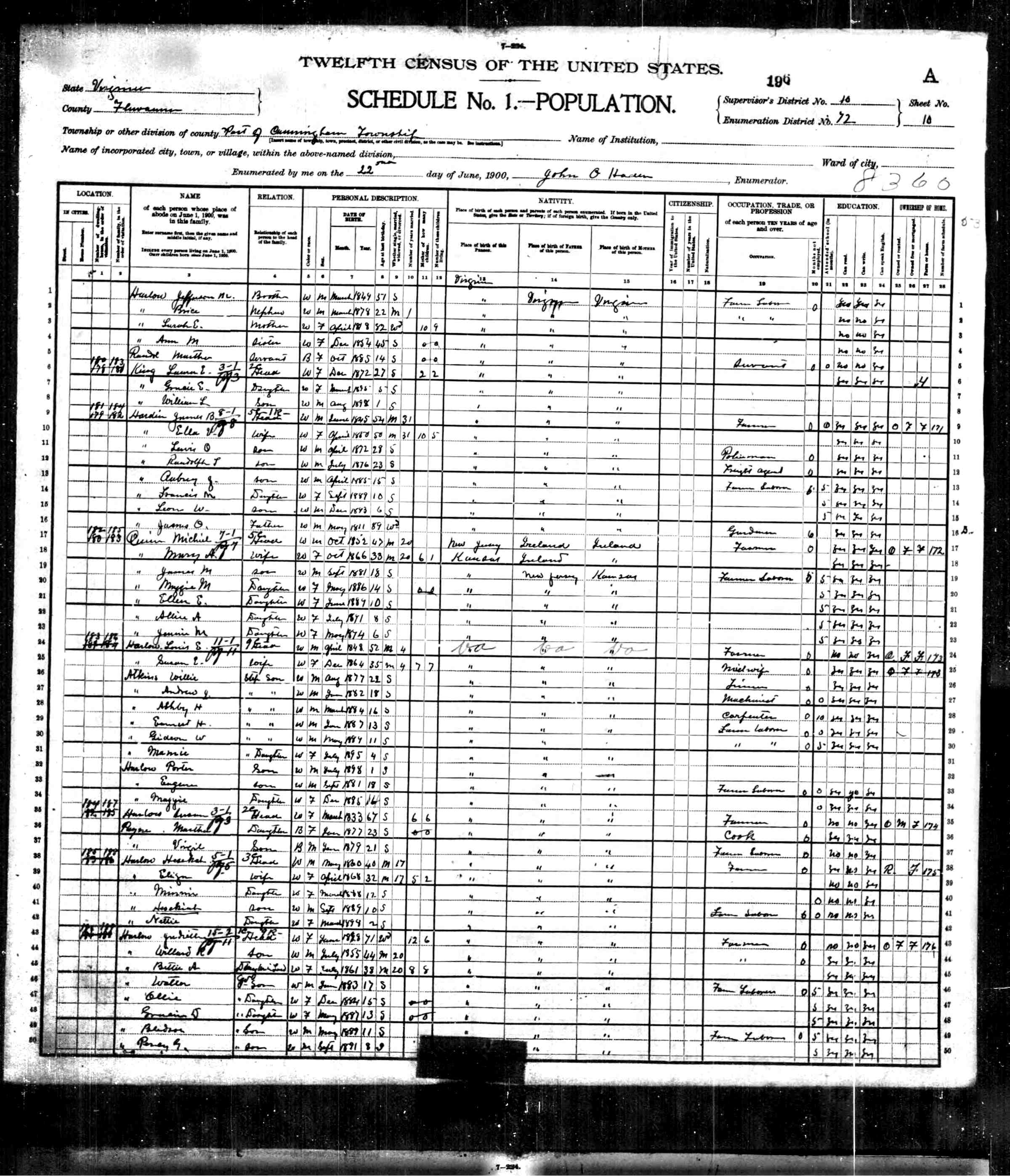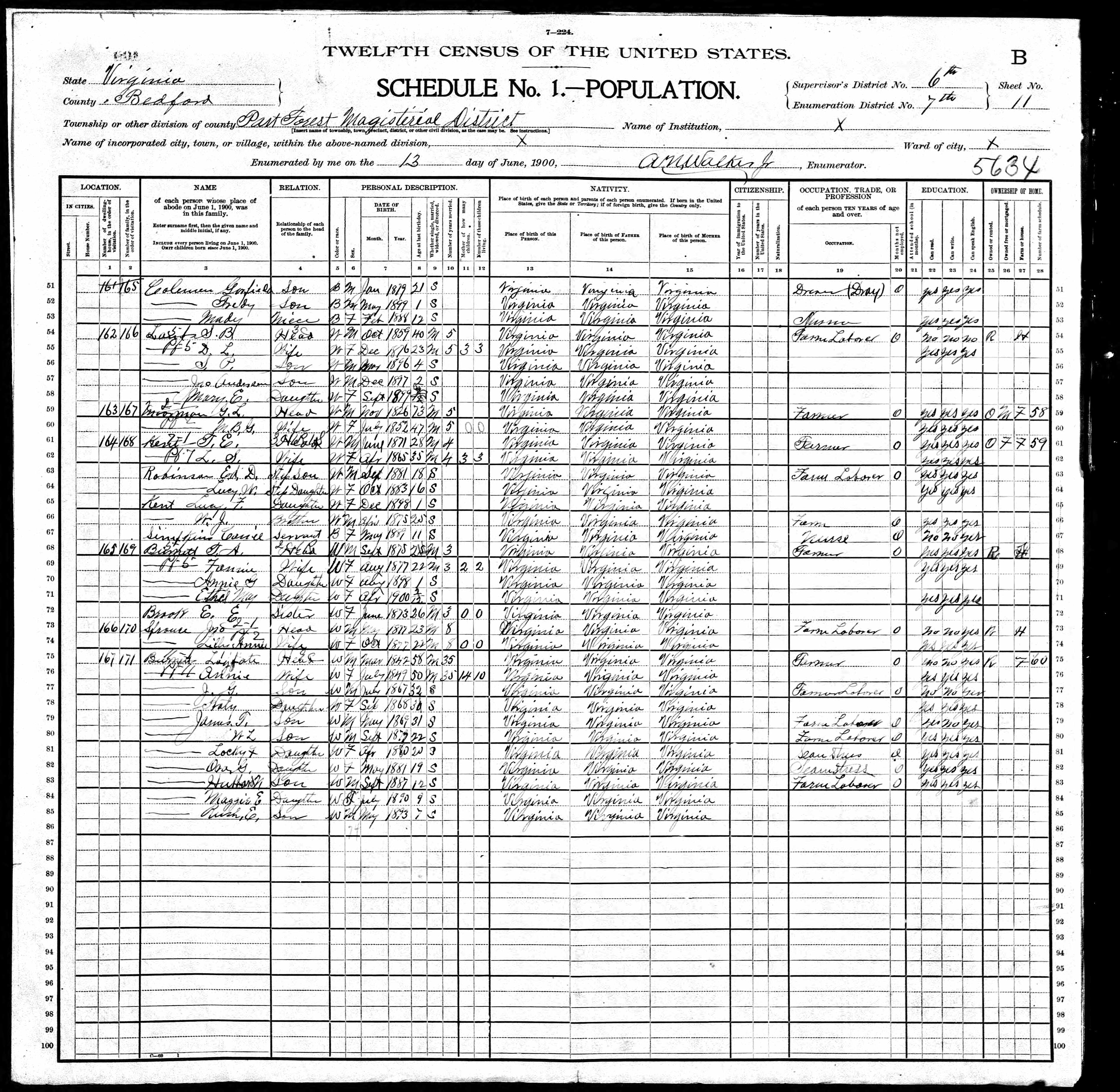1. Census: Edward D. Carver and family, 11 Jul 1900, Scottsville, Albemarle County, Virginia, USA. 210