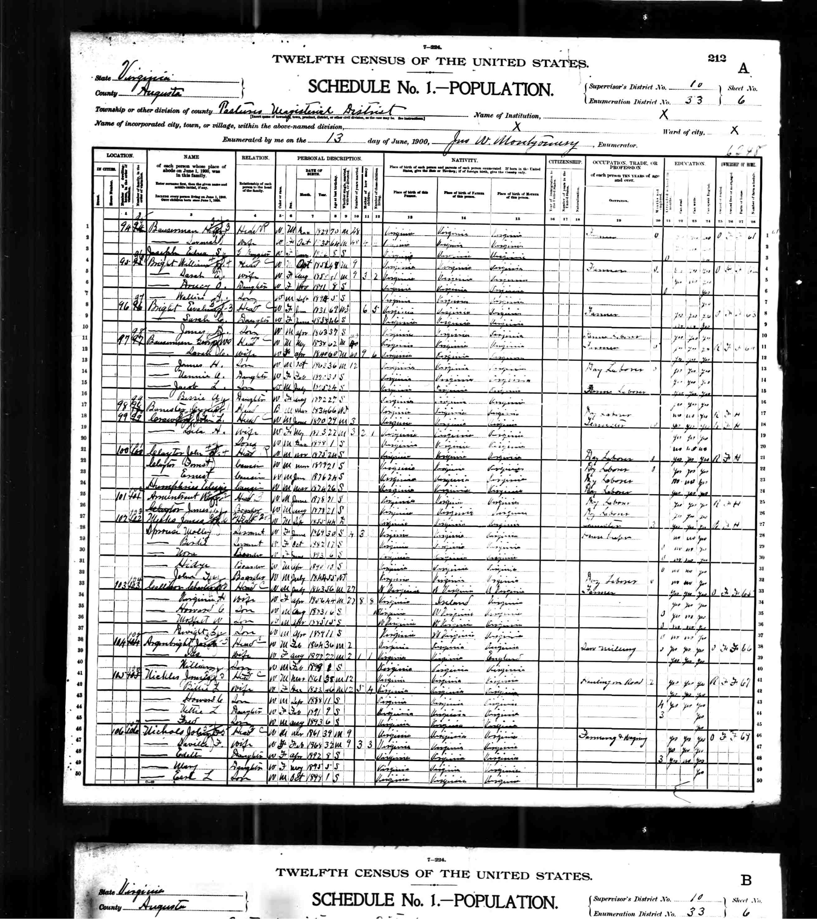 3. Census: James Thomas Sprouse and family, 11 Jun 1900, Pastures, Augusta County, Virginia, USA. 538