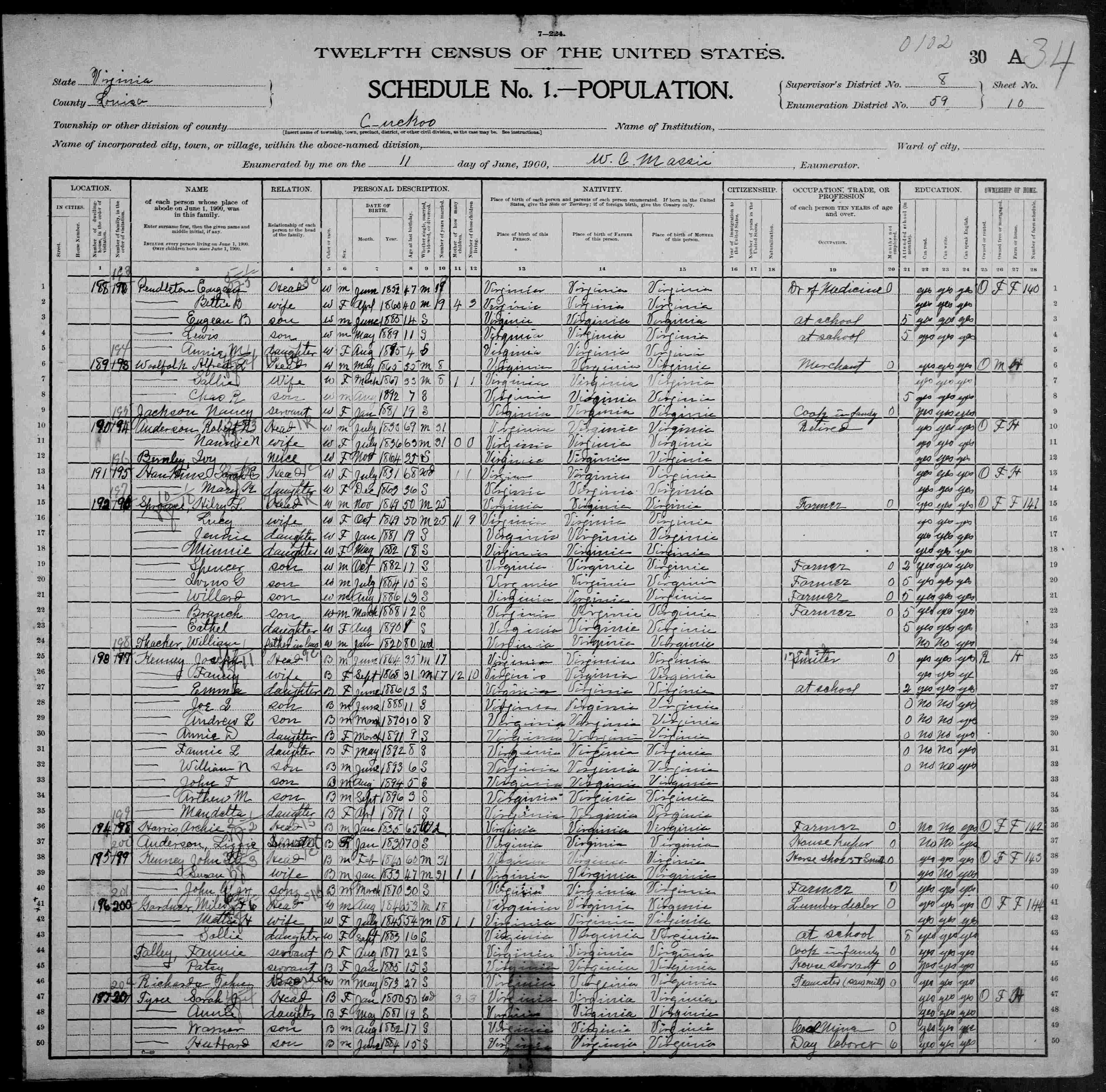 2. Census: Willie Sprouse and family, 20 Jun 1900, Cuckoo, Louisa County, Virginia, USA. 222