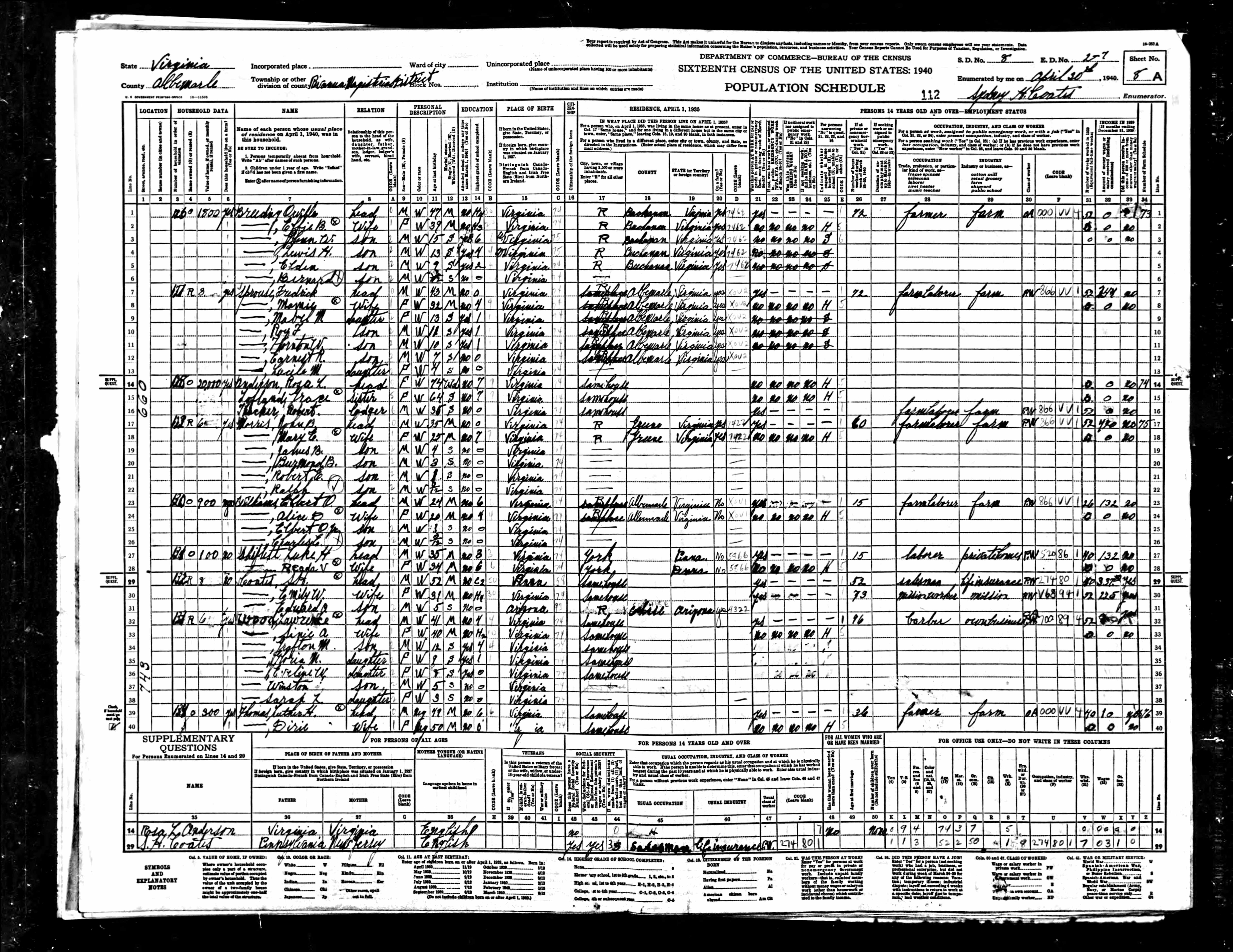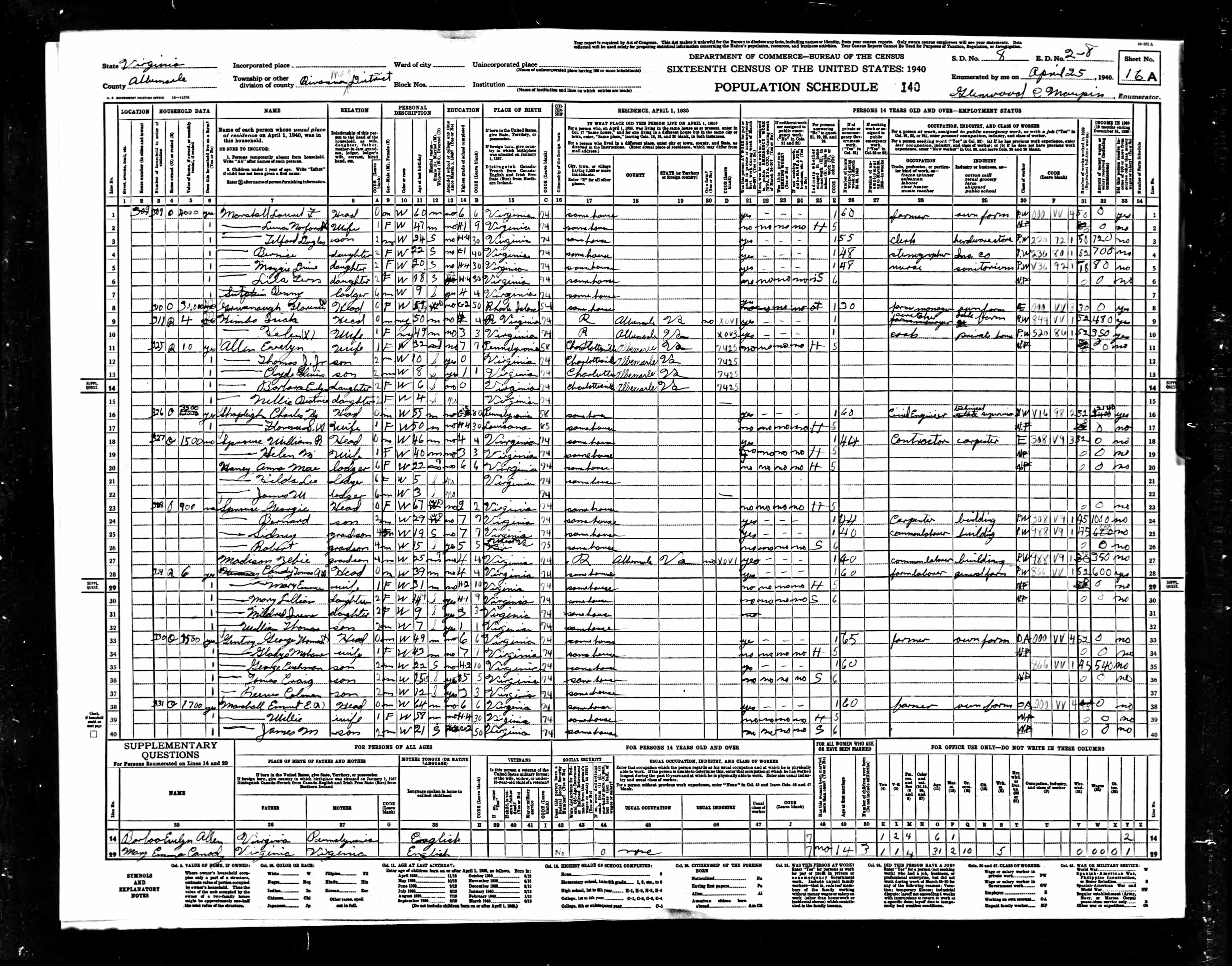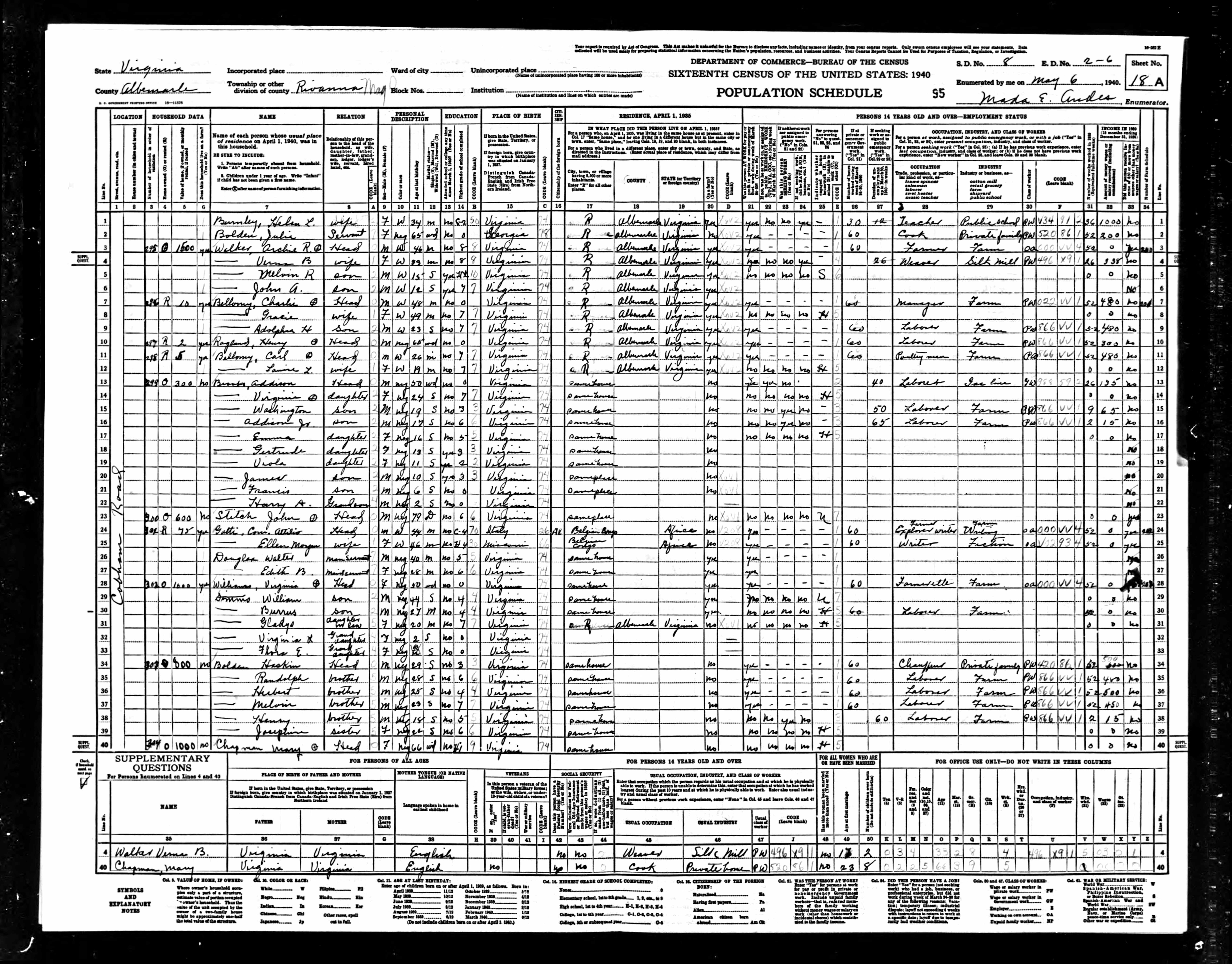 878. 1940 Virginia Census, Albemarle, Rivanna, ED 2-6, Sht 8A, Image 35 Roll T627.