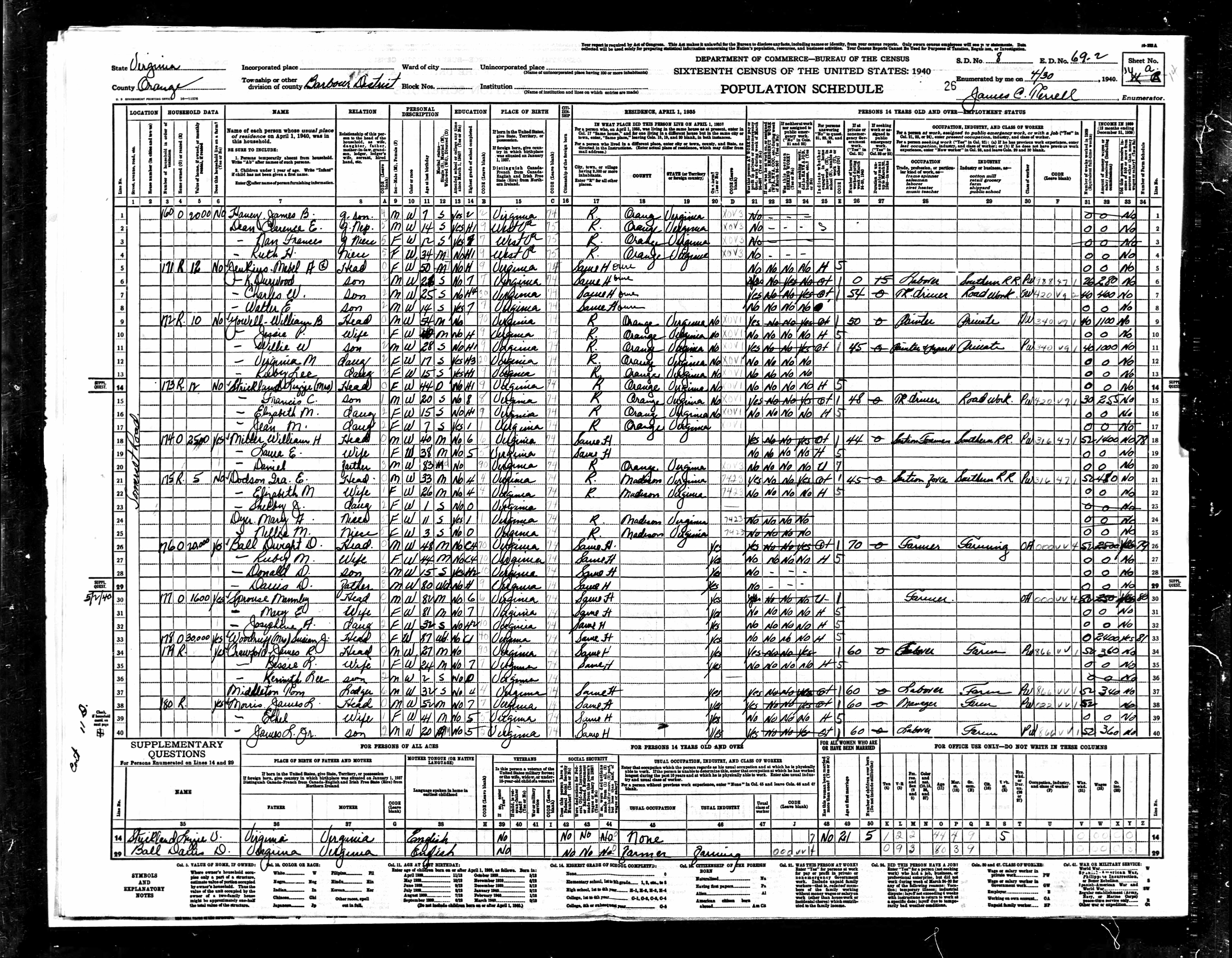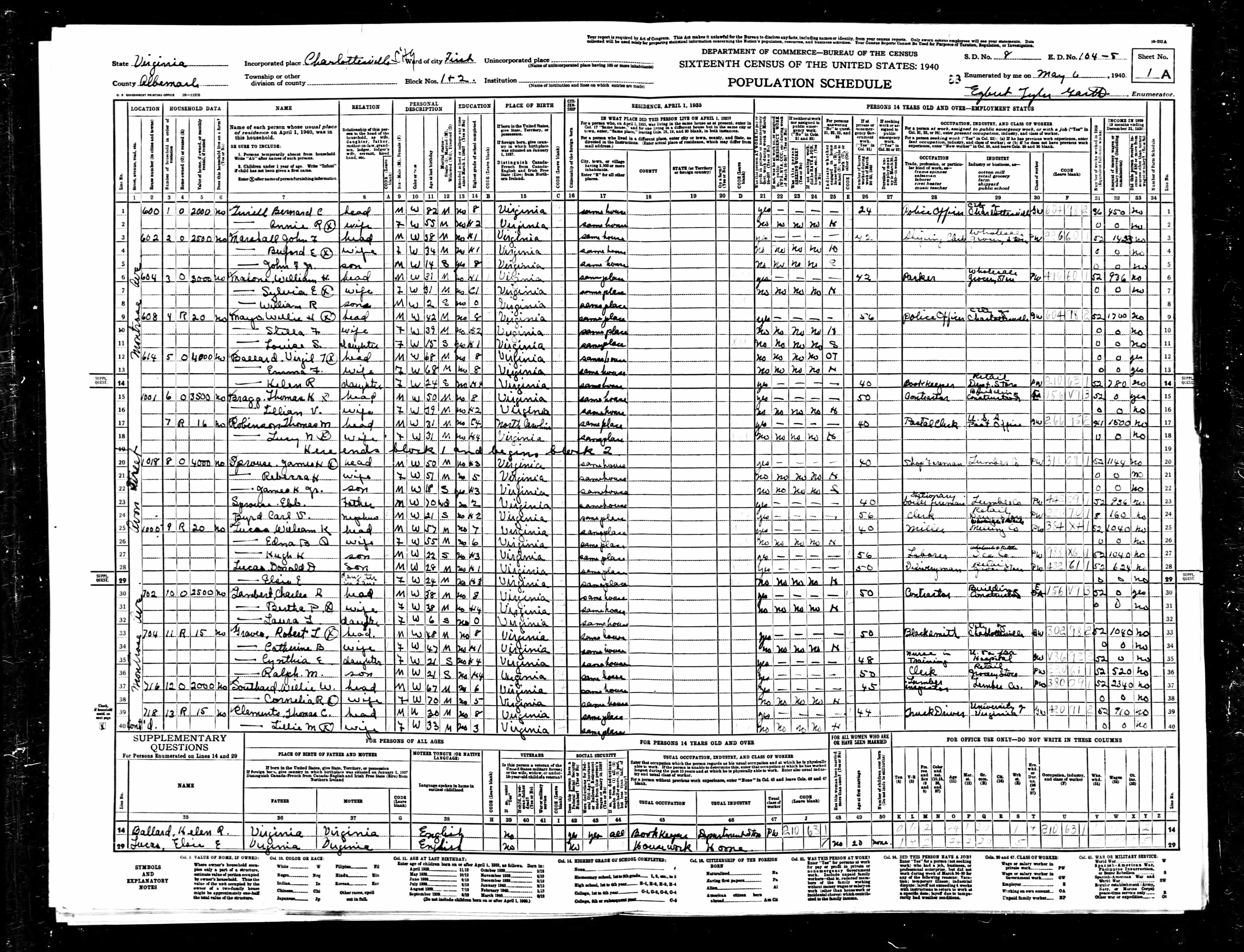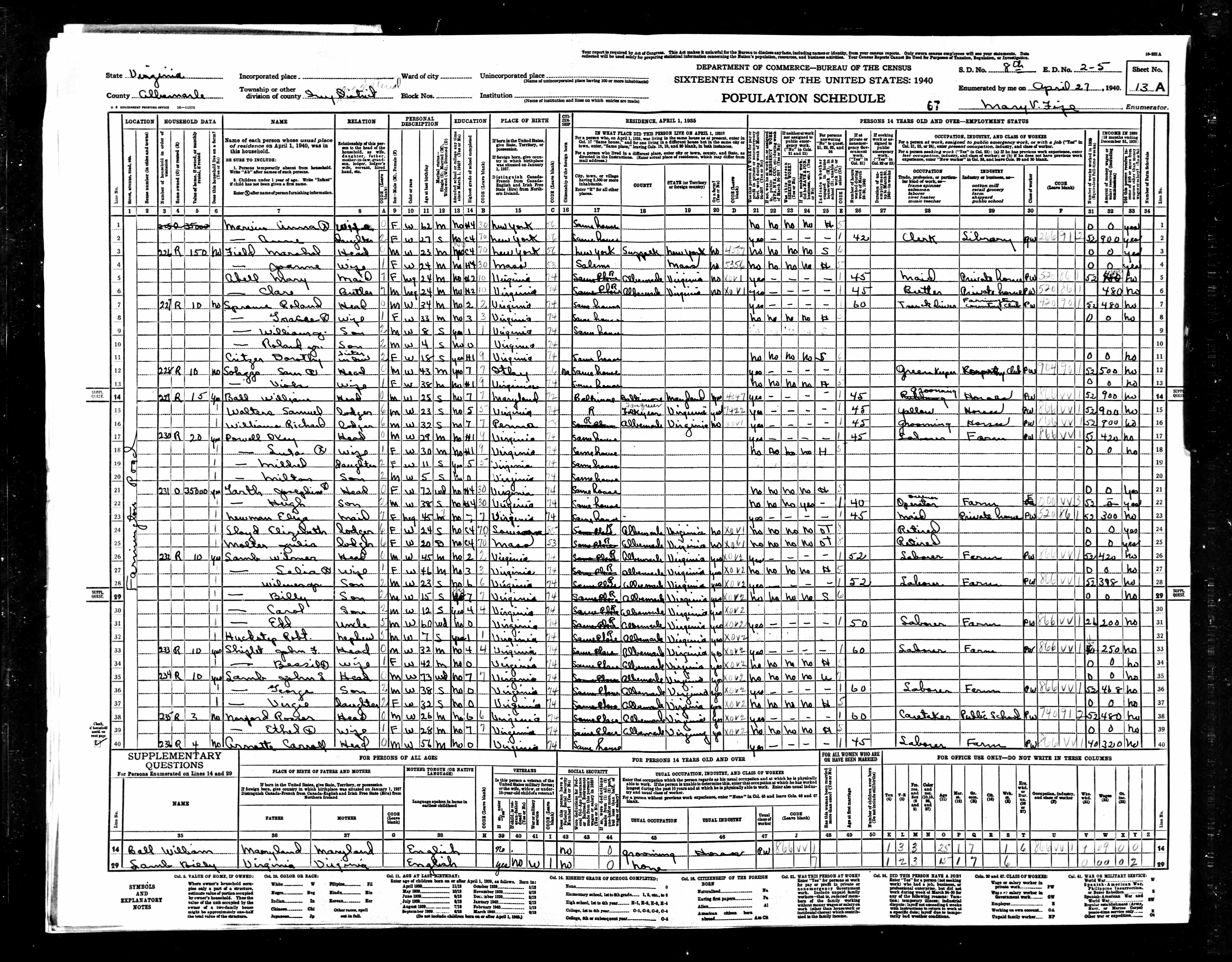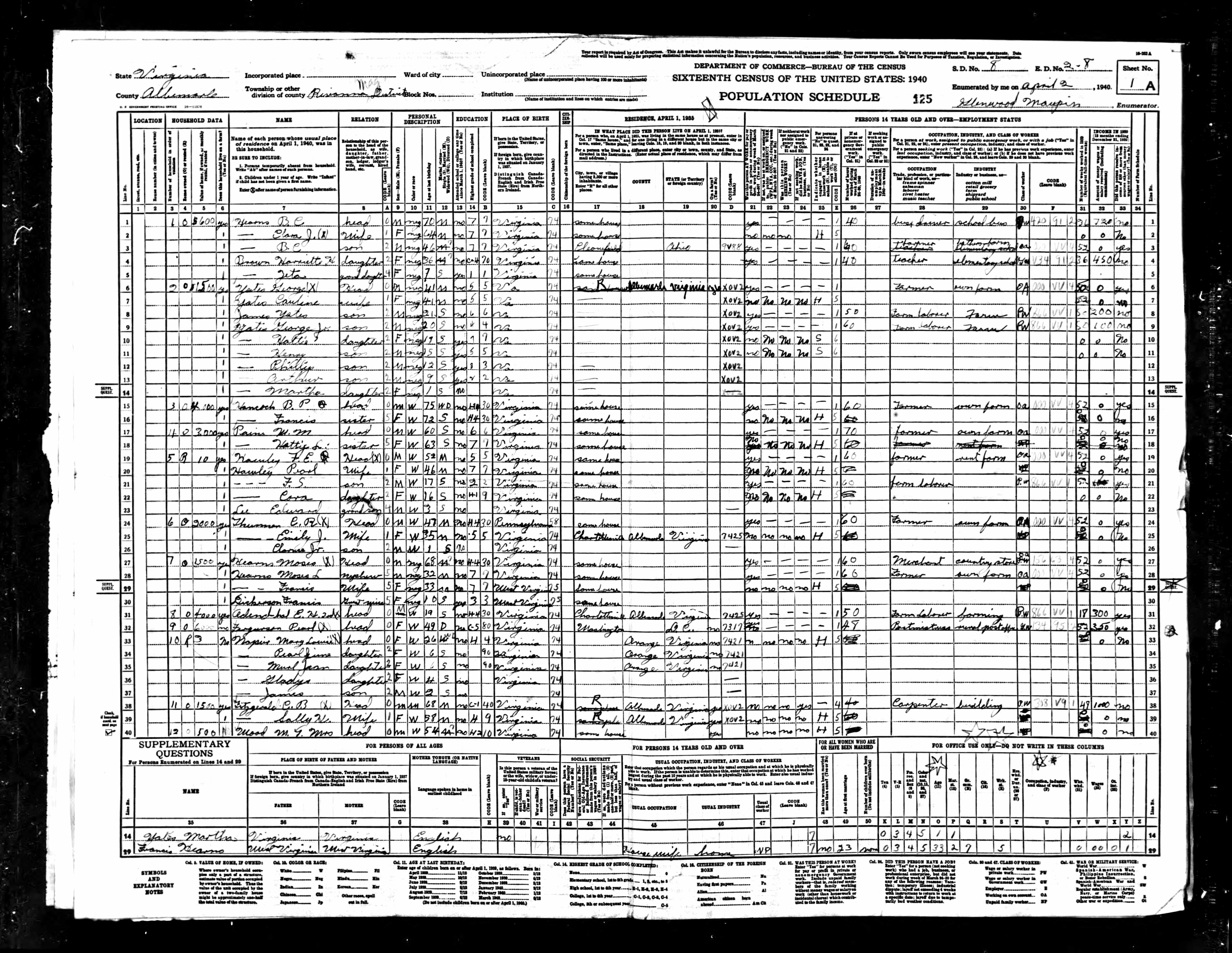 878. 1940 Virginia Census, Albemarle, Rivanna, ED 2-6, Sht 8A, Image 35 Roll T627.