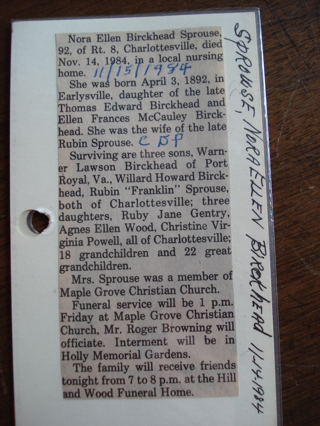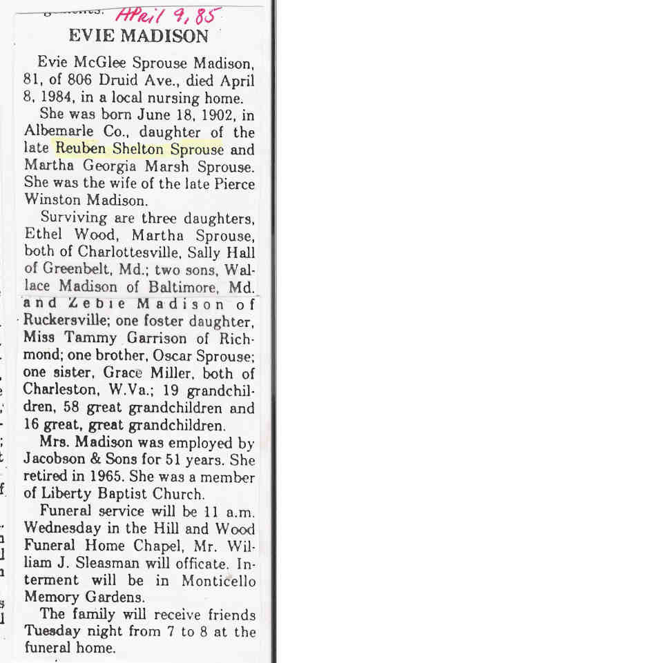 + 322 vii. Sarah Louise Sprouse was born circa Nov 1928 in Augusta County, Virginia, USA, died on 24 Feb 1985 in Charlottesville, Albemarle County, Virginia, USA,536 about age 56, and was buried on 28 Feb 1985 in Estaline Valley Church Cemetery, Rockbridge County, Virginia, USA.