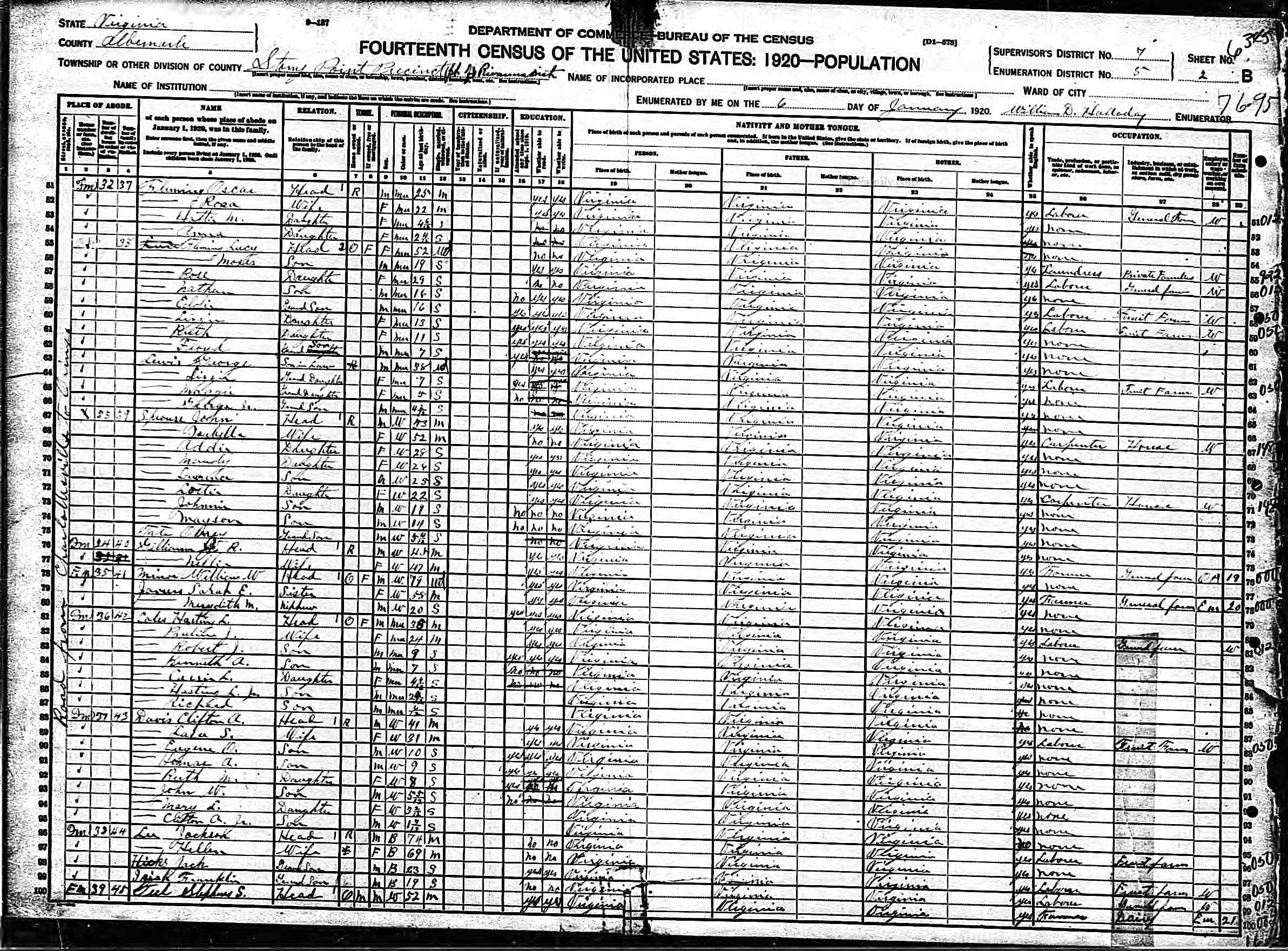 876. 1920 Virginia Census, Albemarle, Rivanna, ED 8, Sht 6A, Image 11 Roll T625_1878, p. 6A, ED 8, Image 200.