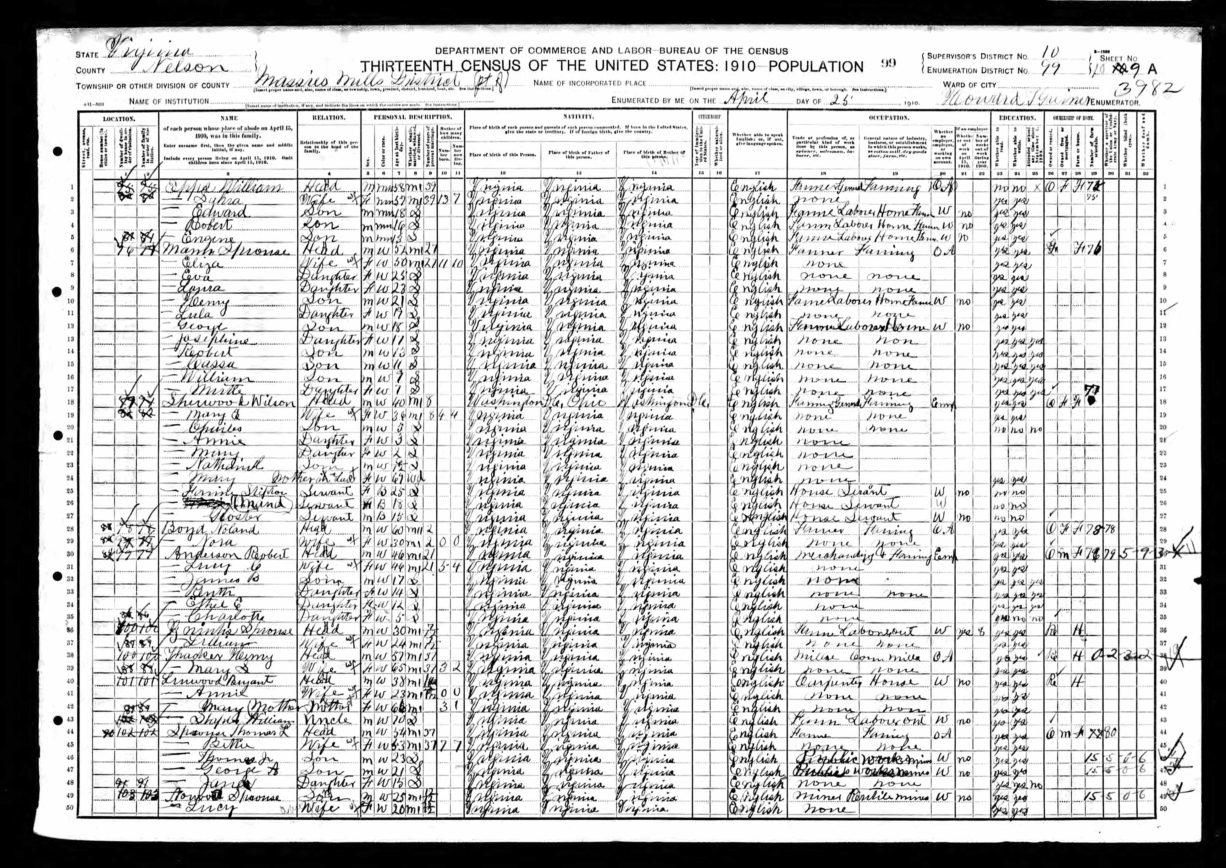 2. Census: Willie Sprouse and family, 22 Apr 1910, Mineral, Louisa County, Virginia, USA. 545
