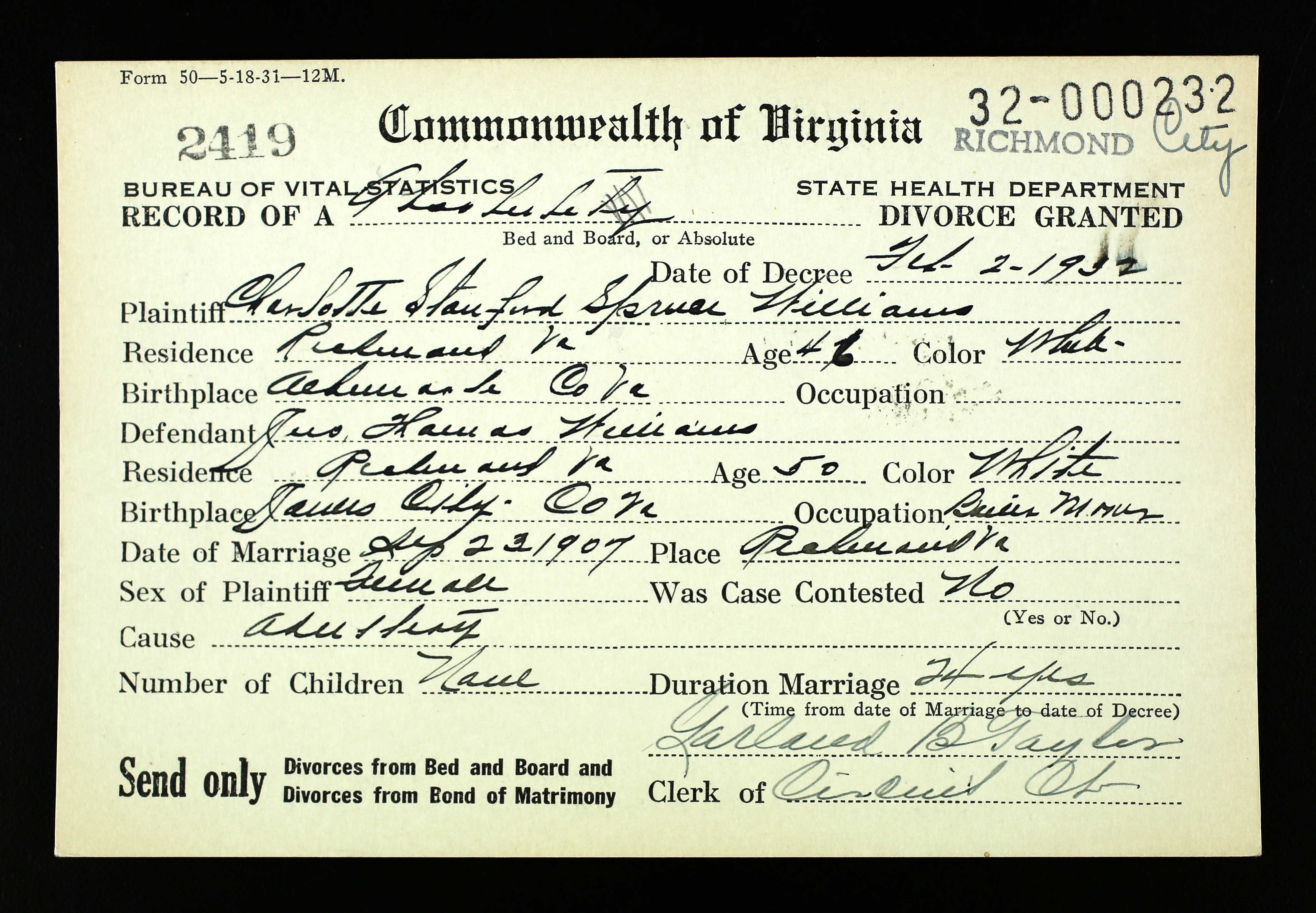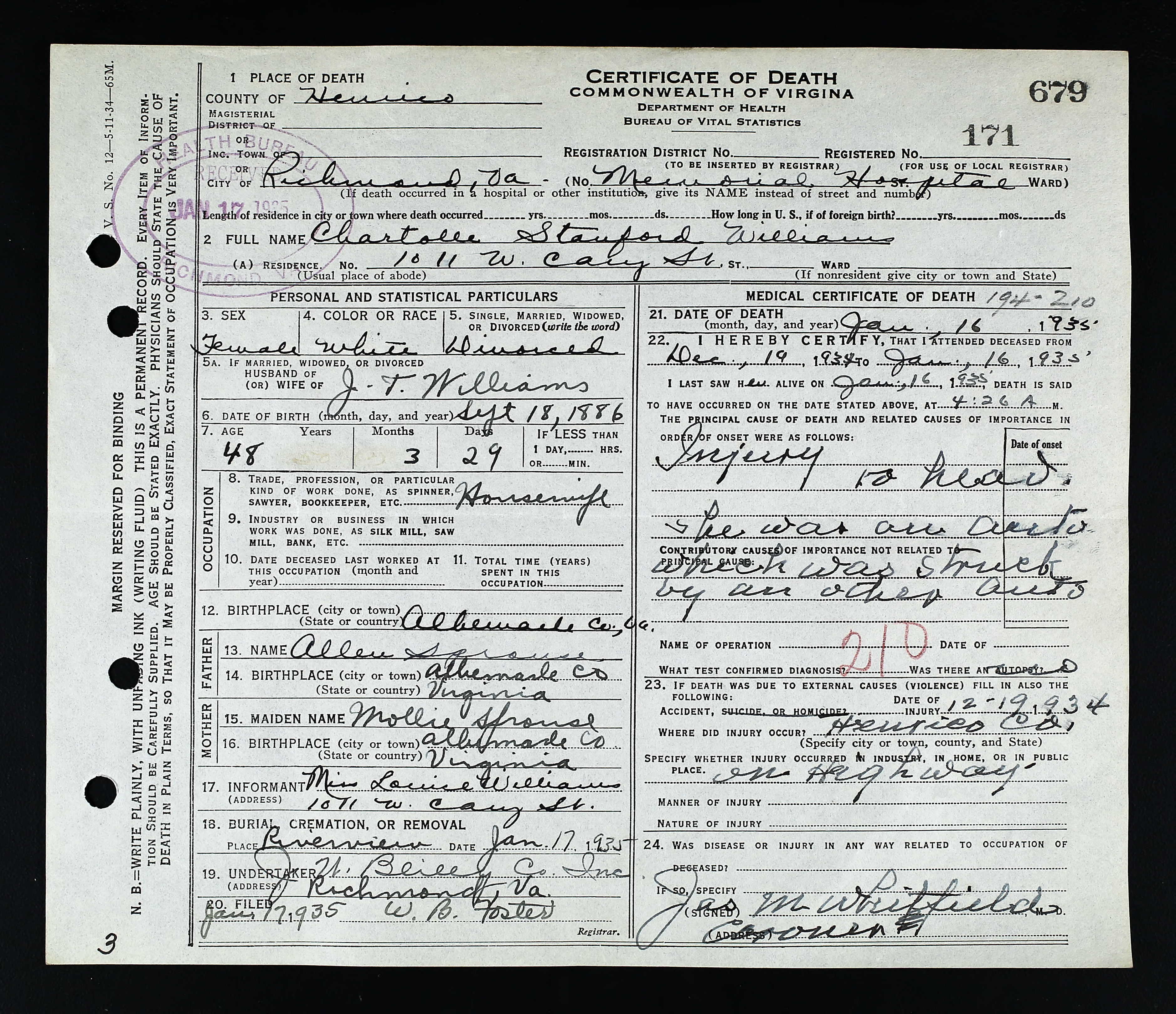 Bride's Father's Name Chas. A. Richeson