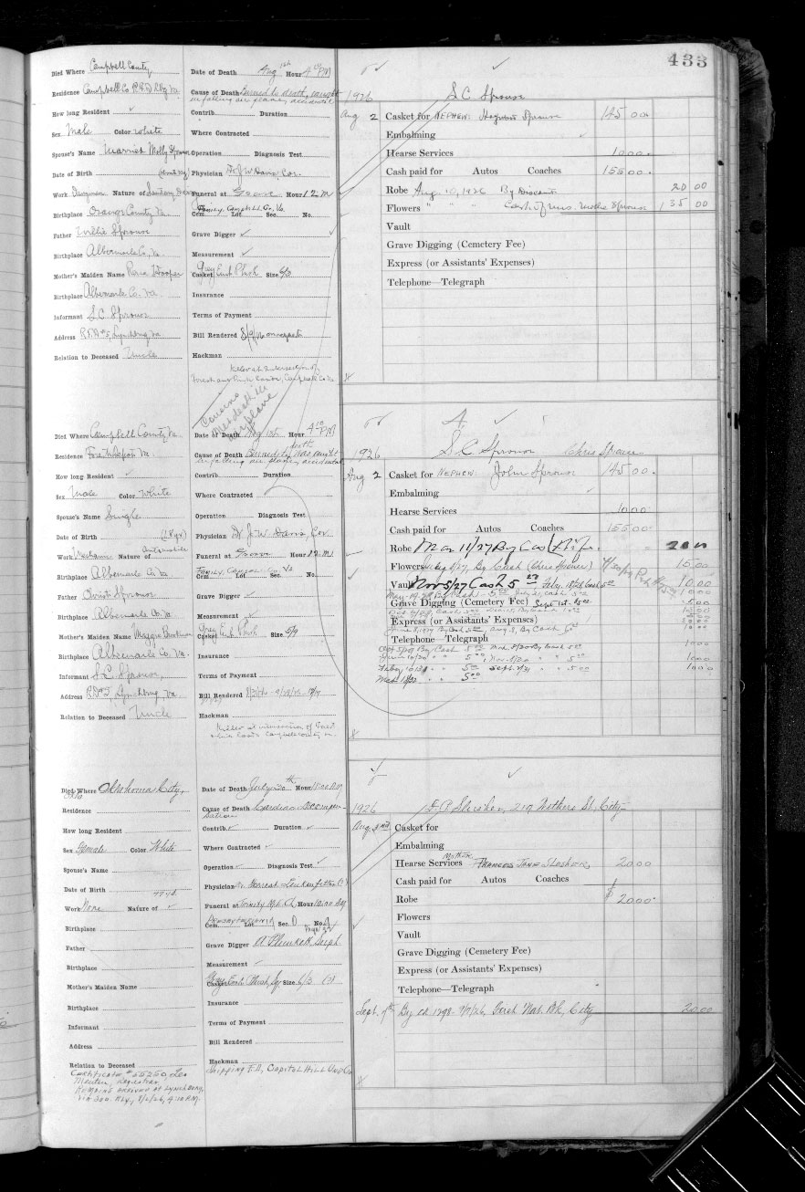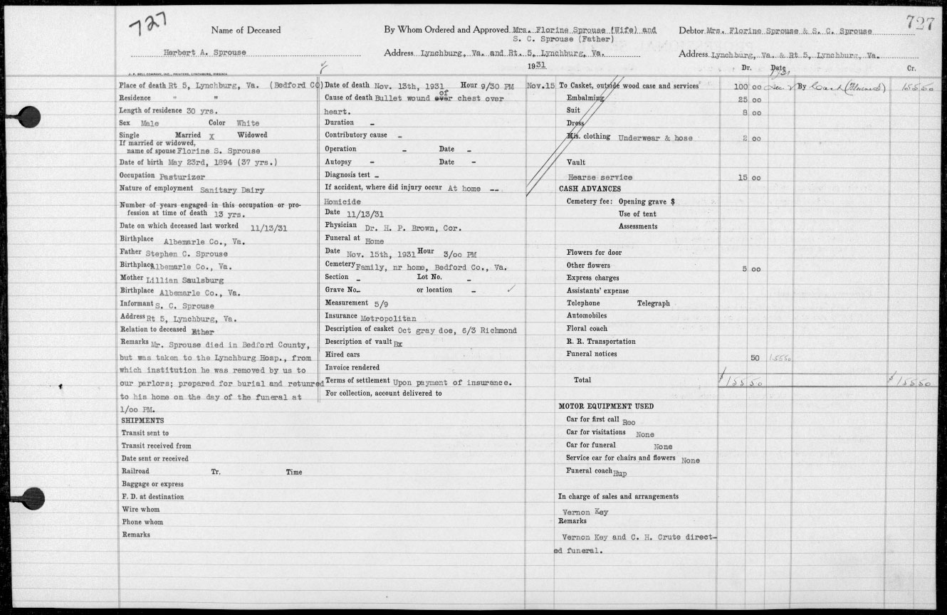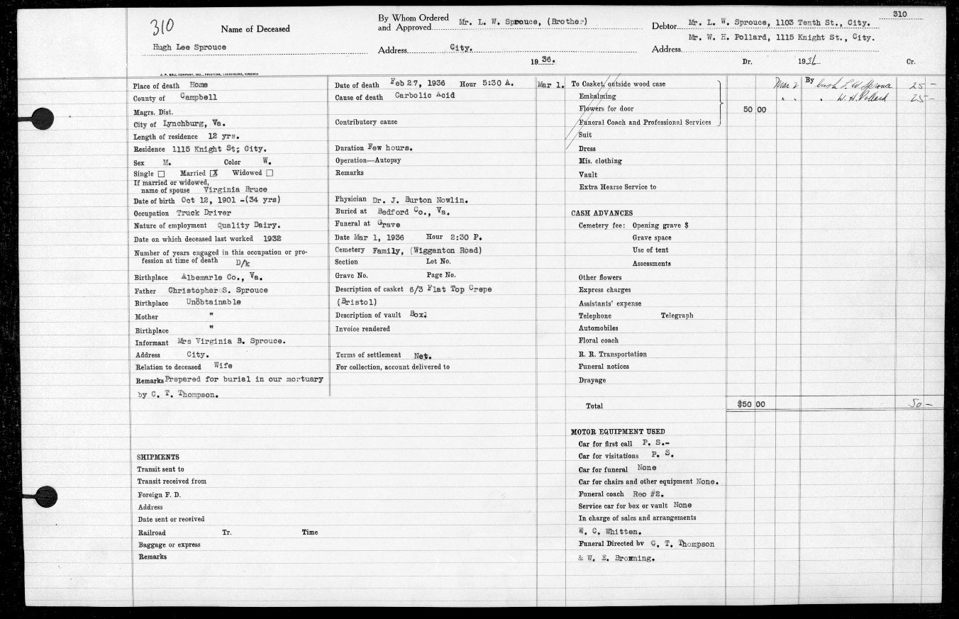 857. Hill's Lynchburg (Campbell County, VA) City Directory, p. 503, Sprouse.