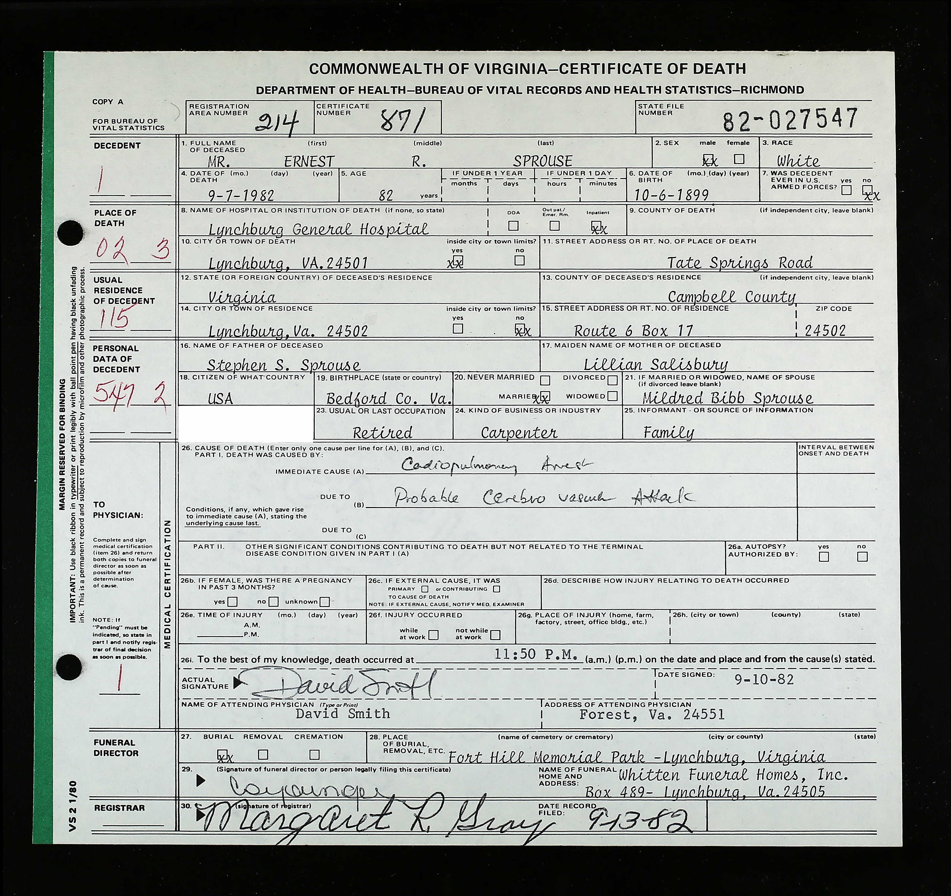 835. Social Security Death Index, Mary Sprouse. SSN 223-68-7476.