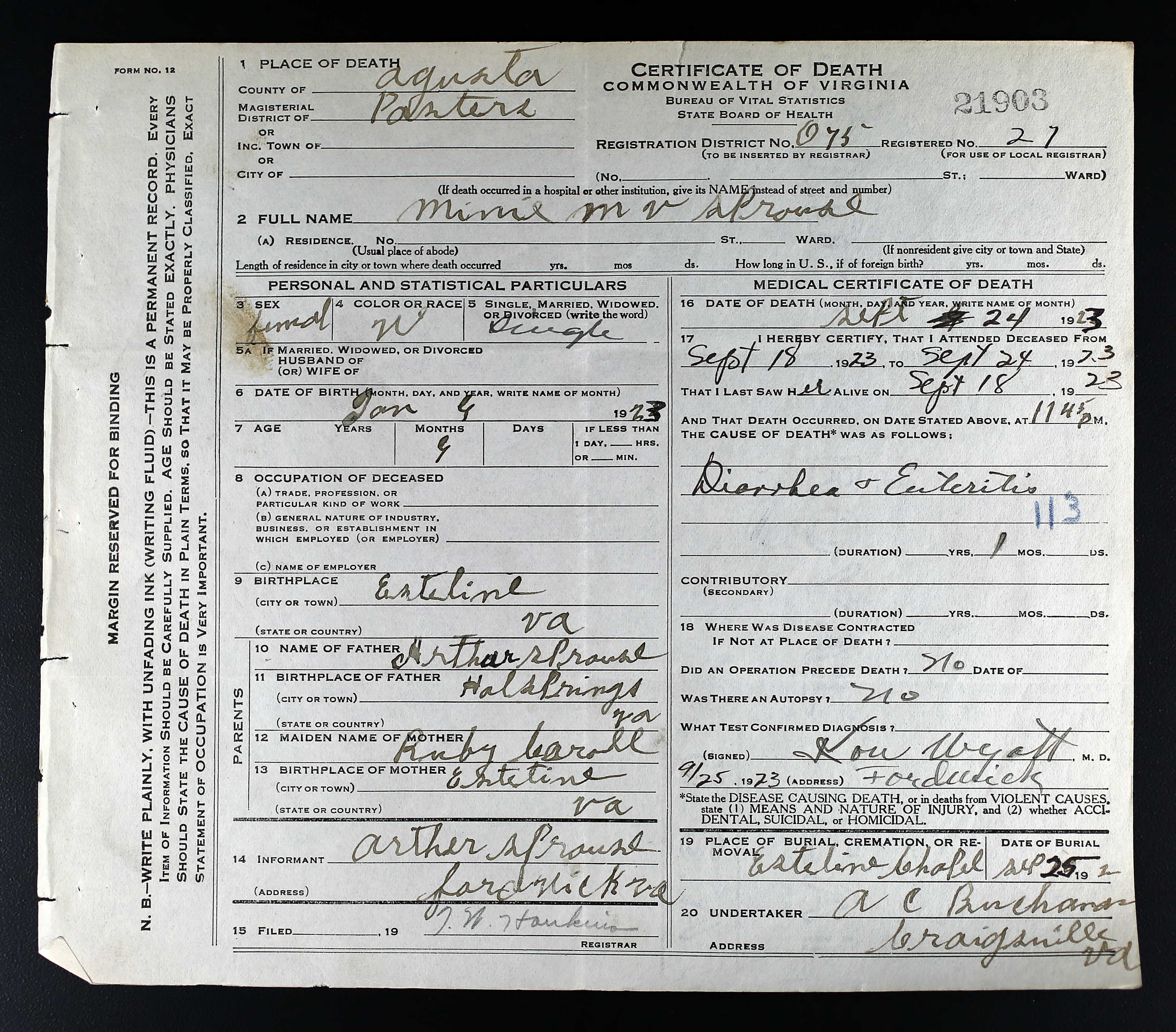 + 317 ii. Minie M.V. Sprouse was born on 9 Jan 1923 in Estaline, Augusta County, Virginia, USA, died on 24 Sep 1923 in Pastures, Augusta County, Virginia, USA,534 and was buried on 25 Sep 1923 in Estaline Valley Church Cemetery, Rockbridge County, Virginia, USA.
