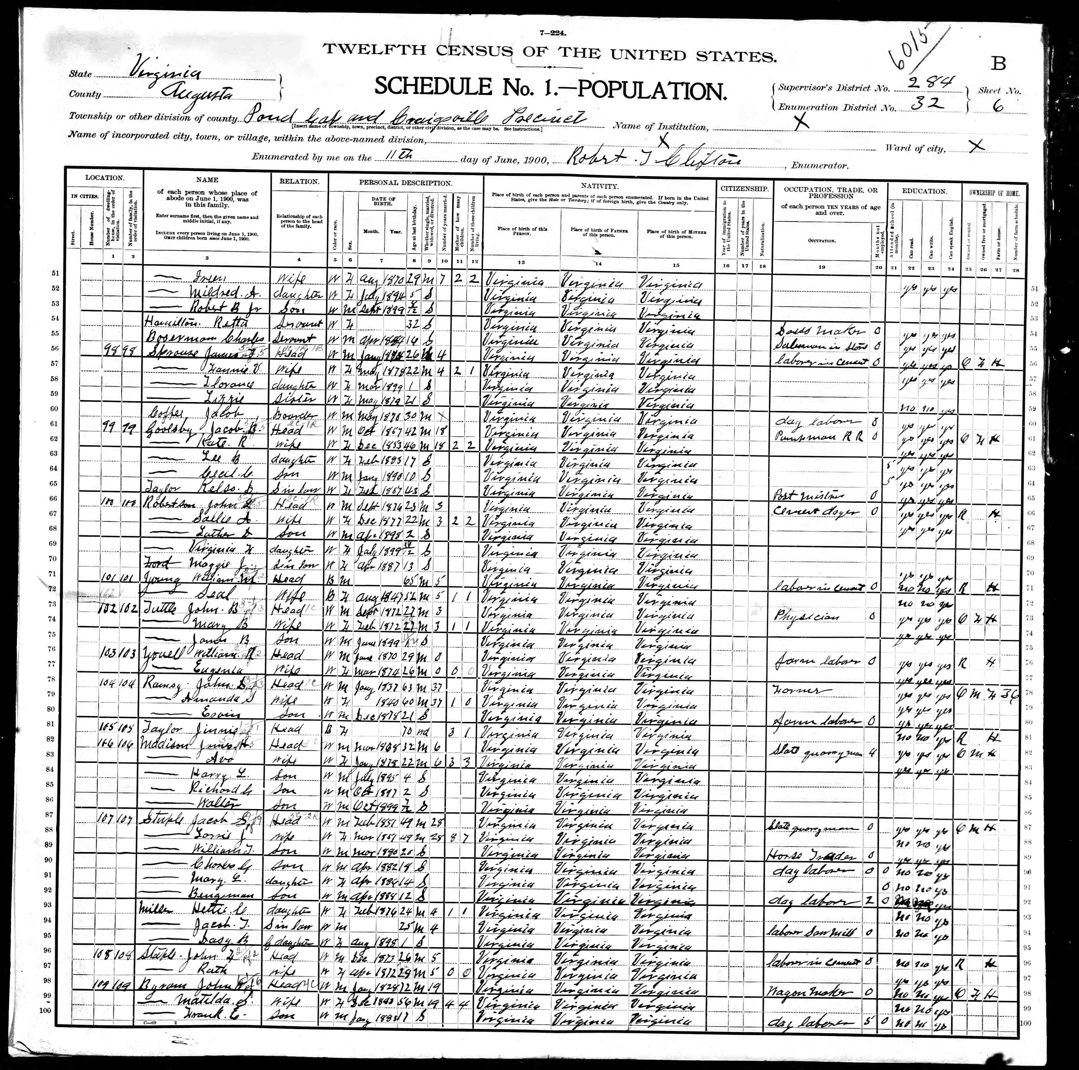 2. Census: James Thomas Sprouse and family, 11 Jun 1900, Pastures, Augusta County, Virginia, USA. 538
