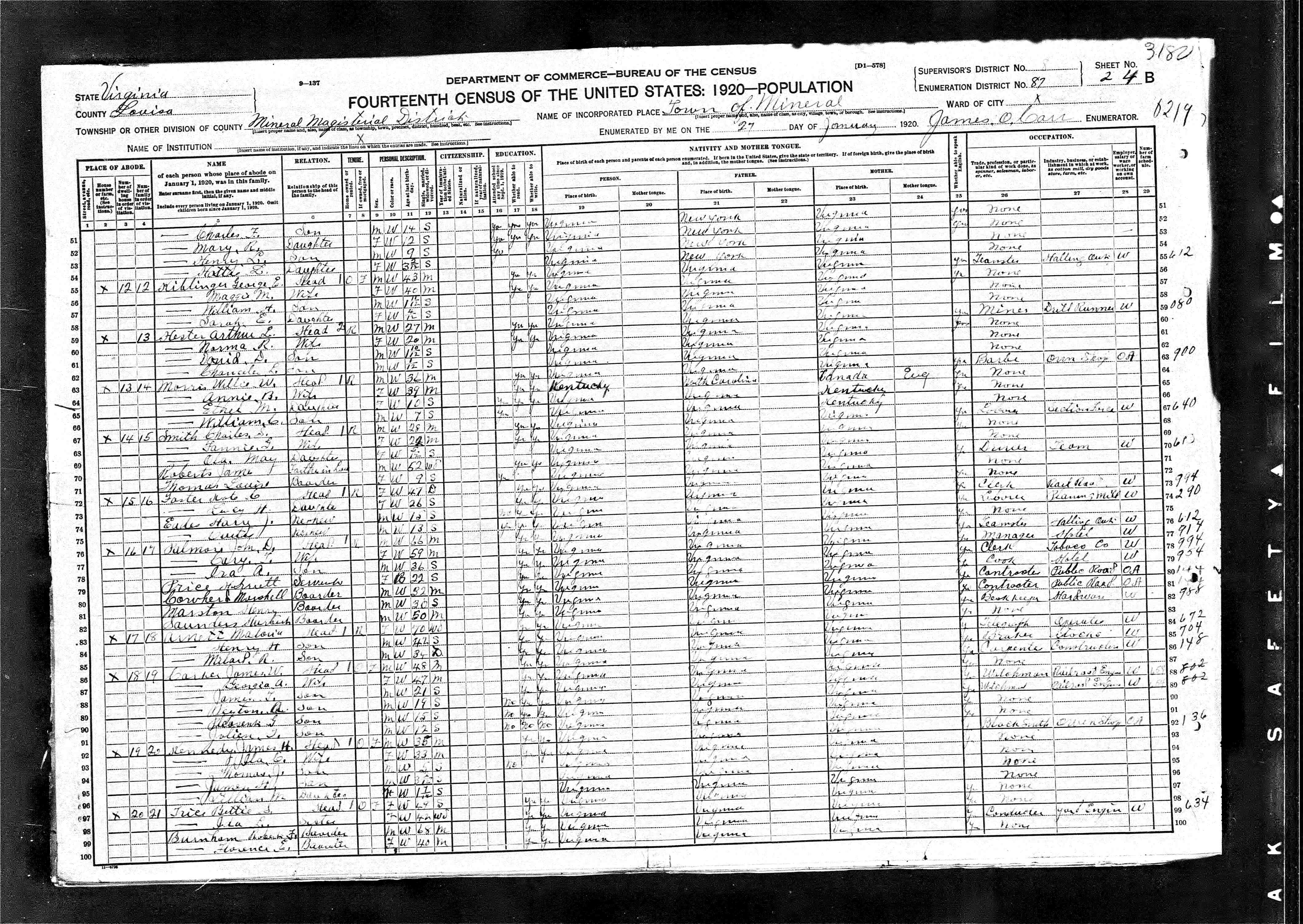3. Census: Linwood Carver and family, 13 Feb 1920, Charlottesville, Albemarle County, Virginia, USA. 527