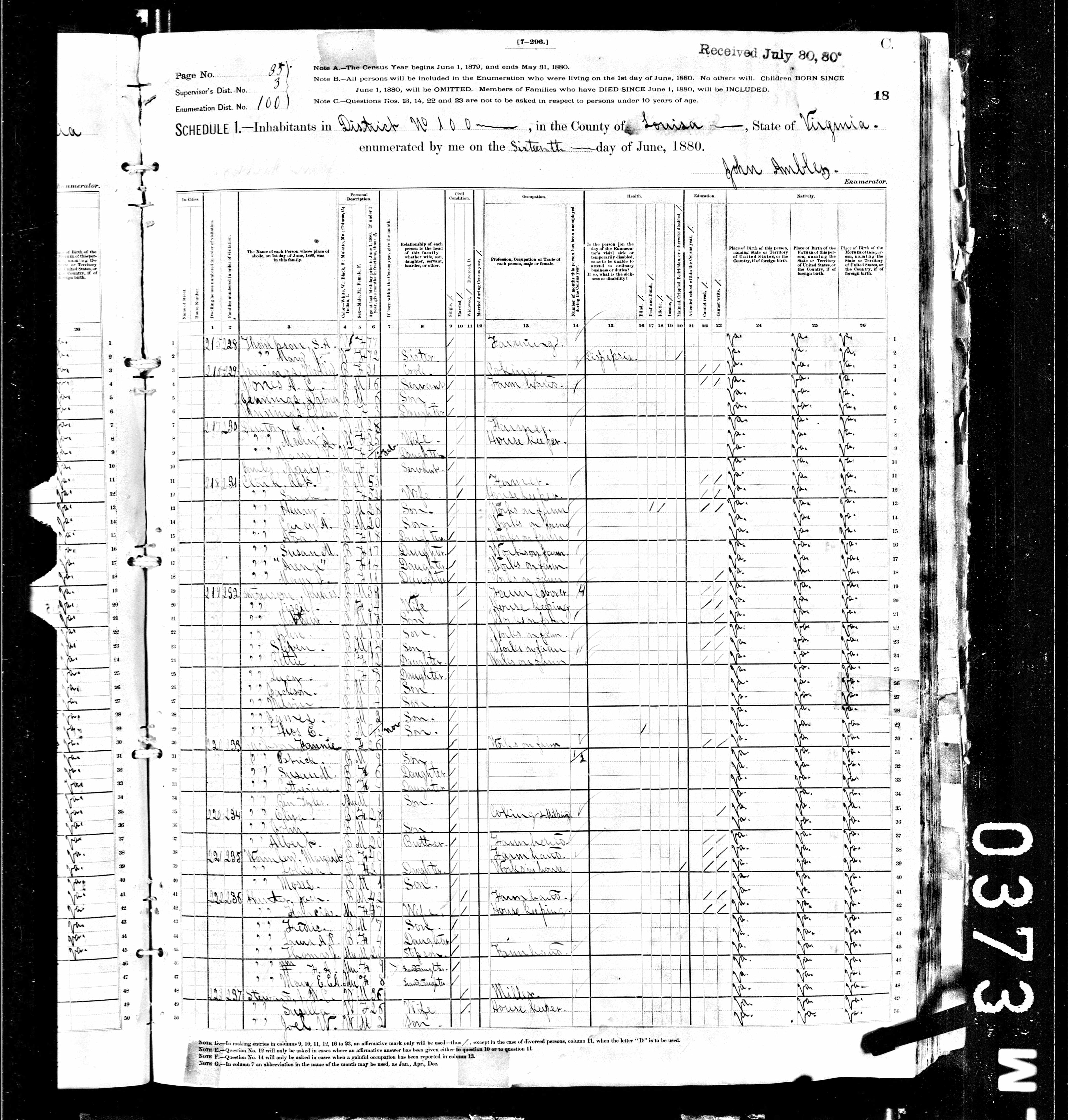 1. Census: John Thomas Sprouse and family, 7 Jun 1880, Pastures, Augusta County, Virginia, USA. 218