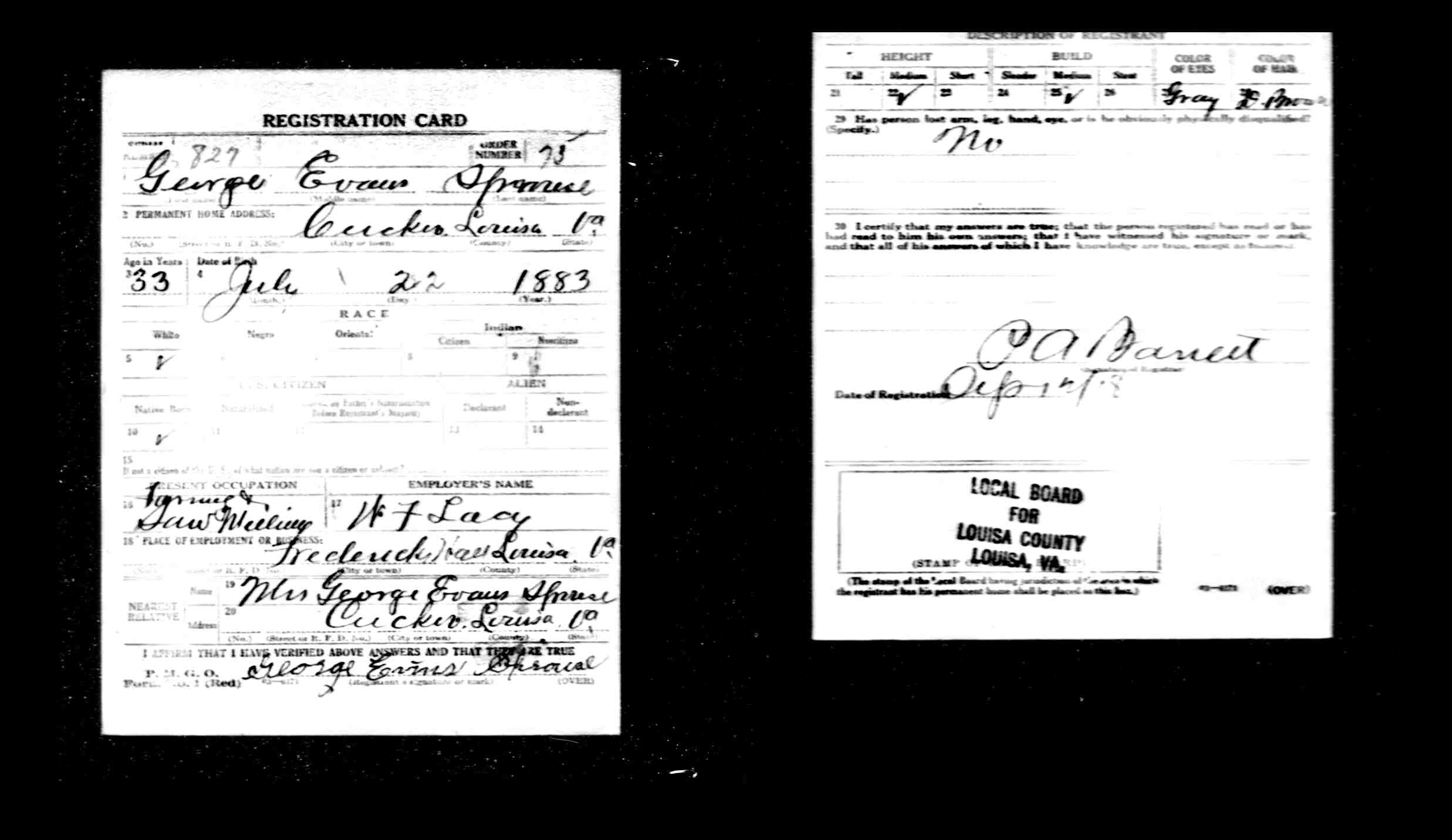 855. World War I Civilian Draft Registration Card, Gideon Sprouse.