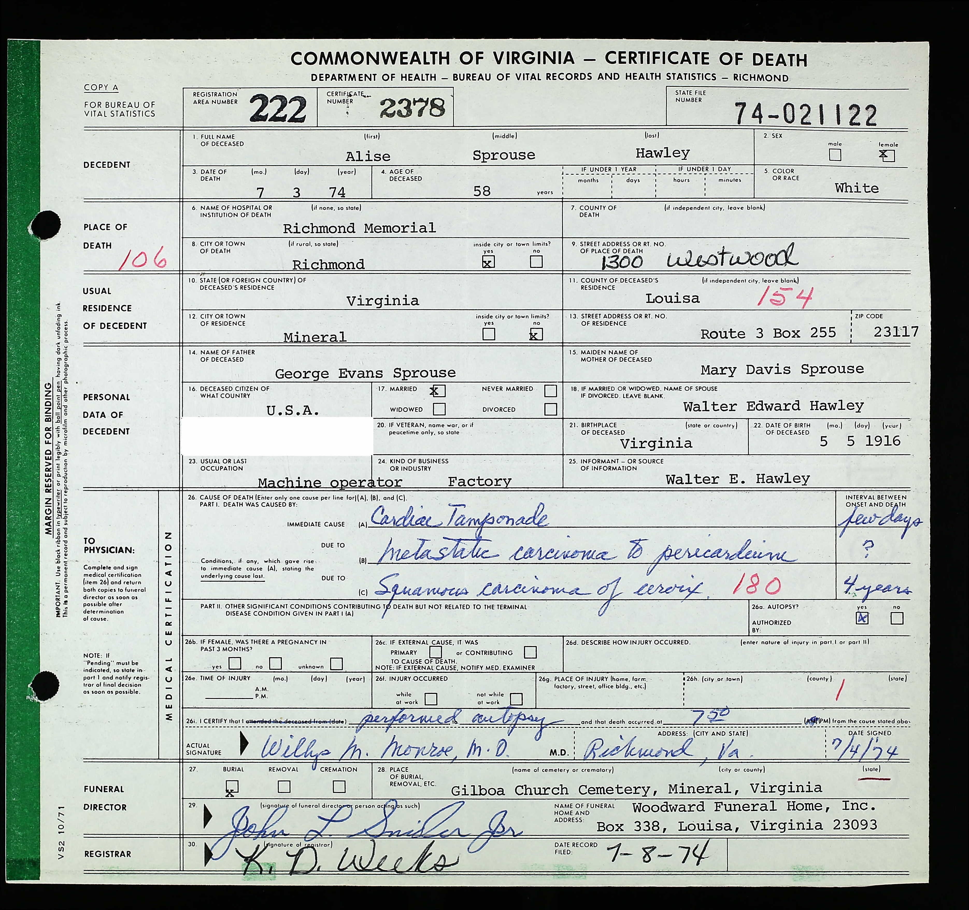 + 340 iii. Cora Alma Sprouse was born on 26 Jul 1898 in Mineral, Louisa County, Virginia, USA, died on 1 Feb 1970 in Mineral, Louisa County, Virginia, USA, at age 71, and was buried in Hillcrest Cemetery, Louisa, Louisa County, Virginia, USA.
