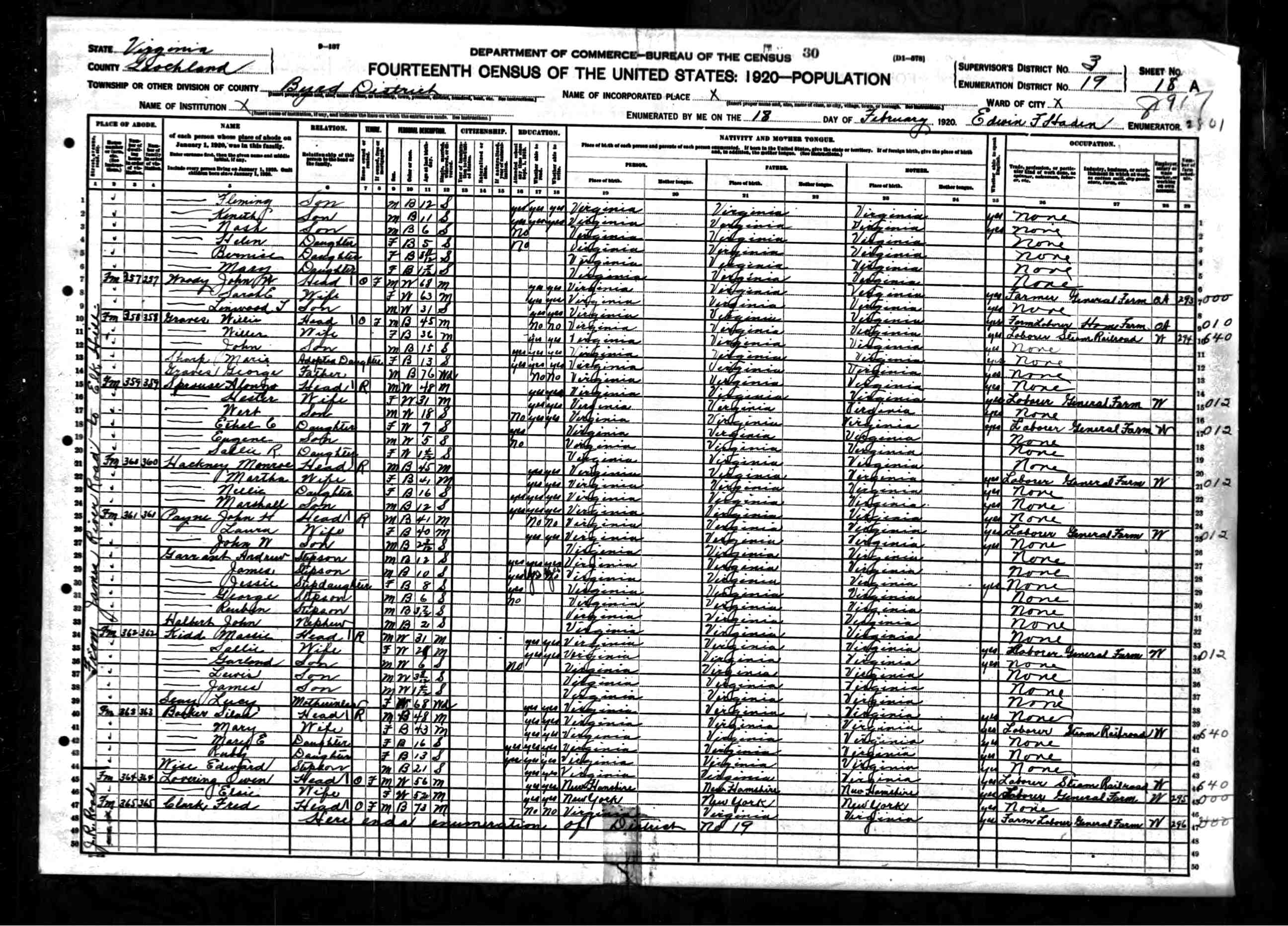 6. Census: Willie Sprouse and family, 15 Jan 1920, Mineral, Louisa County, Virginia, USA. 224