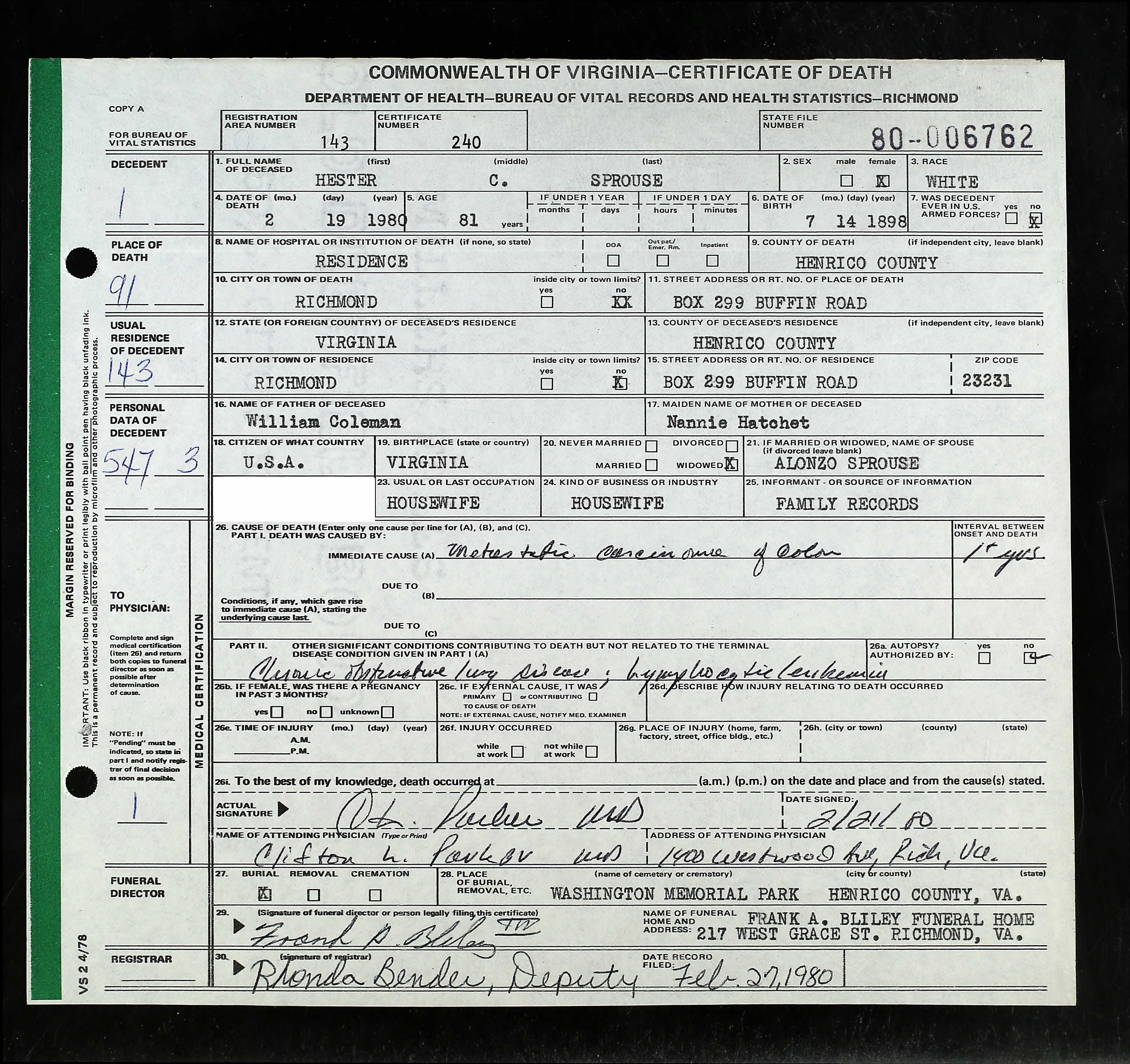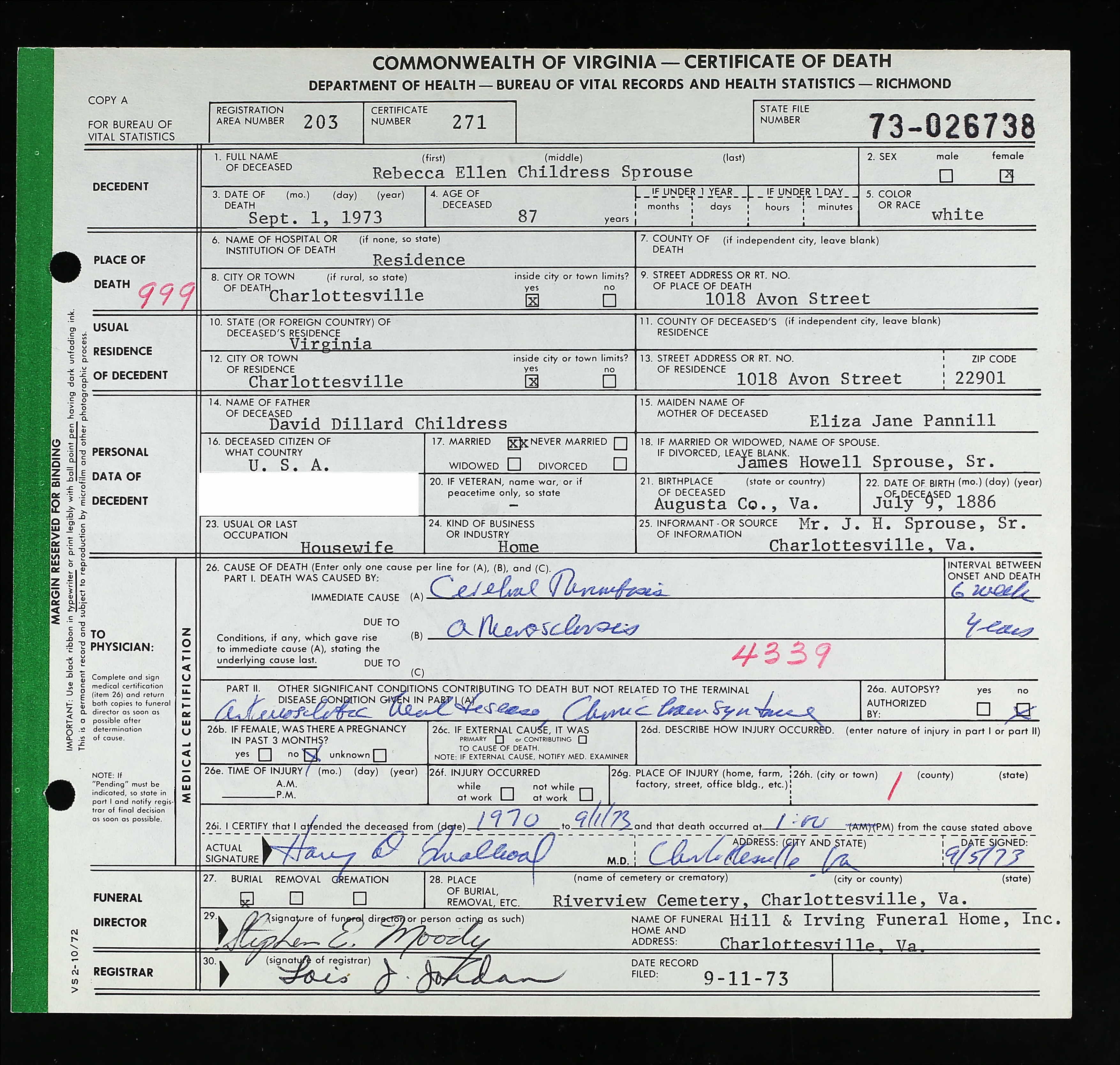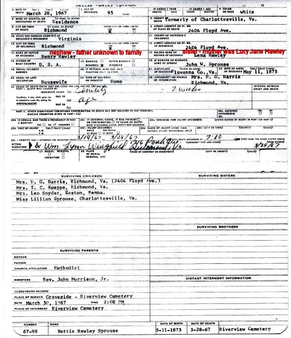 869. Death Certificate, Etta Louise Sprouse.