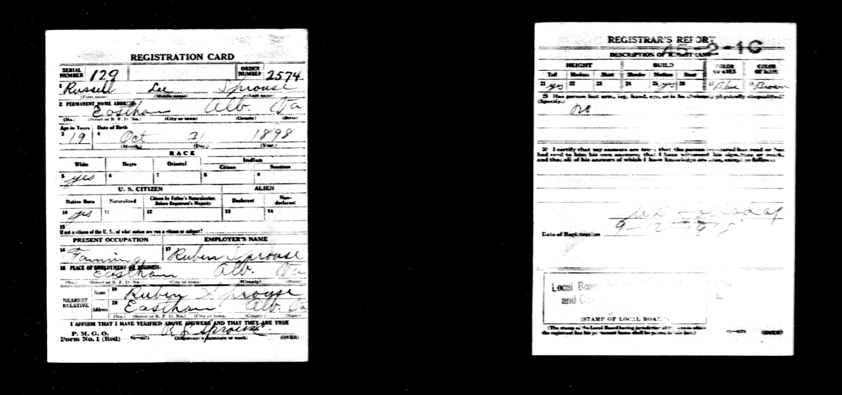 863. World War I Civilian Draft Registration Card, Lenwood Sprouse.