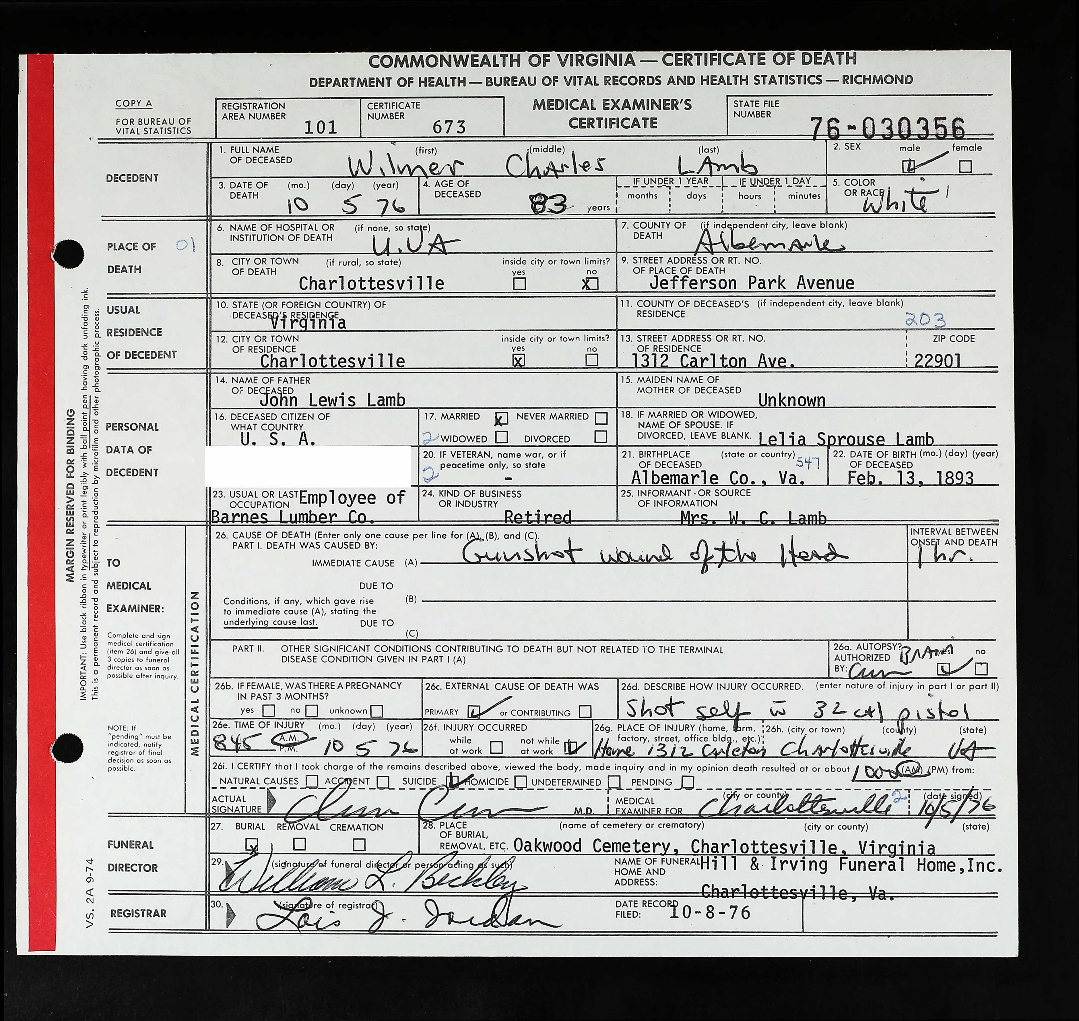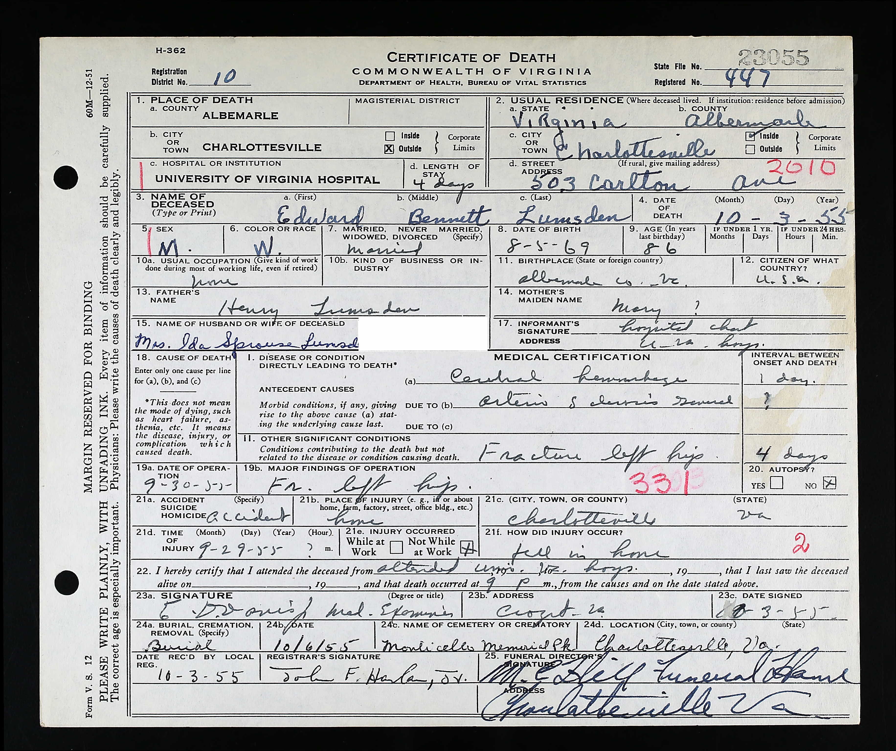 860. Death Certificate, Diuguid Funeral Home Burial Record.