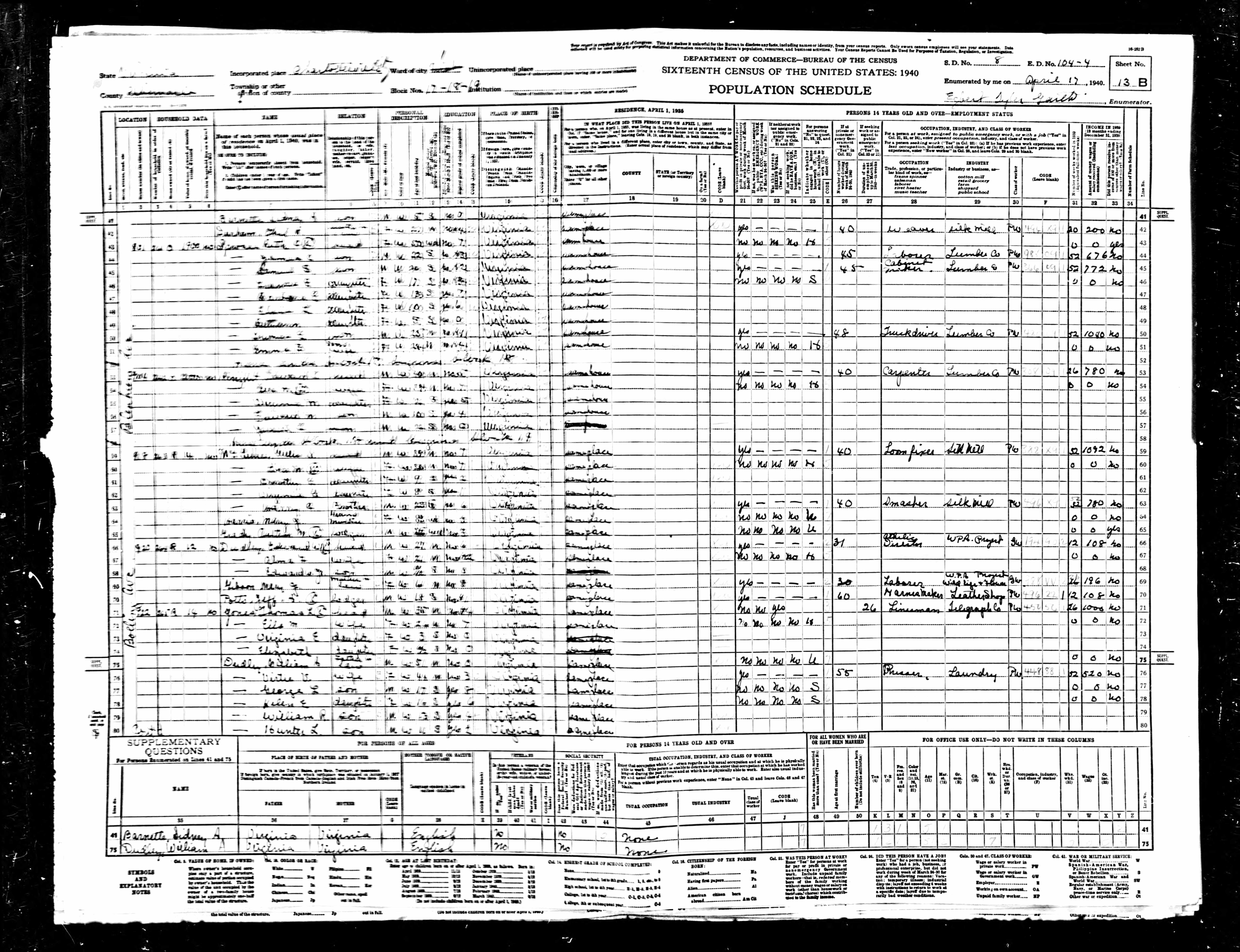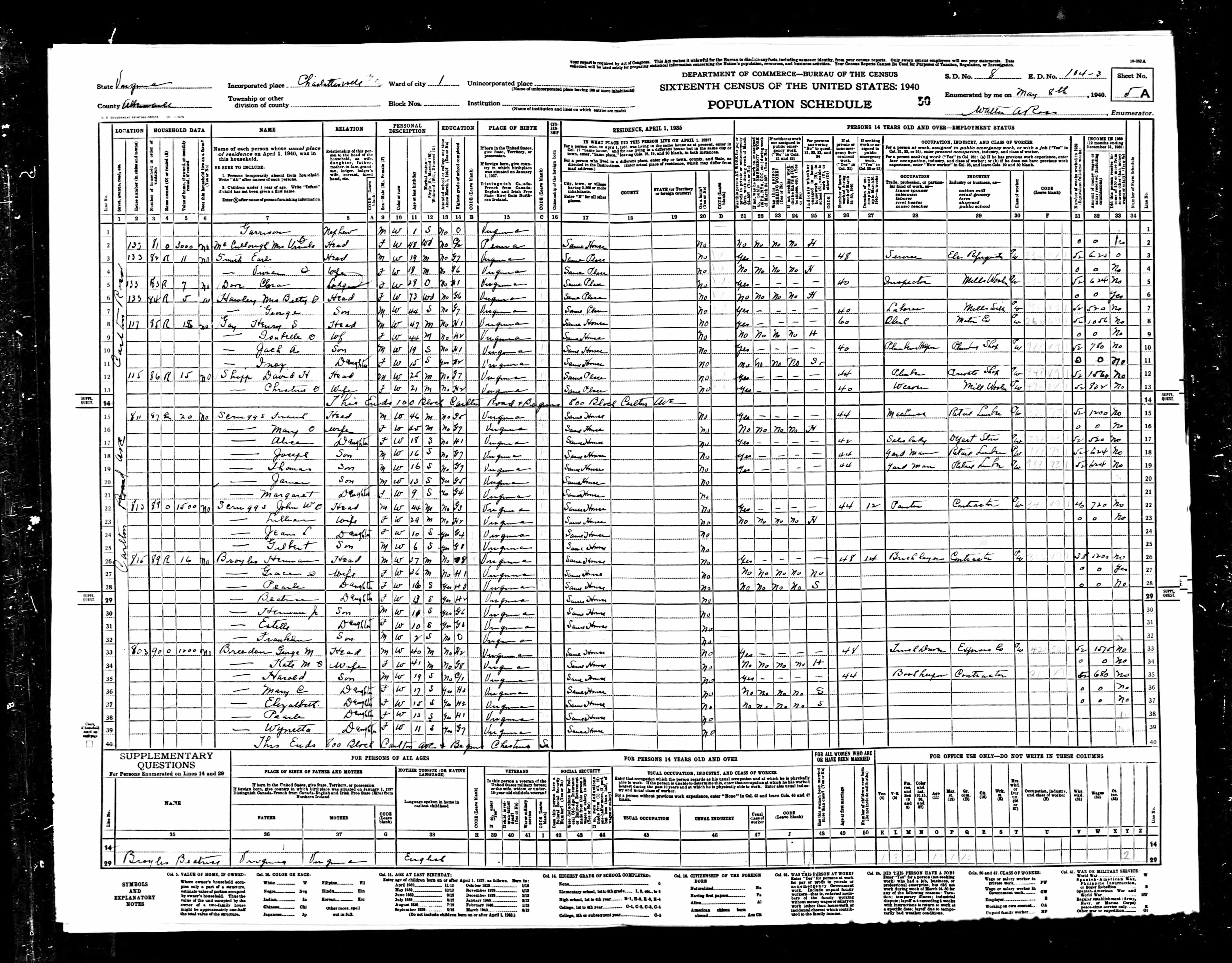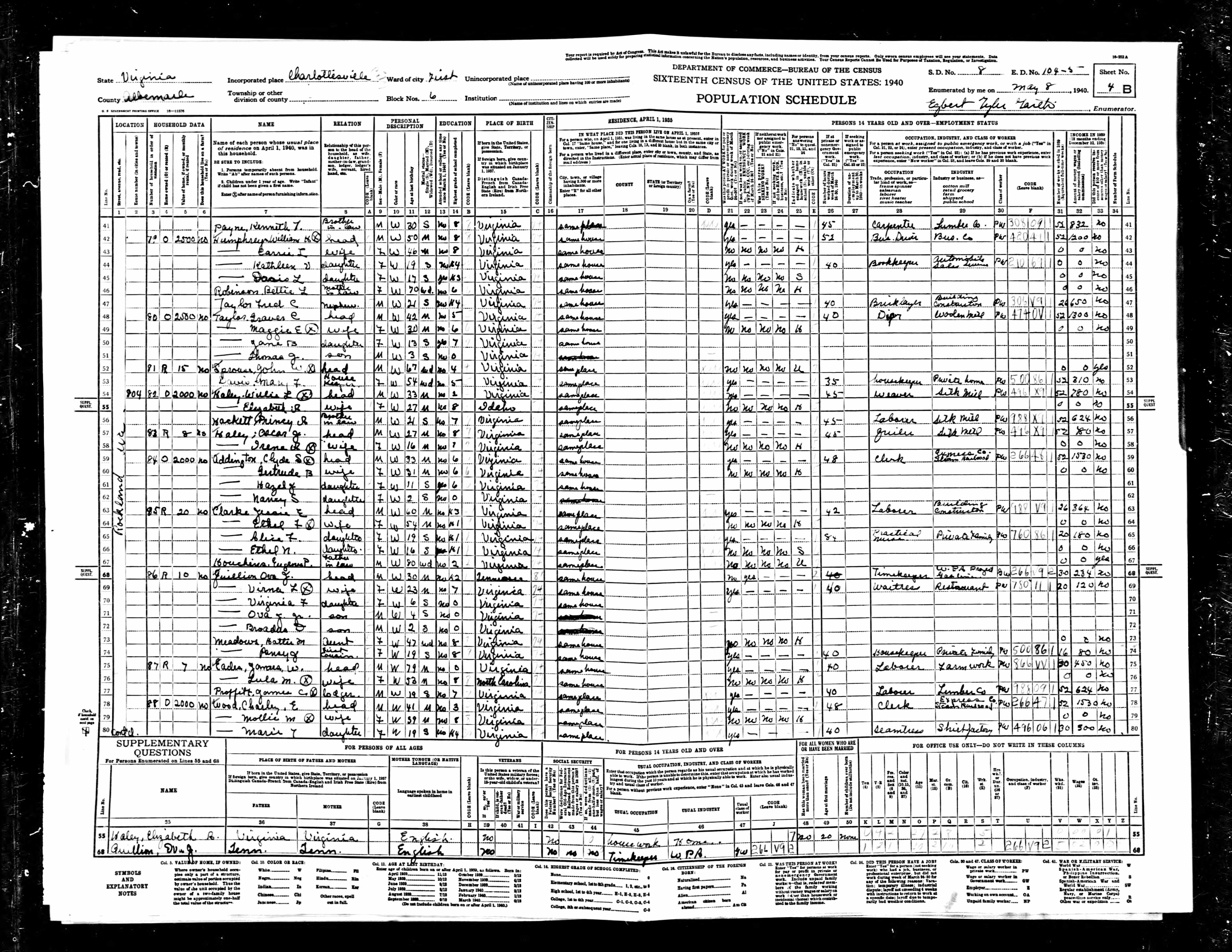 881. 1940 Virginia Census, Charlottesville City, Charlottesville ED 104-3, Sht 2B, Image 4 Roll T627.