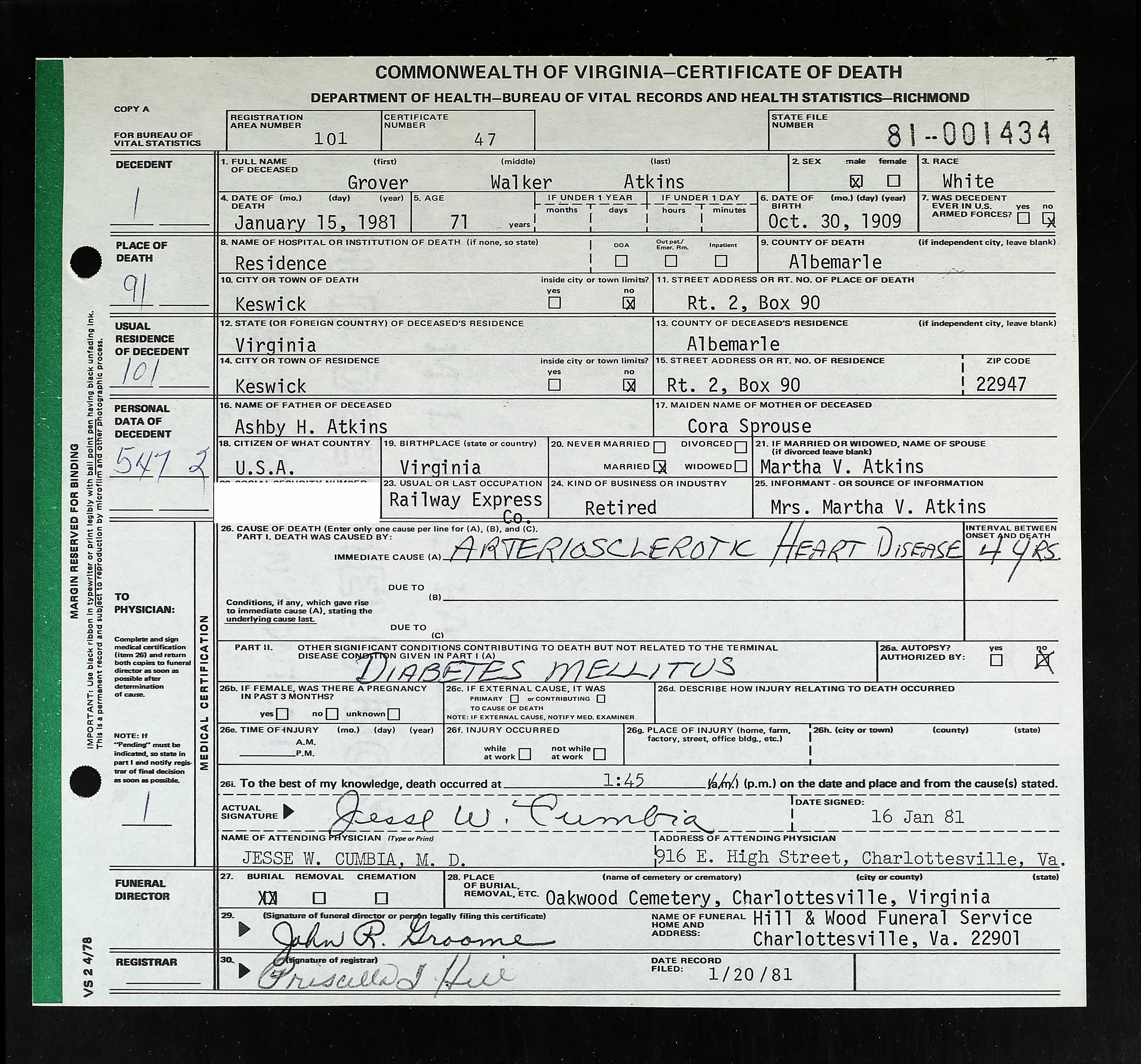 + 315 ii. Warren E. Carver was born on 3 Oct 1912 in Charlottesville, Albemarle County, Virginia, USA and died on 13 Mar 1990 in Albemarle County, Virginia, USA, at age 77.