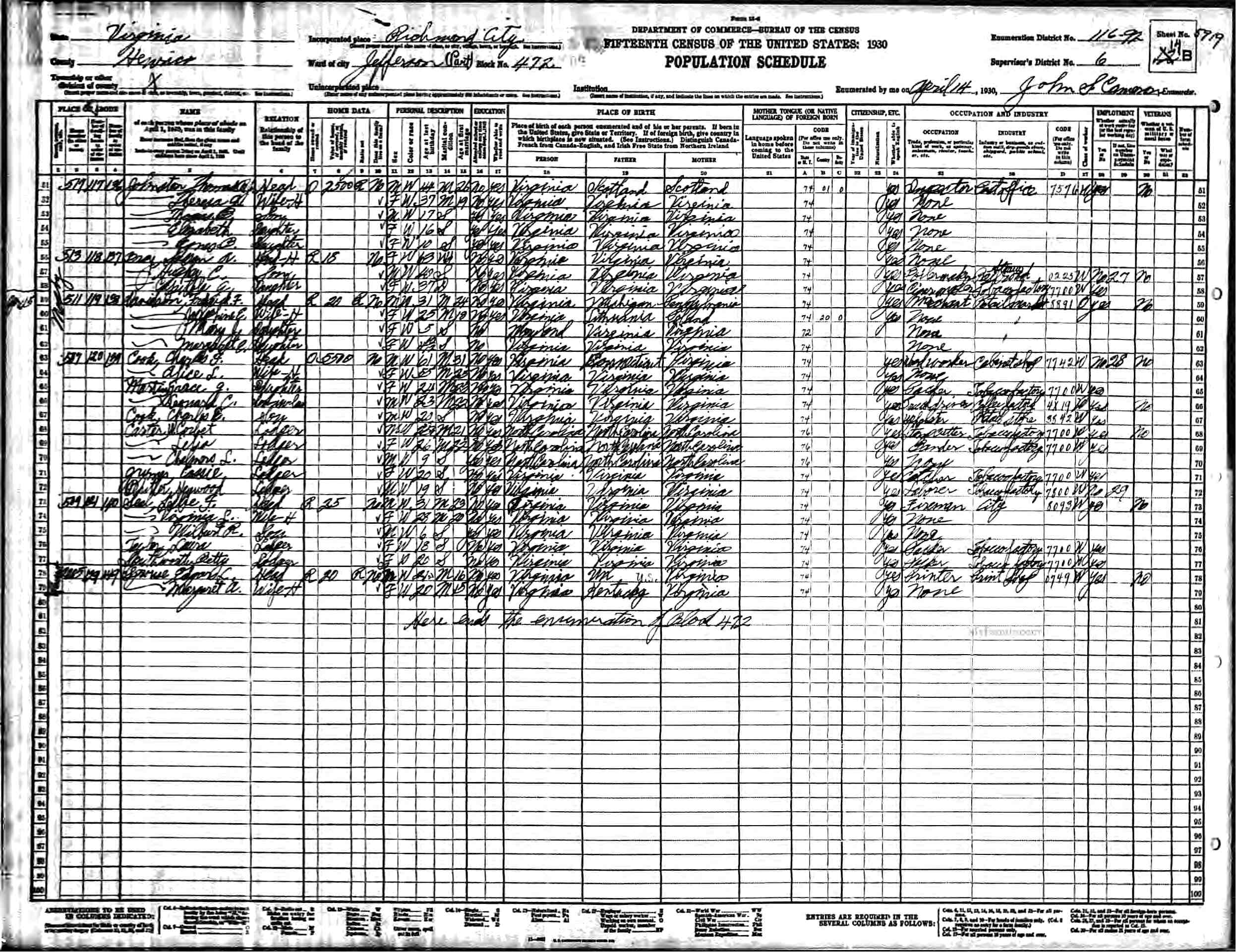 2. Census: Linwood Carver and family, 13 Feb 1920, Charlottesville, Albemarle County, Virginia, USA. 527