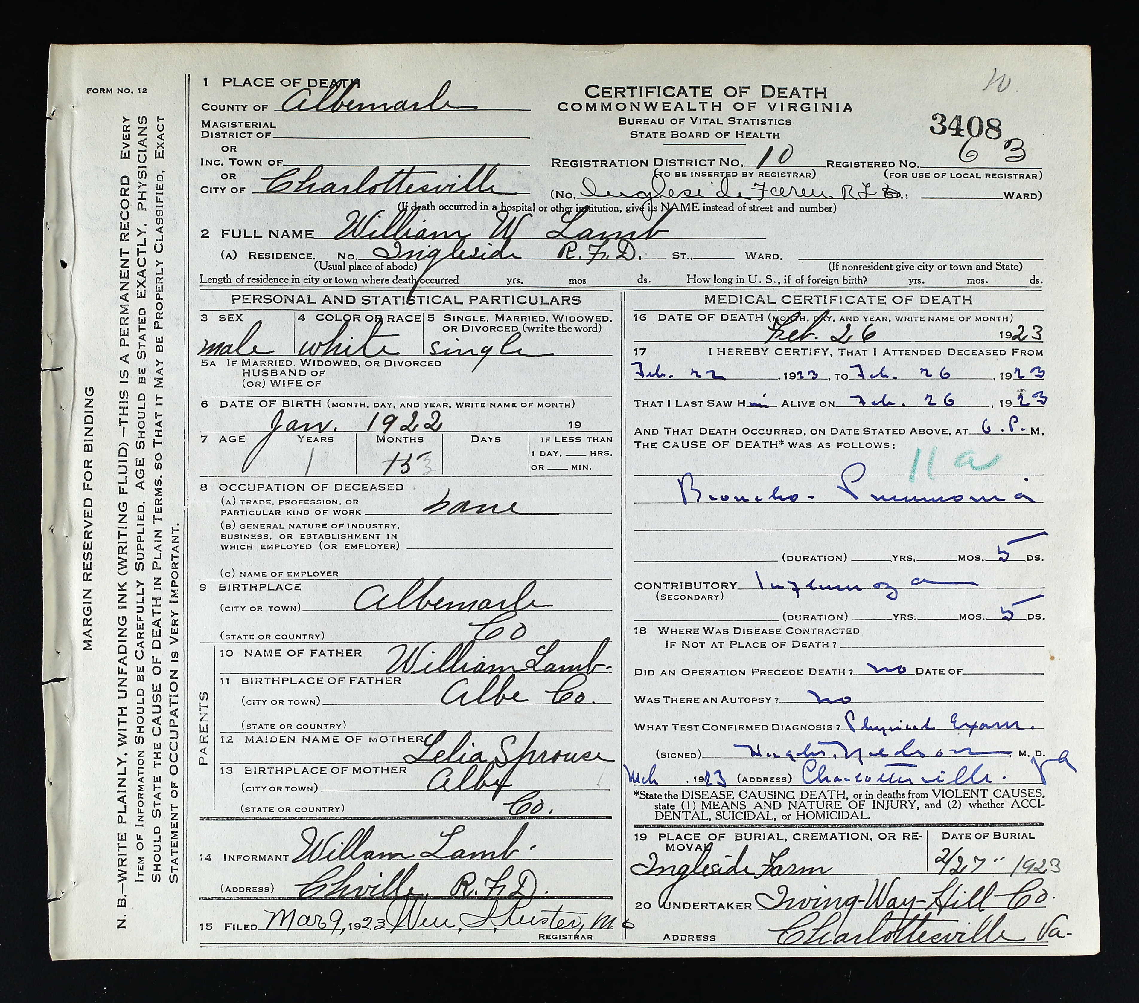3. Legal: WWI Draft registration, 10 Sep 1918, Charlottesville, Albemarle County, Virginia, USA. 526