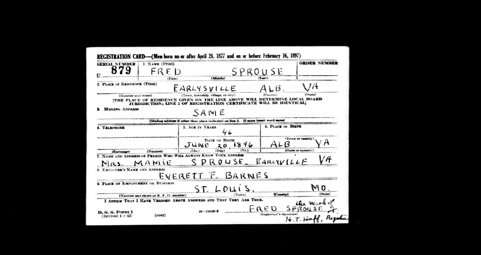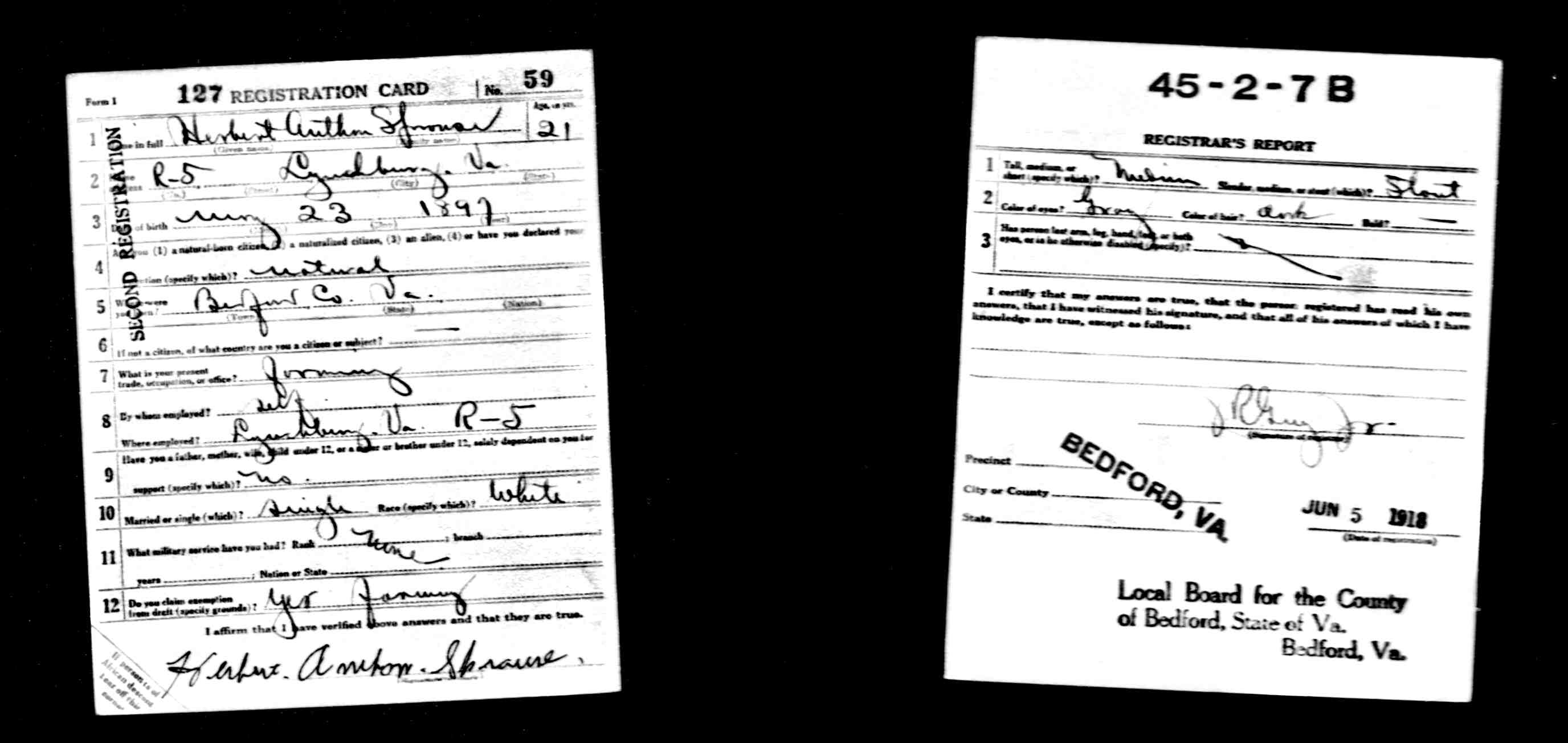 848. World War I Civilian Draft Registration Card, Herbert Author Sprouse.