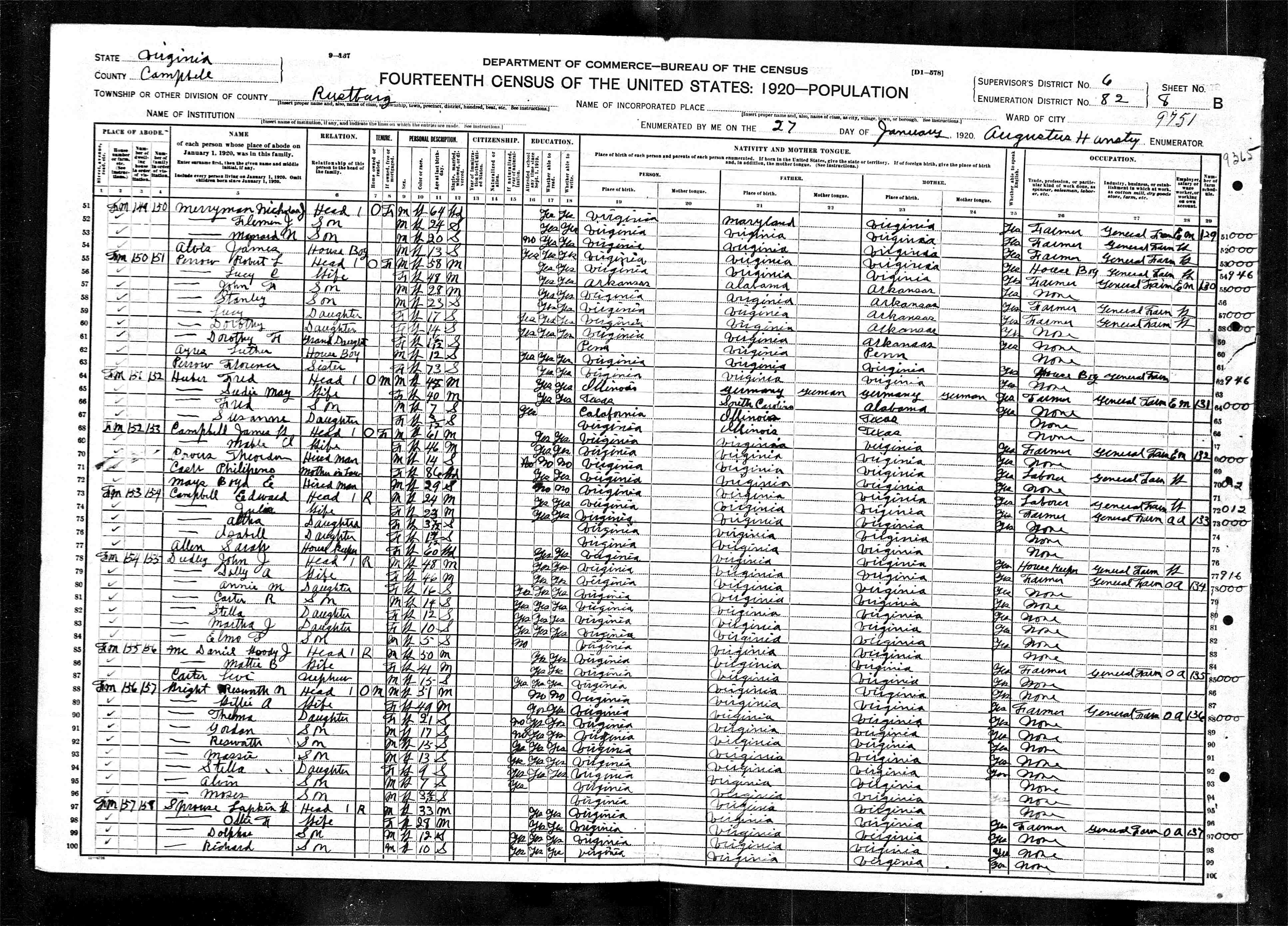 840. 1920 Virginia Census, Campbell, Rustburg, ED 82, Sht 8B.