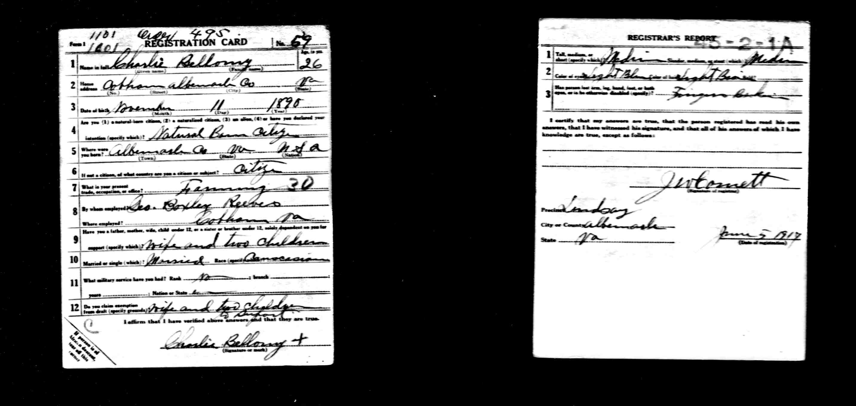 875. World War I Civilian Draft Registration Card, Charlie Bellomy.