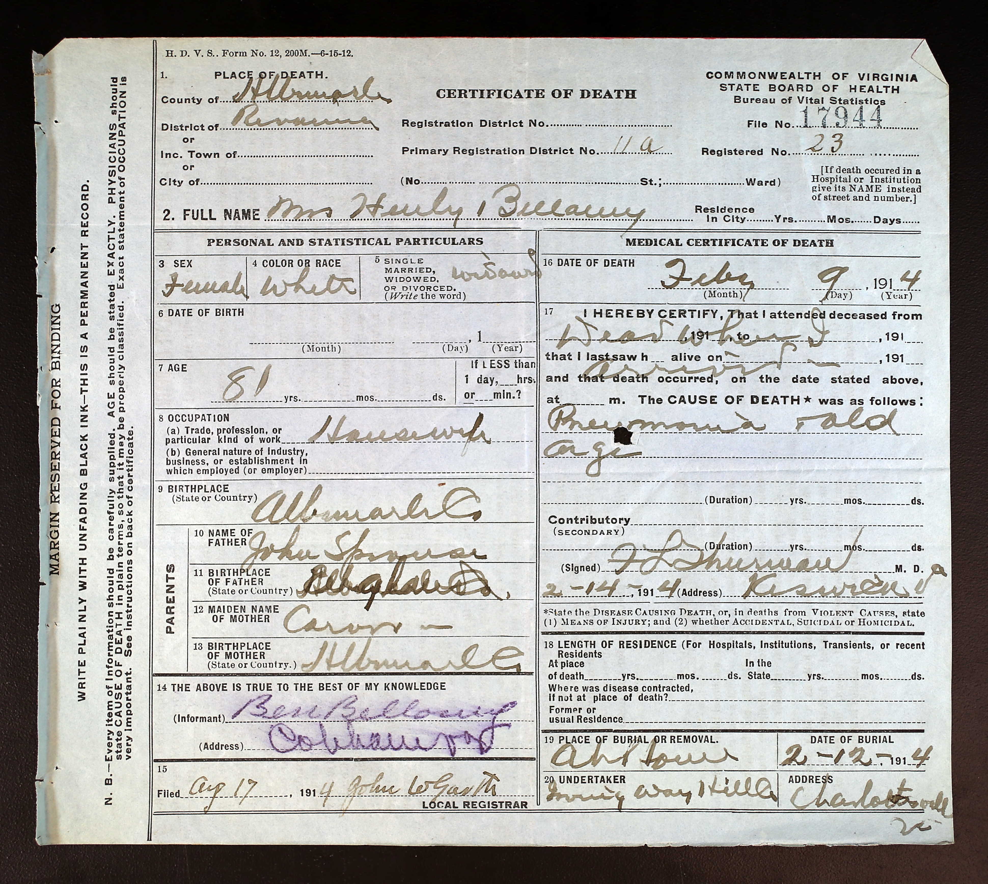 874. Albemarle County, Virginia Birth Records, 1890-96 [Ancestry.com Database], Charles Bellamy, Dec 1891, White, Male, Father: Not Legible, Mother: Nannie, p. 624.